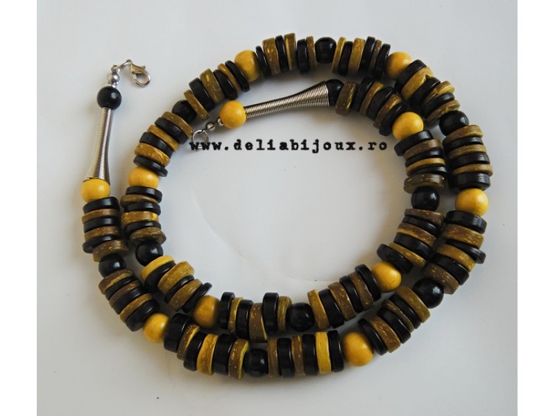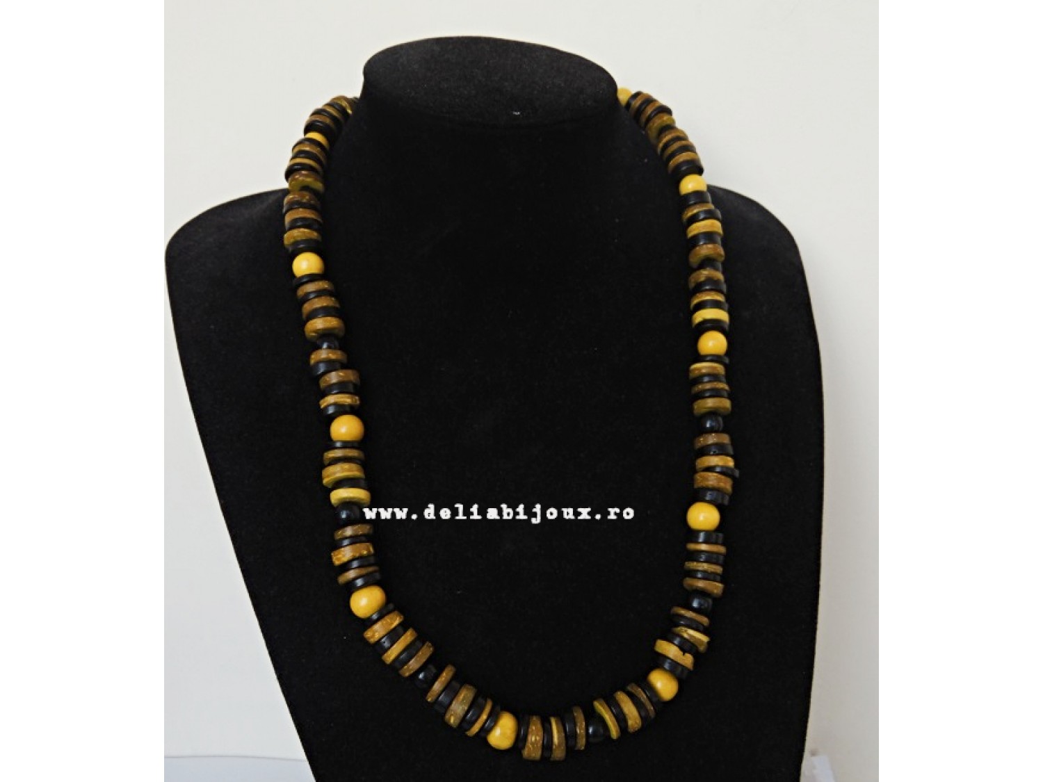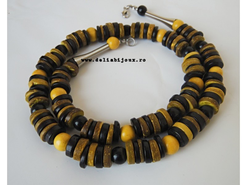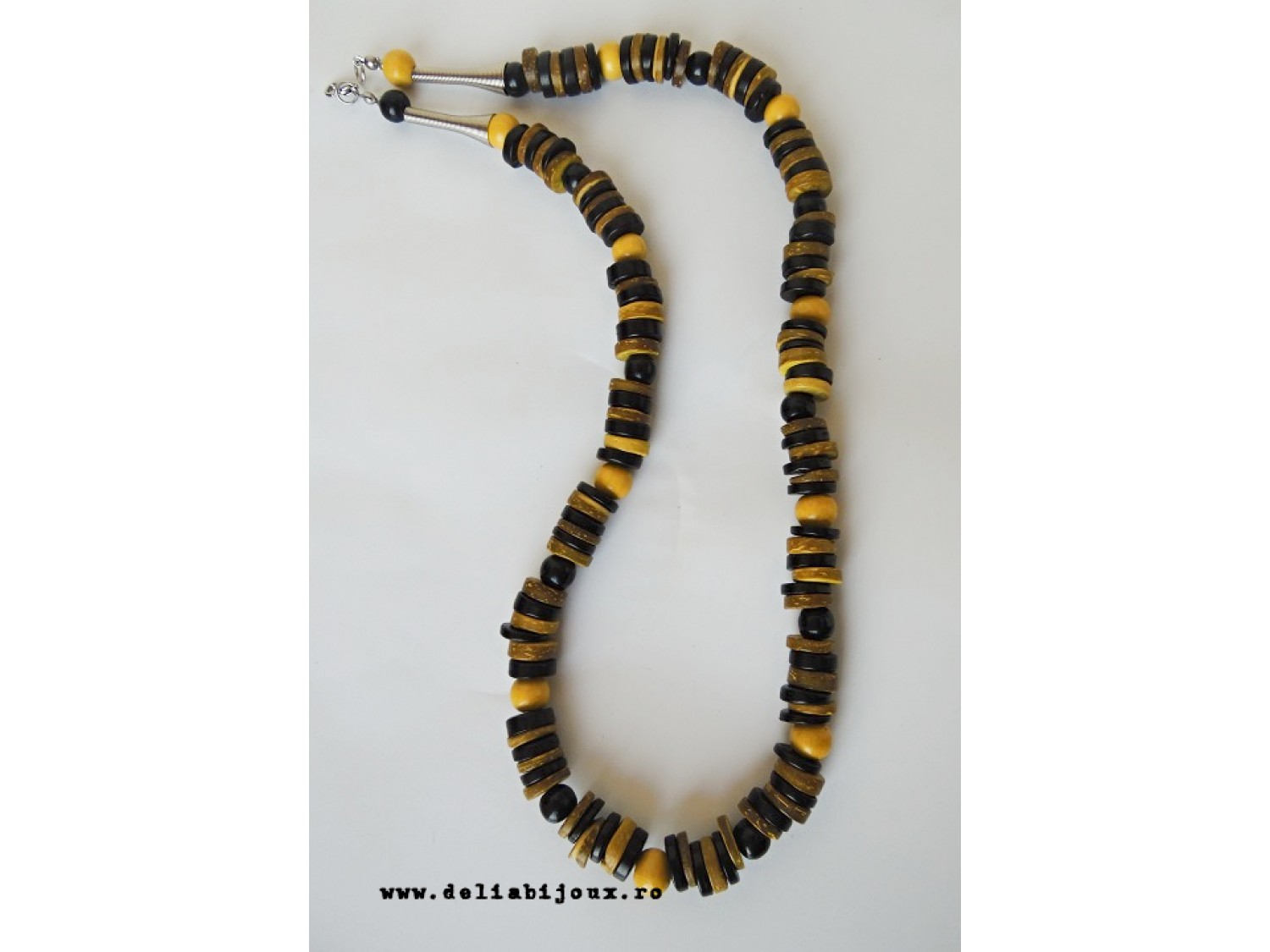 Colier realizat din margele de lemn (8 mm si 10 mm) si discuri de lemn de cocos (12 mm - nu sunt identice), bile de inox (3 mm) si elemente metalice argintii. Inchidere tip lobster.