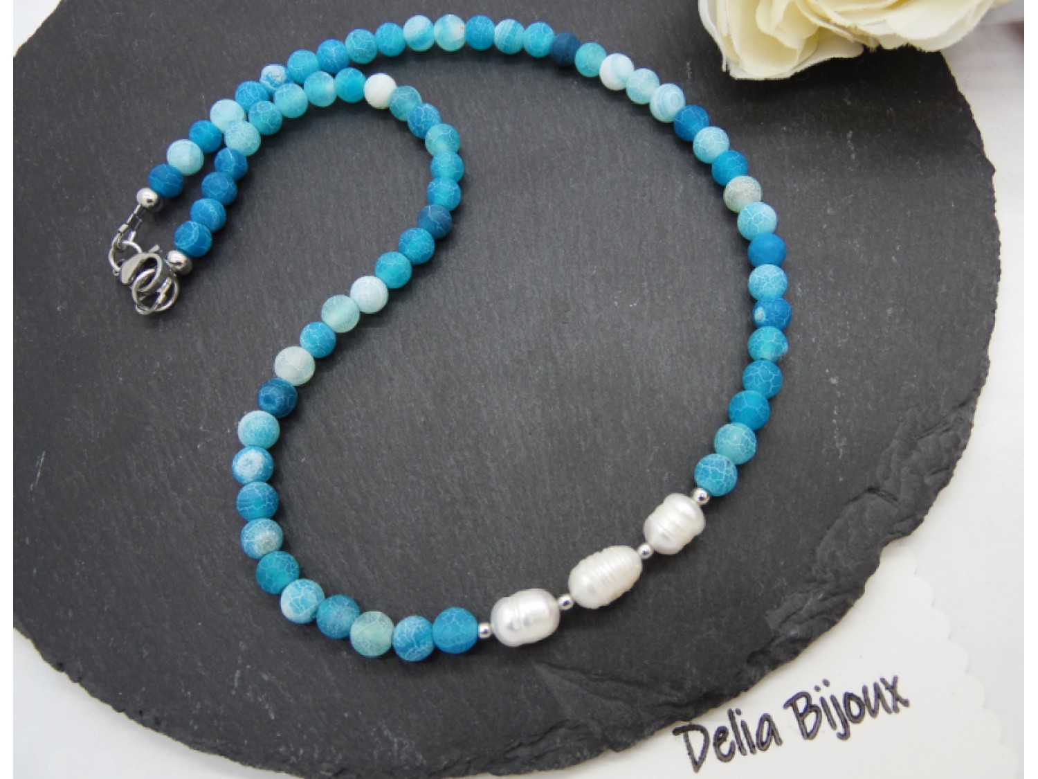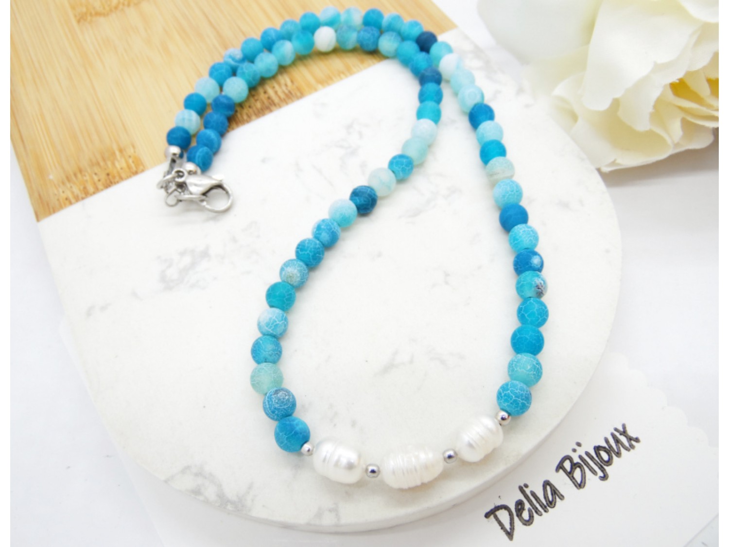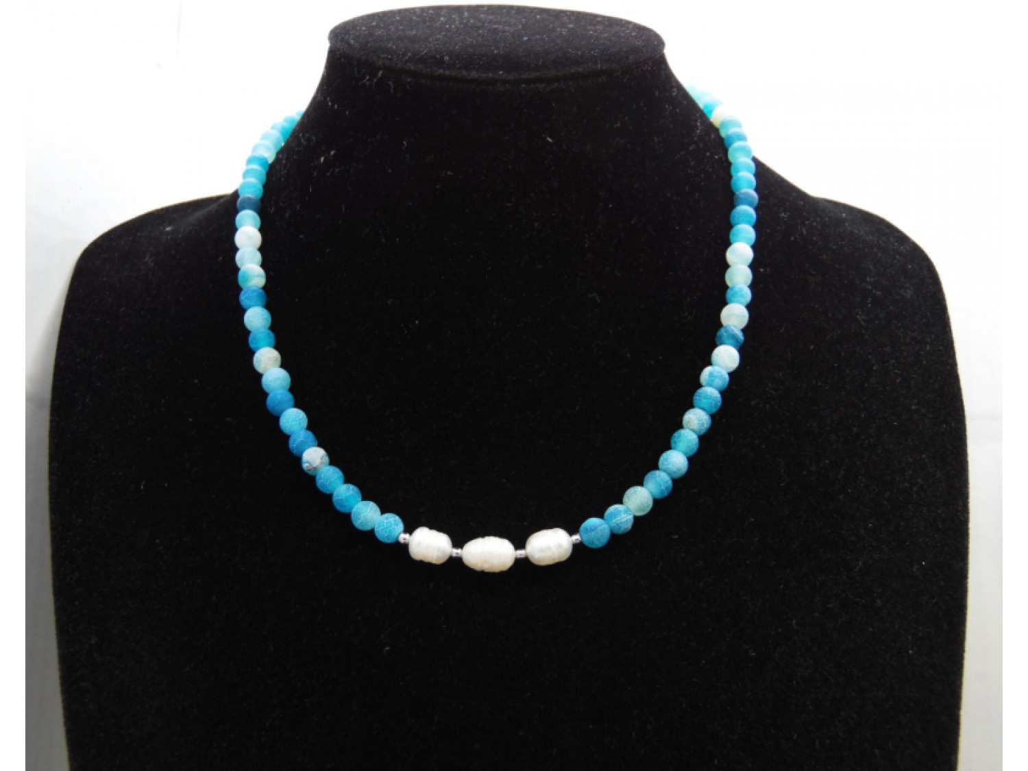 Adăugați o notă de rafinament și eleganță garderobei dumneavoastră cu acest colier handmade unic, perfect pentru ocazii speciale sau pentru a adăuga un plus de strălucire ținutelor zilnice. Colierul, care se așază delicat la baza gâtului si pune în valoare linia gâtului și decolteul, este confecționat din pietre semiprețioase de agate frozen albastre, cu un efect mat și înghețat, care adaugă profunzime și un strop de mister și este înfrumusețat cu trei perle naturale de cultură plasate elegant în mijloc.