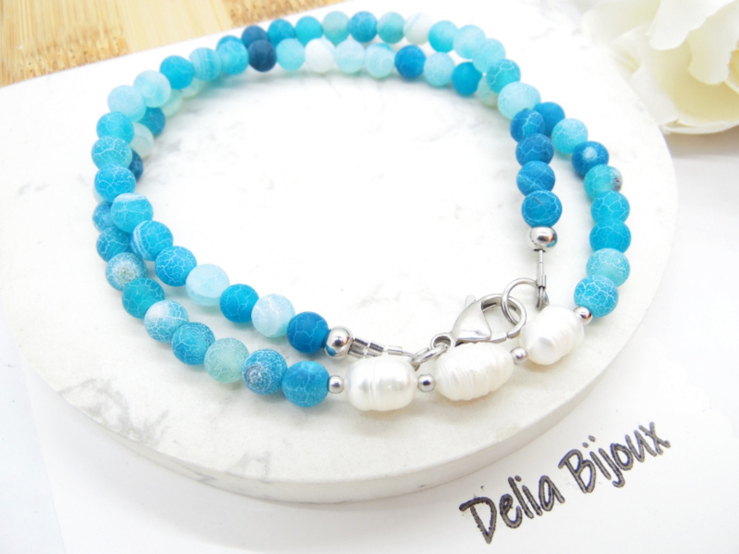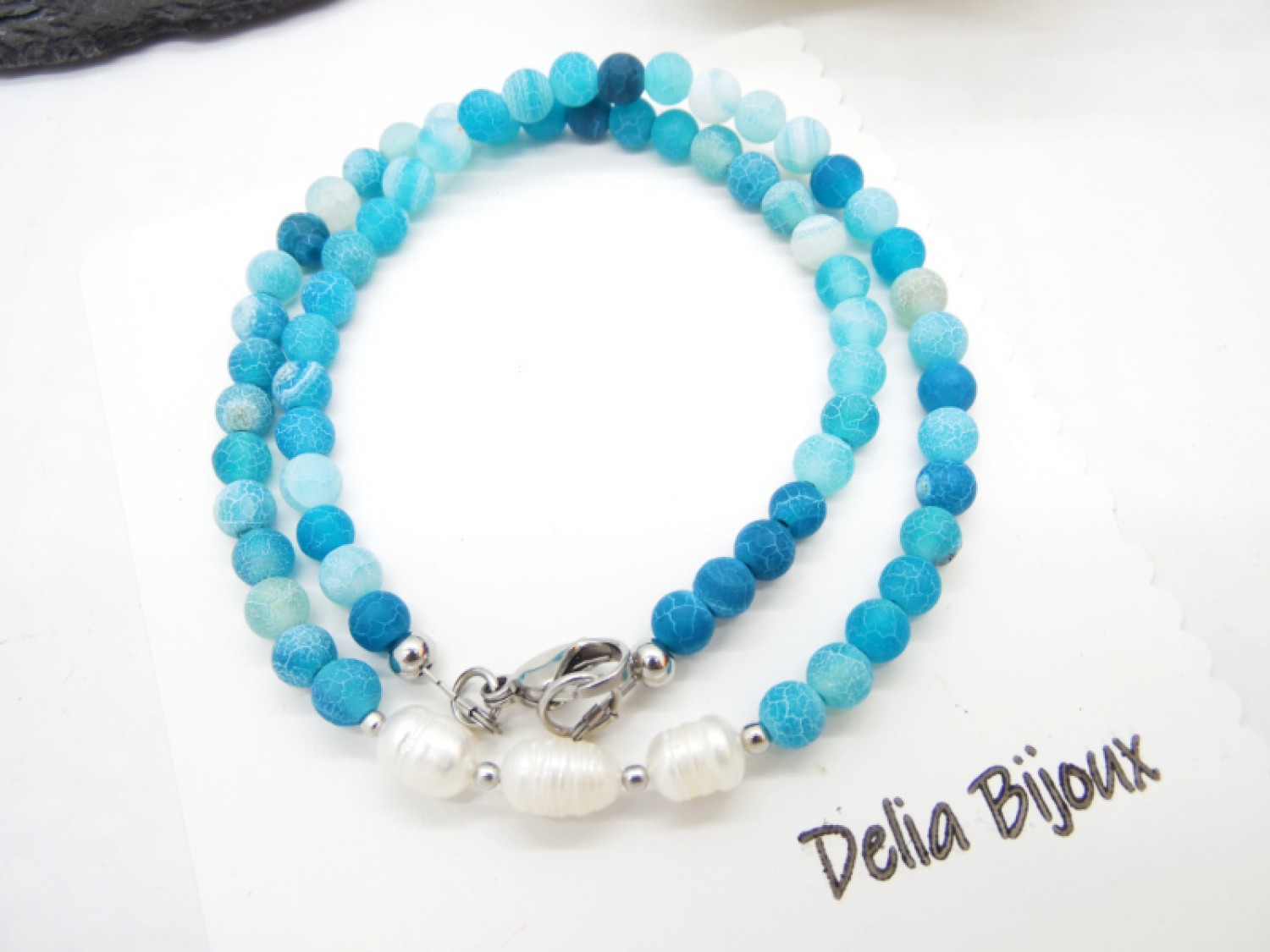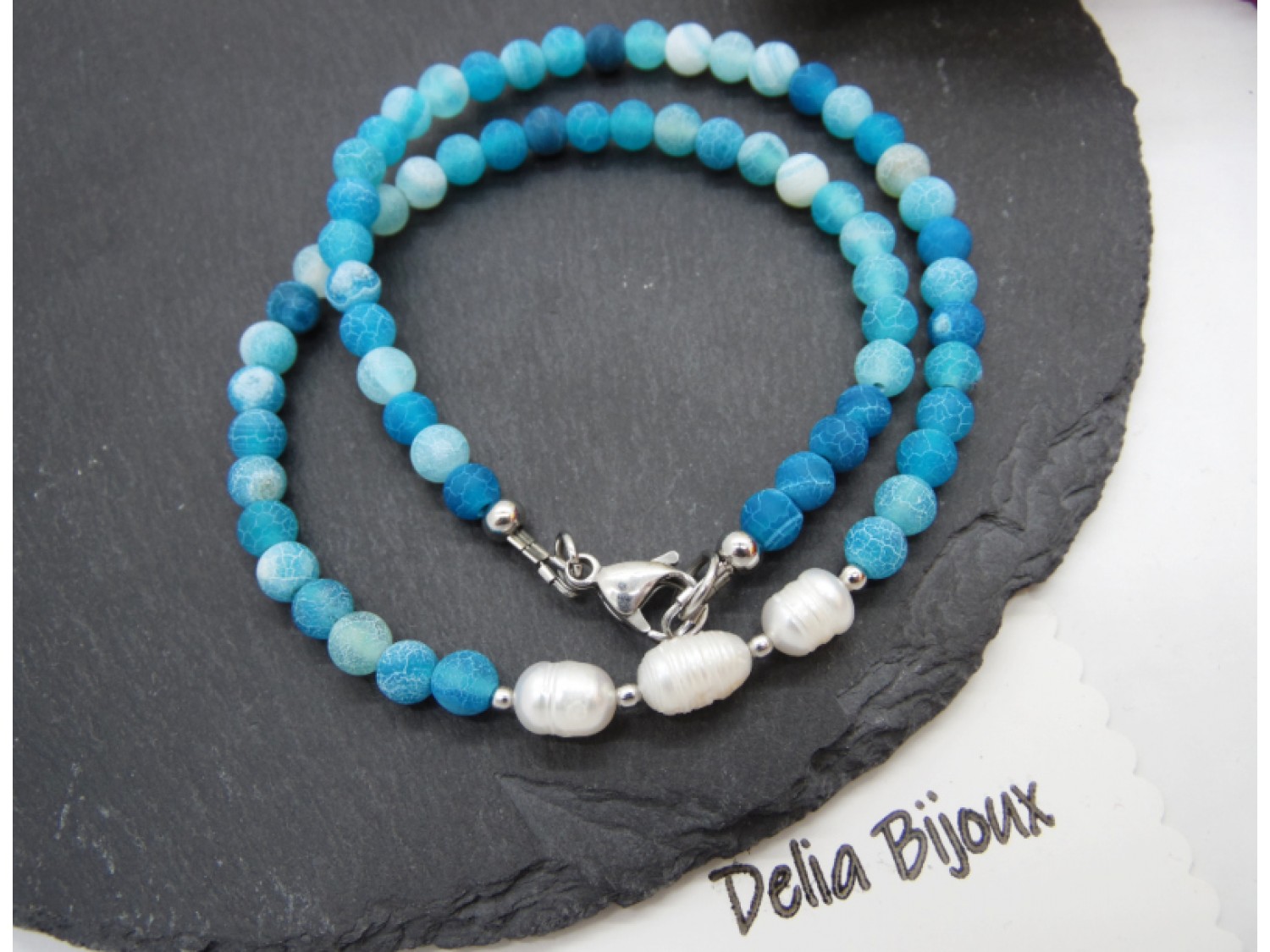 Adăugați o notă de rafinament și eleganță garderobei dumneavoastră cu acest colier handmade unic, perfect pentru ocazii speciale sau pentru a adăuga un plus de strălucire ținutelor zilnice. Colierul, care se așază delicat la baza gâtului si pune în valoare linia gâtului și decolteul, este confecționat din pietre semiprețioase de agate frozen albastre, cu un efect mat și înghețat, care adaugă profunzime și un strop de mister și este înfrumusețat cu trei perle naturale de cultură plasate elegant în mijloc.
