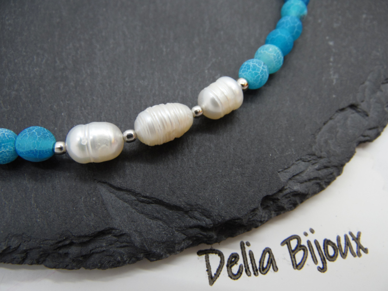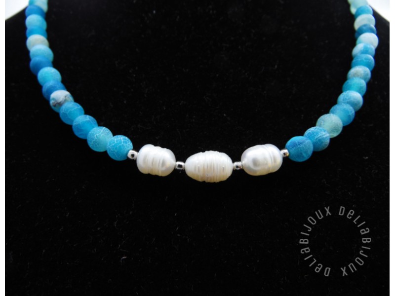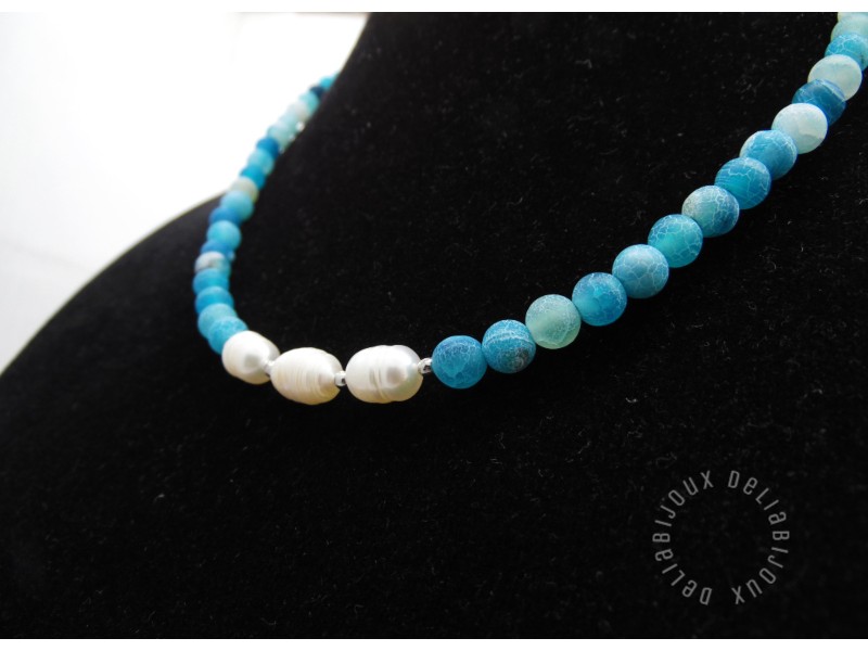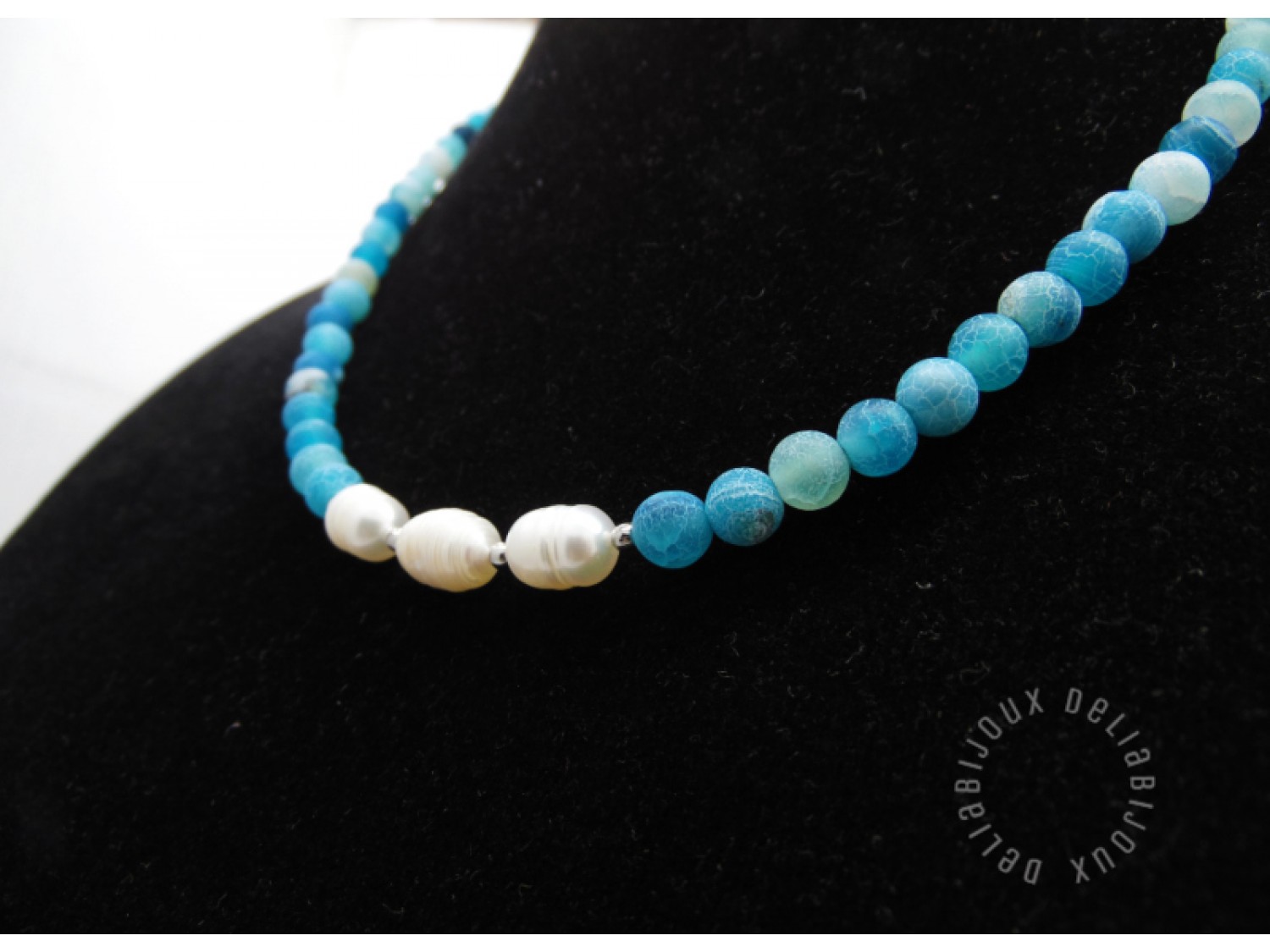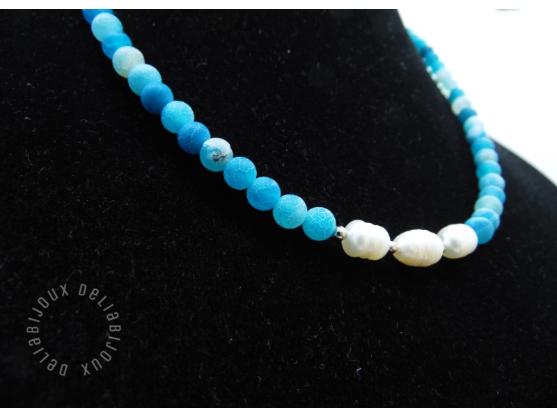 Colier handmade, la baza gatului, realizat din agate frozen albastre (6 mm), perle de cultura naturale- forma neregulata (8~11 mm), bile otel inoxidabil (2 mm, 5 mm), elemente metalice din otel inoxidabil. Inchidere tip lobster din otel inoxidabil.