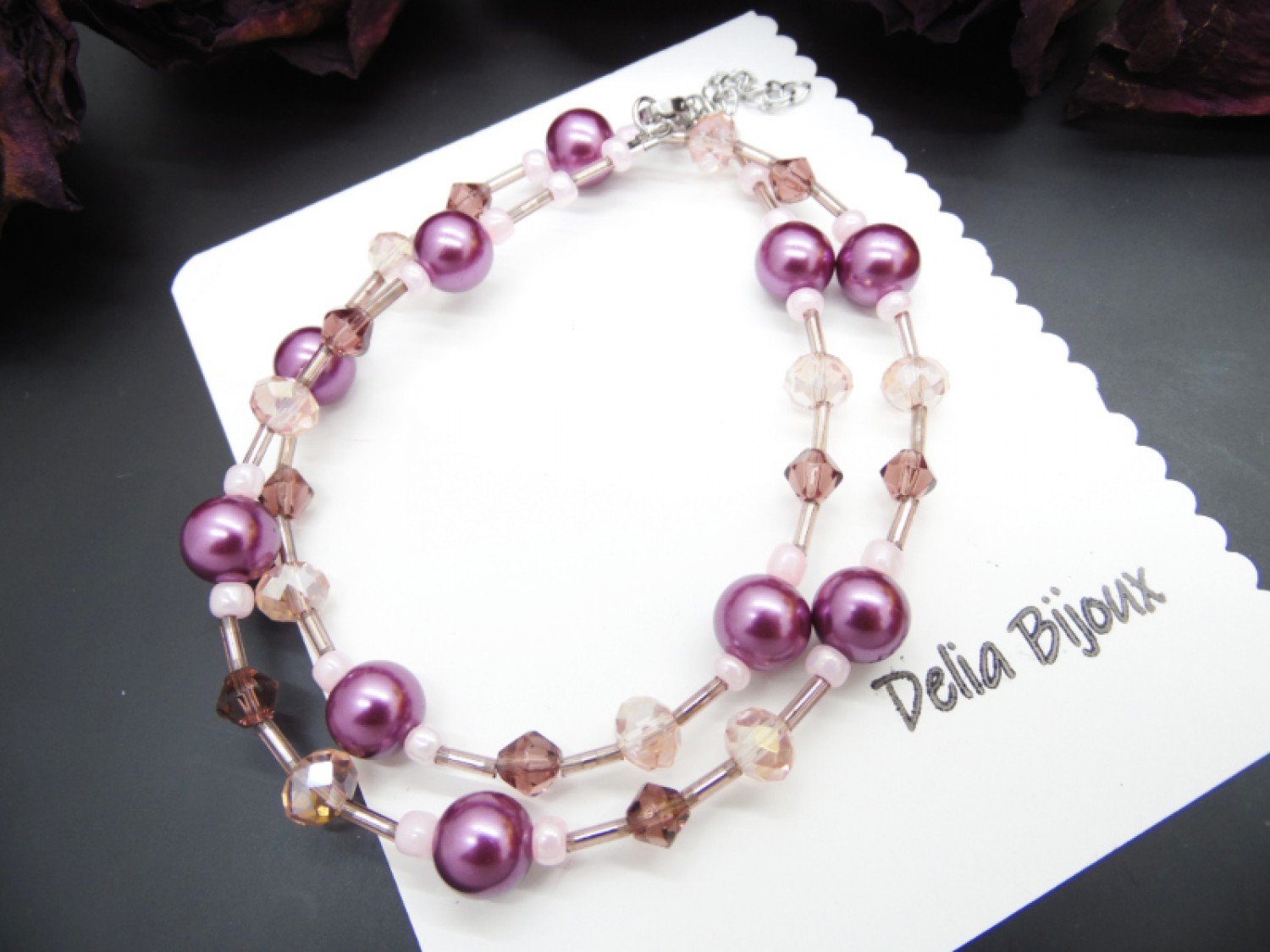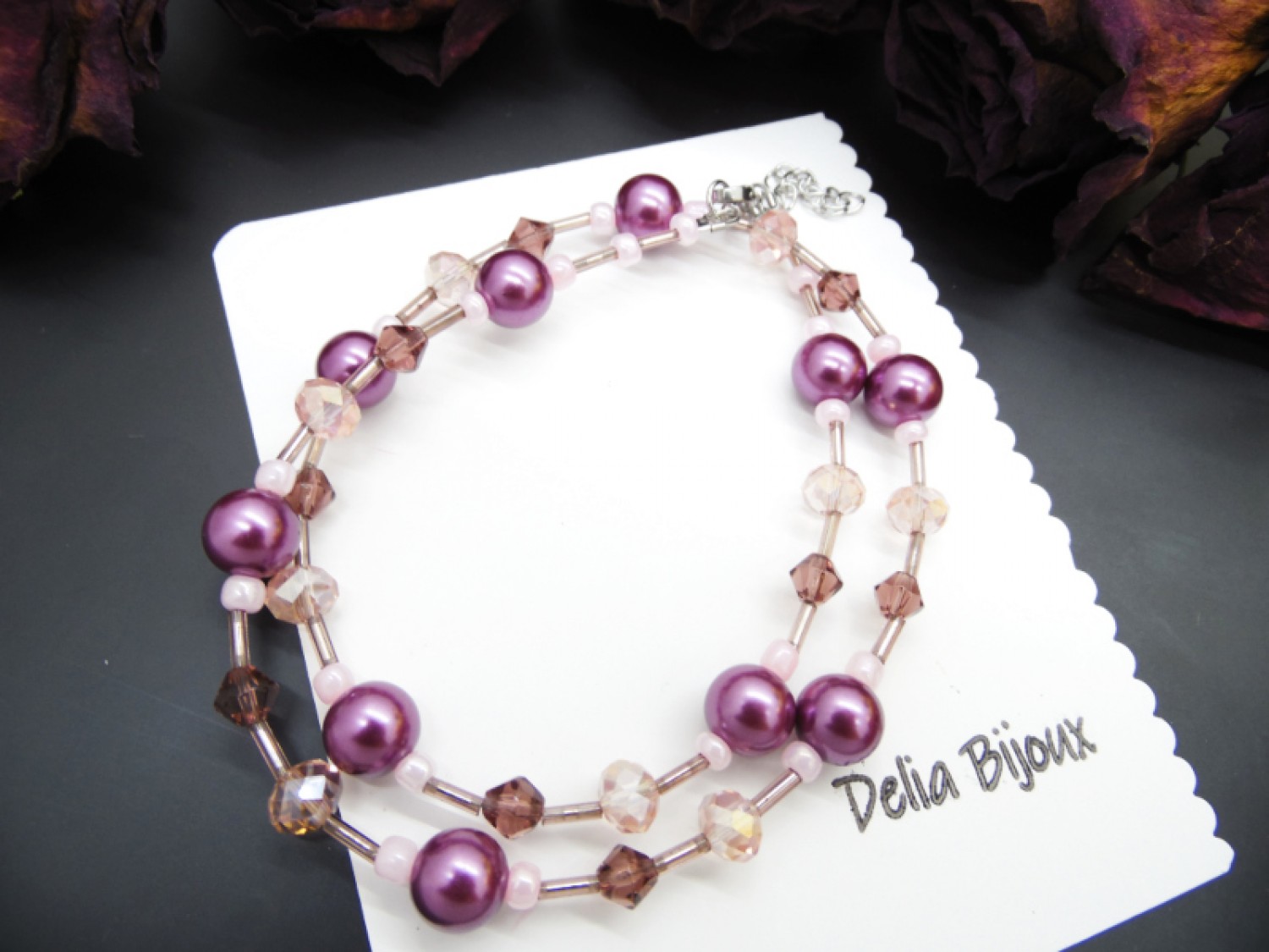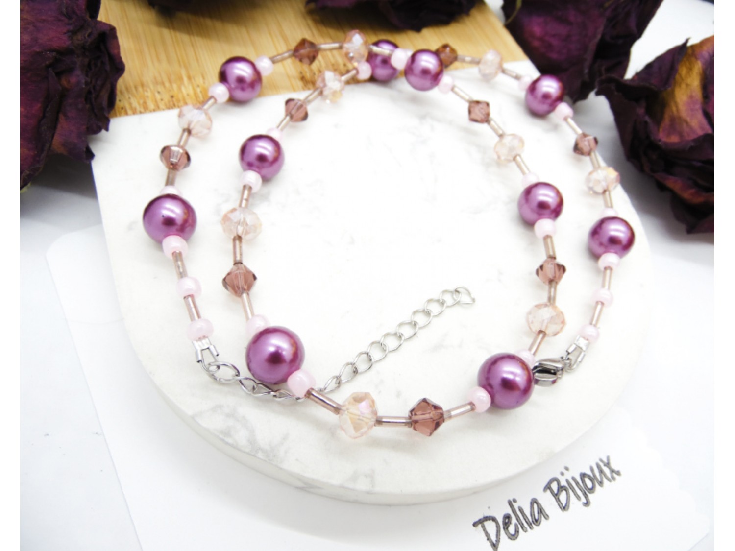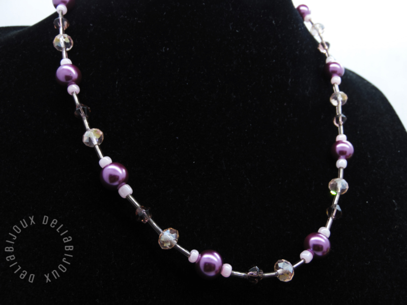Perlele de sticlă mov oferă un aer clasic și sofisticat, în timp ce mărgelele de sticlă fațetate roz și cristalele fațetate mov adaugă strălucire subtilă, captând lumina în mod spectaculos.