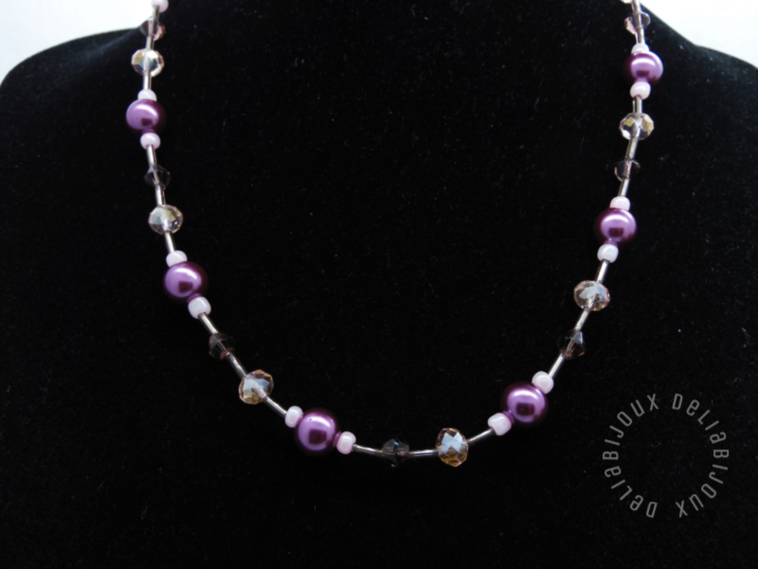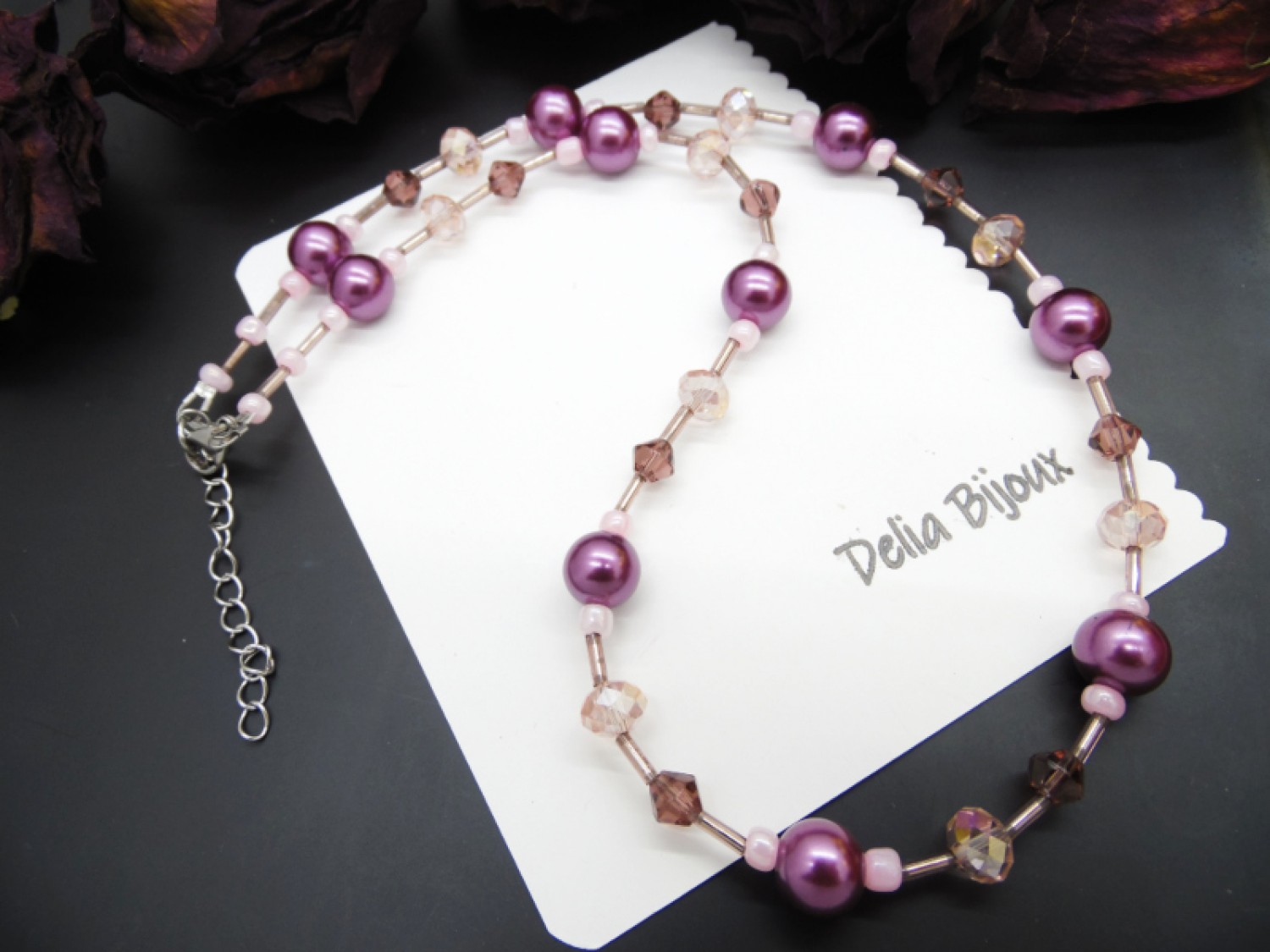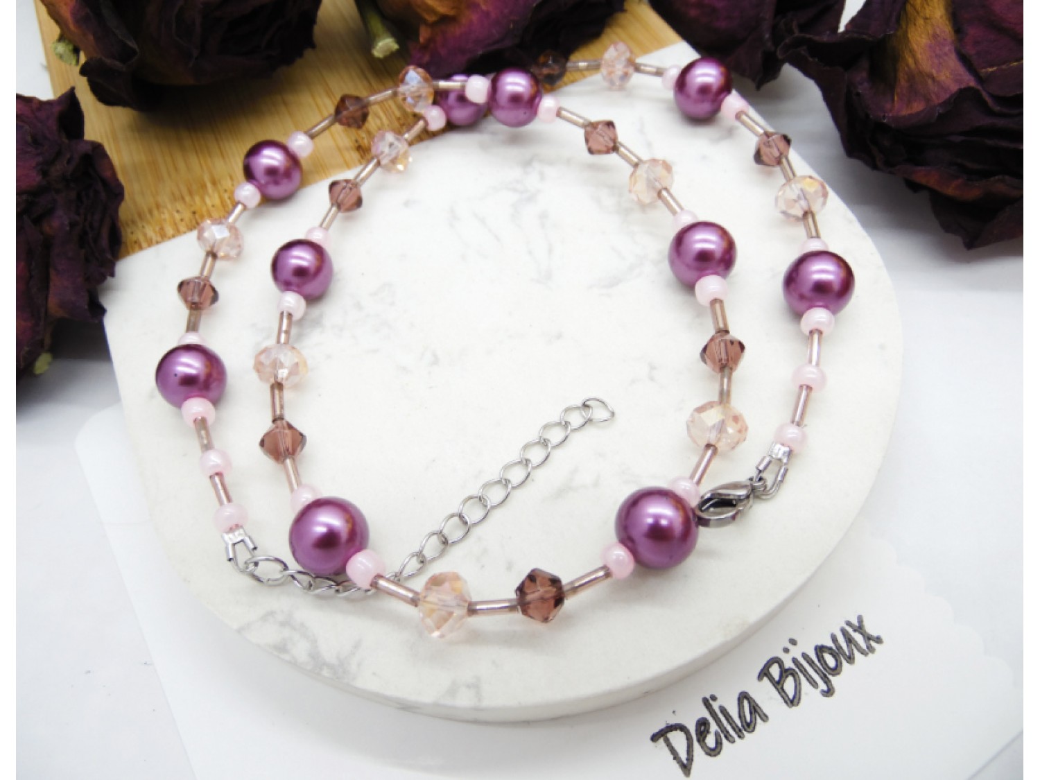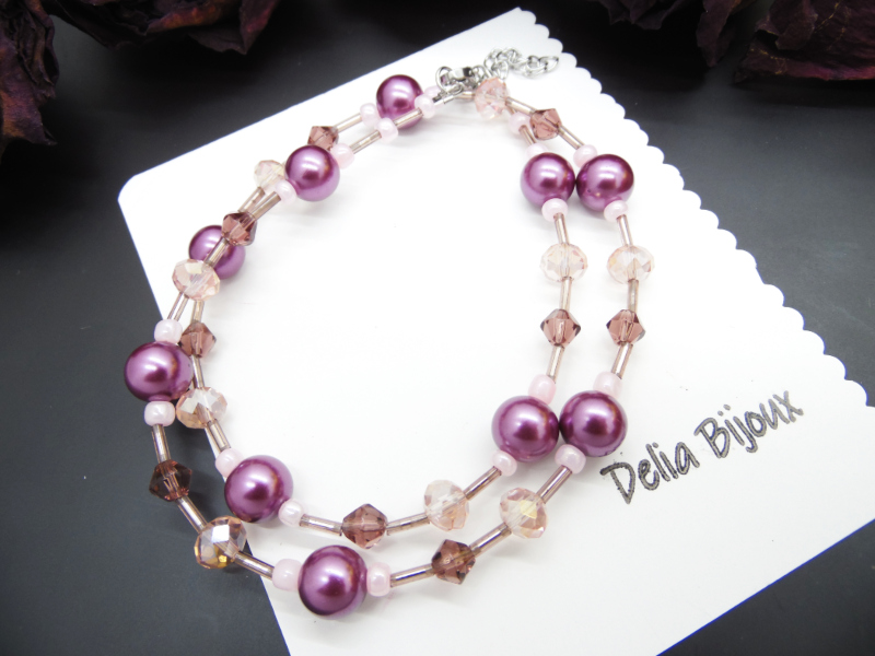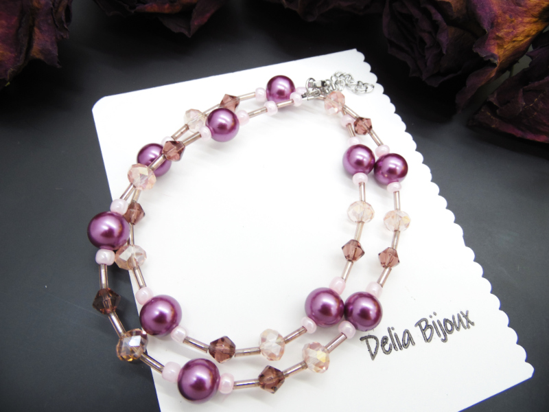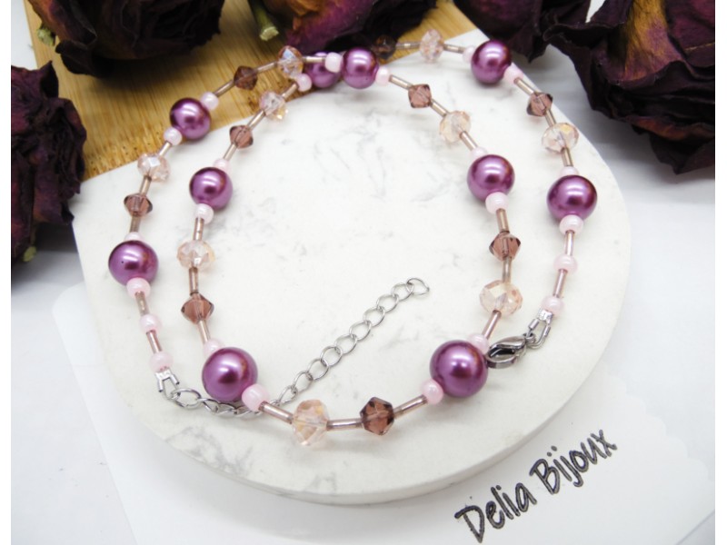 Acest colier delicat și feminin este realizat manual, combinând armonios nuanțe de mov și roz pentru un efect elegant și rafinat.