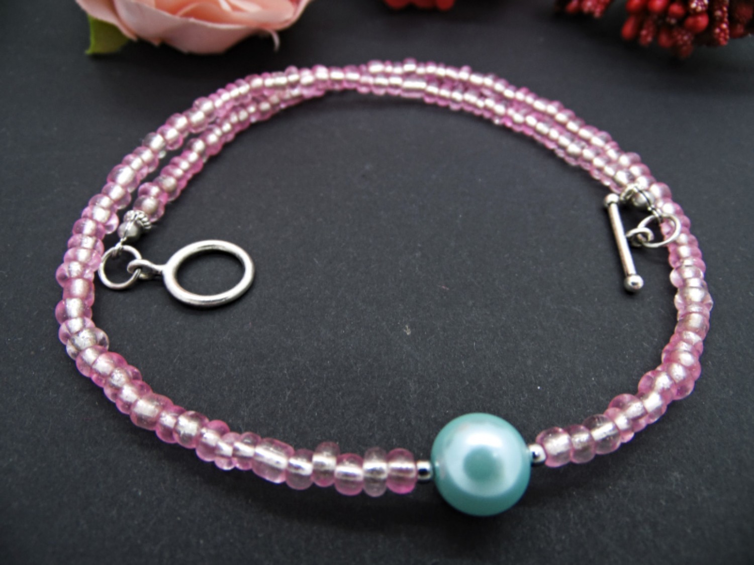 Colier handmade, la baza gatului, realizat din margele de nisip (4 mm), perla de sticla (10 mm), bile otel inoxidabil ( 3 mm), elemente metalice. Inchidere tip toggle. Lungimea colierului - 41 cm