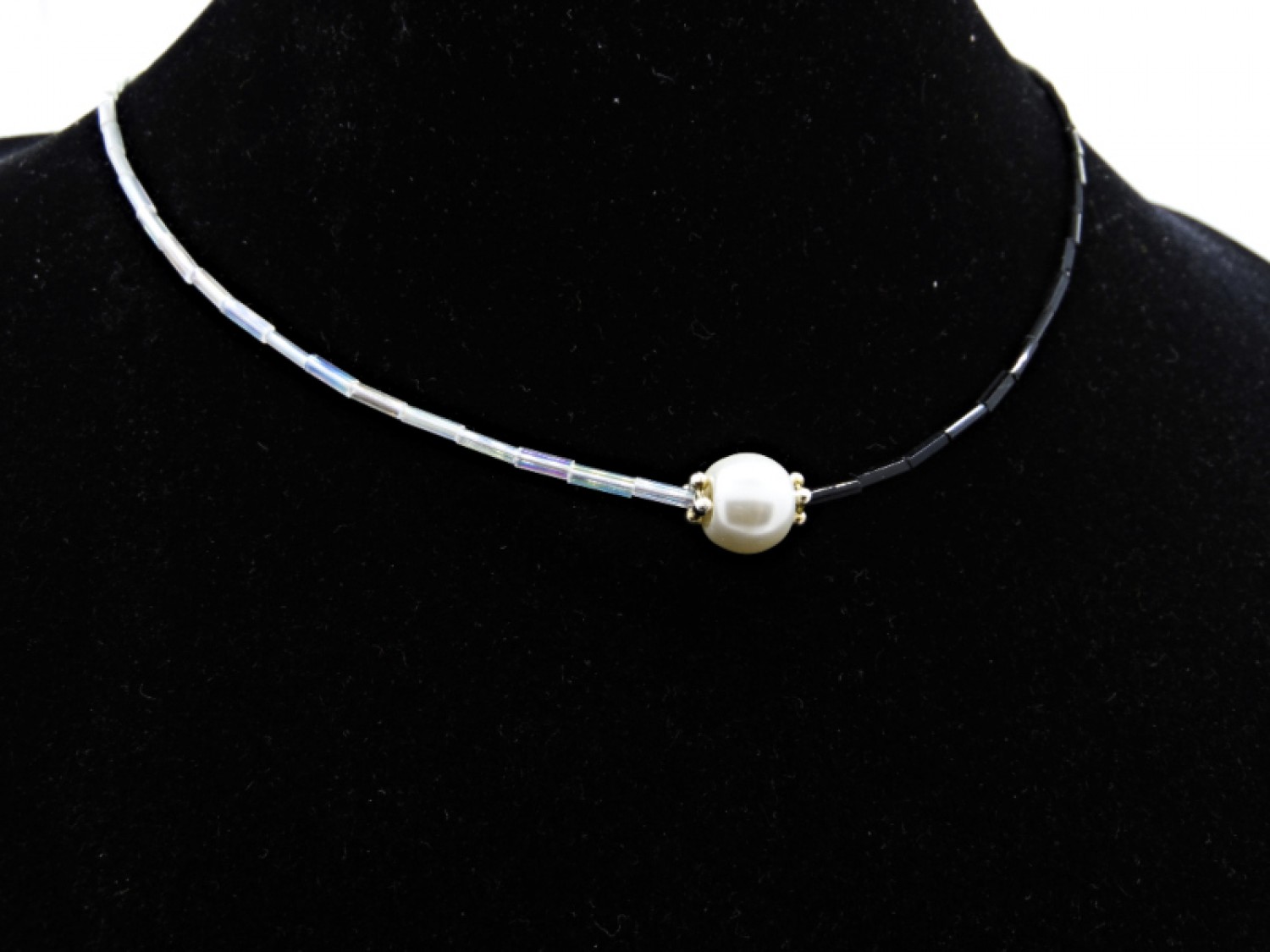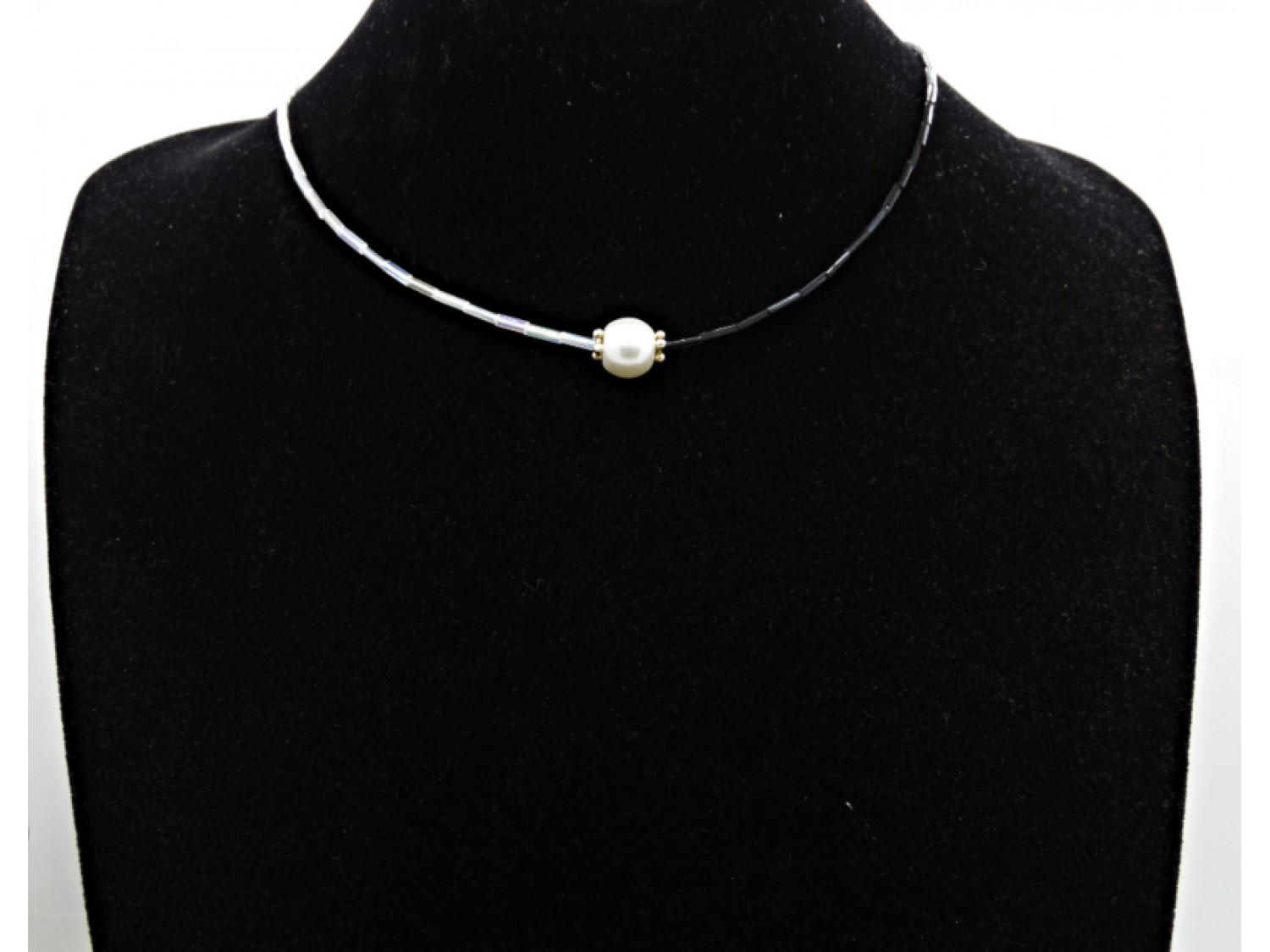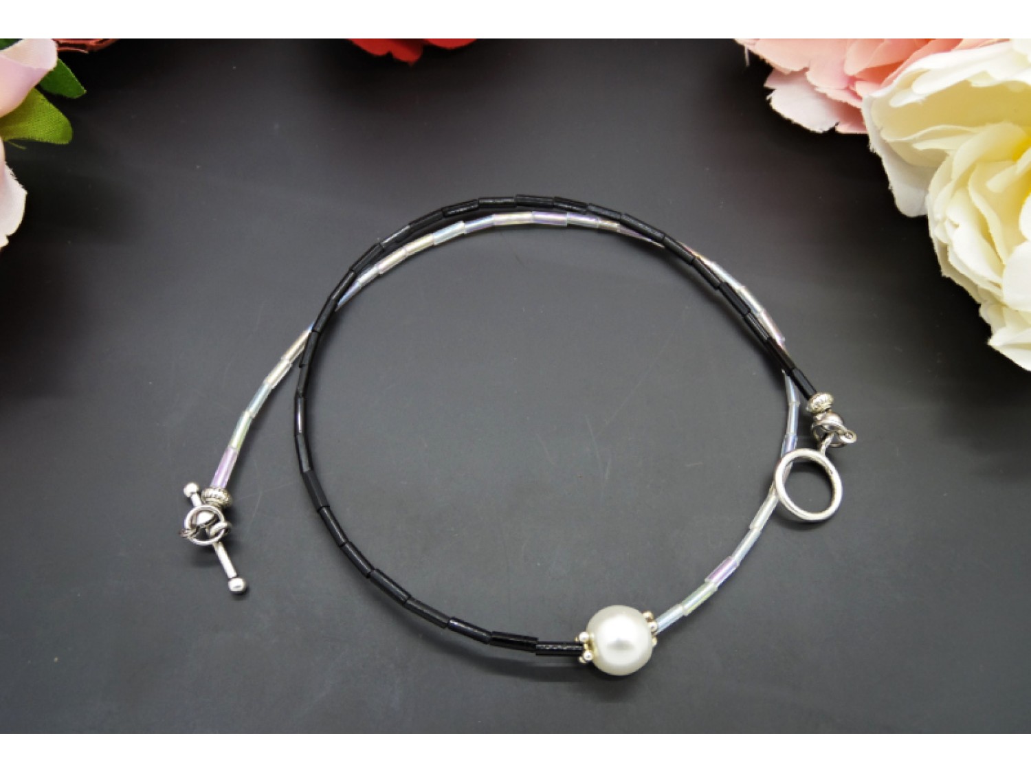Colier handmade, la baza gatului, realizat din margele de nisip tubulare (8 mm), perla de sticla (10 mm), elemente metalice. Inchidere tip toggle. Lungimea colierului - 43 cm