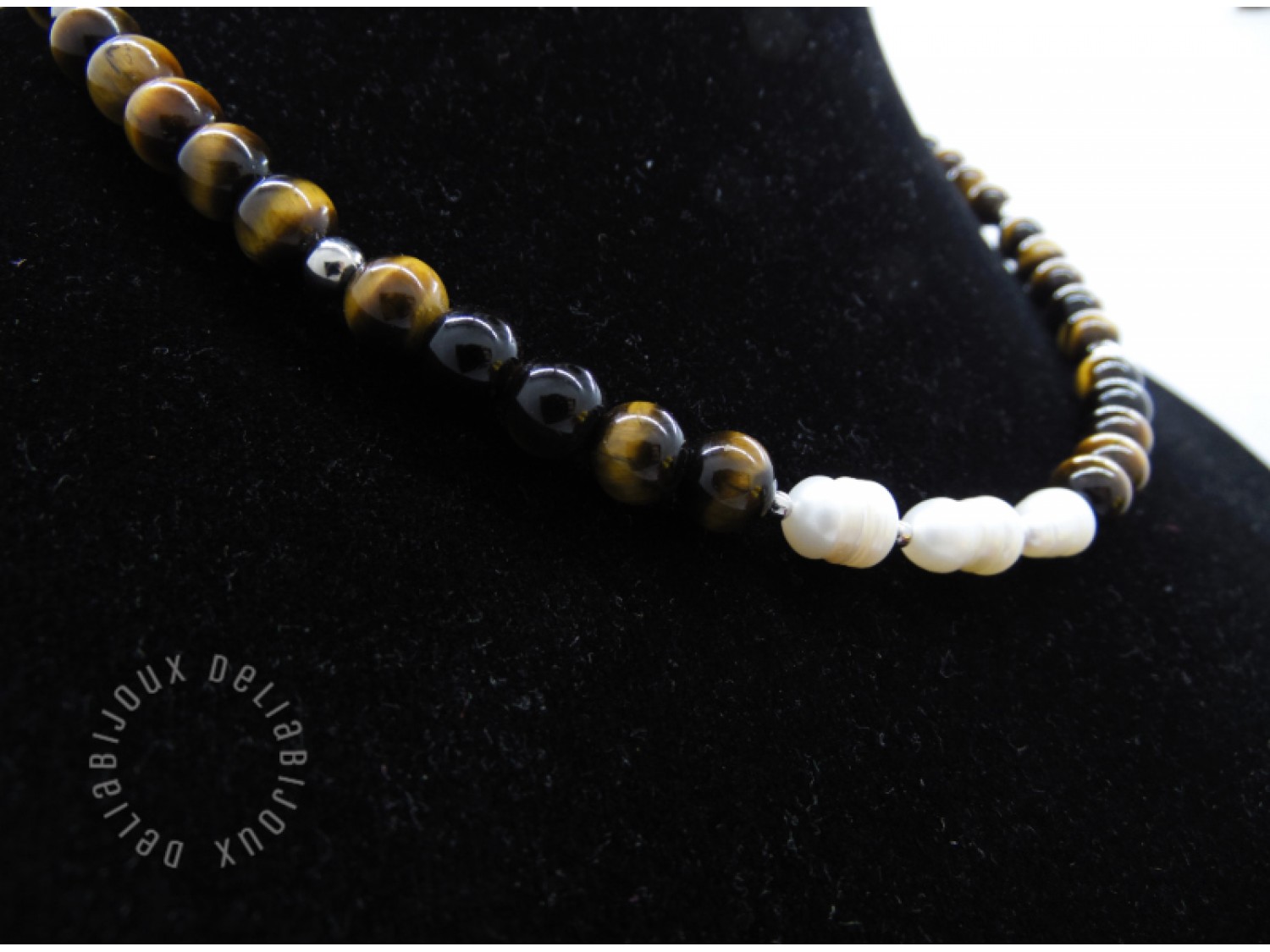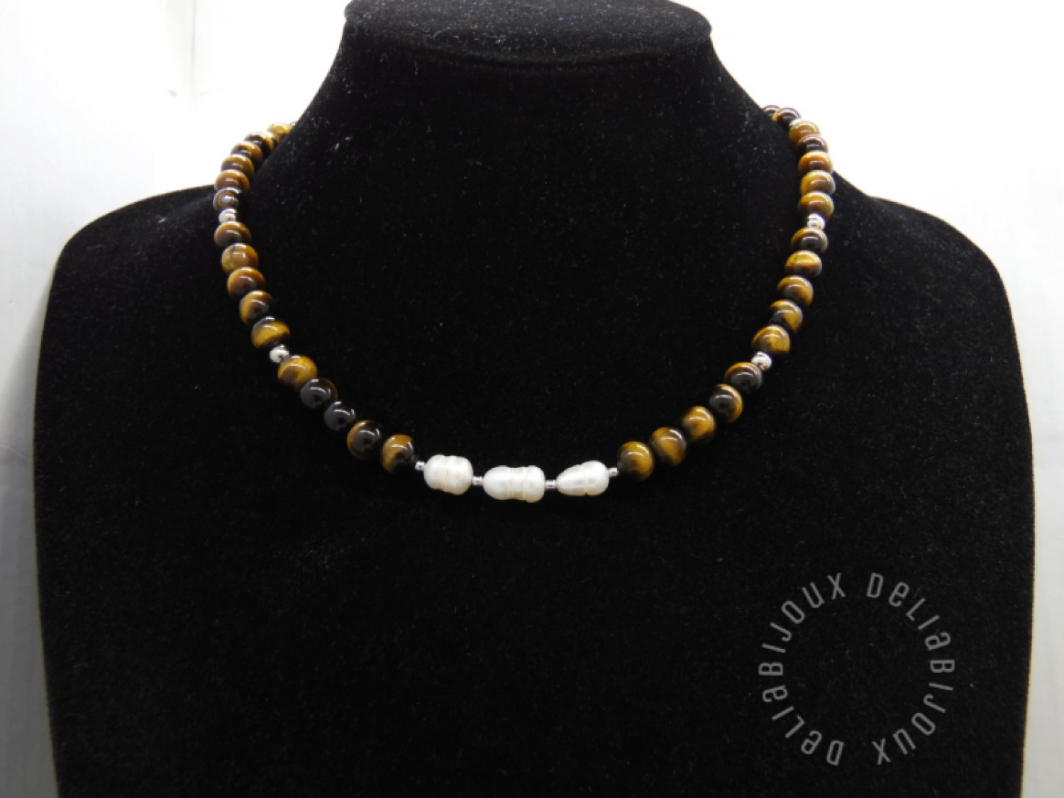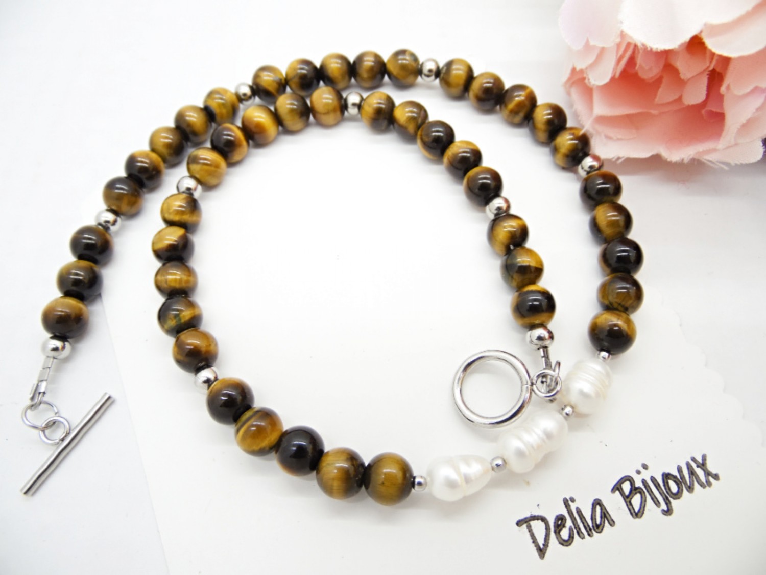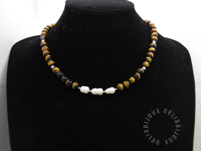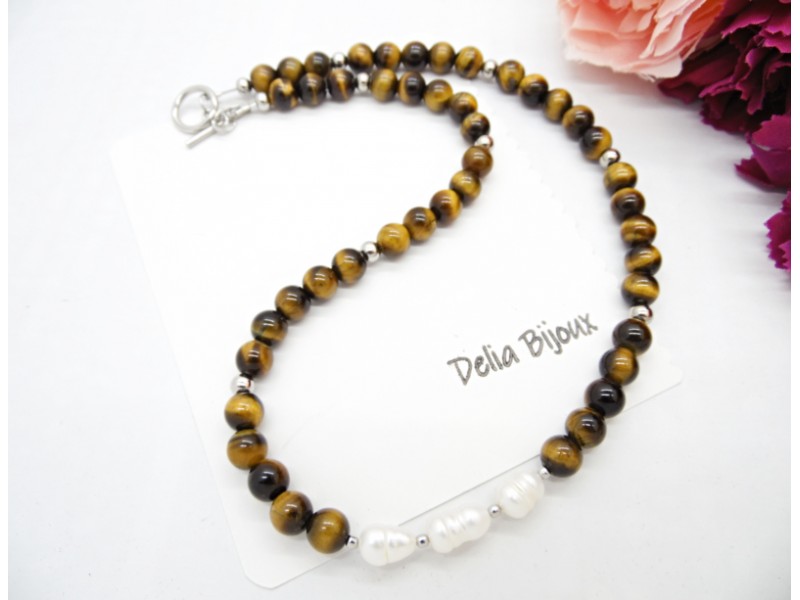 Colier handmade, la baza gatului, realizat din ochi de tigru (8 mm), perle de cultura naturale- forma neregulata (10~12 mm), bile otel inoxidabil (2 mm, 5 mm), elemente metalice din otel inoxidabil. Inchidere tip lobster din otel inoxidabil.