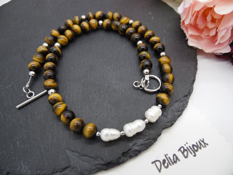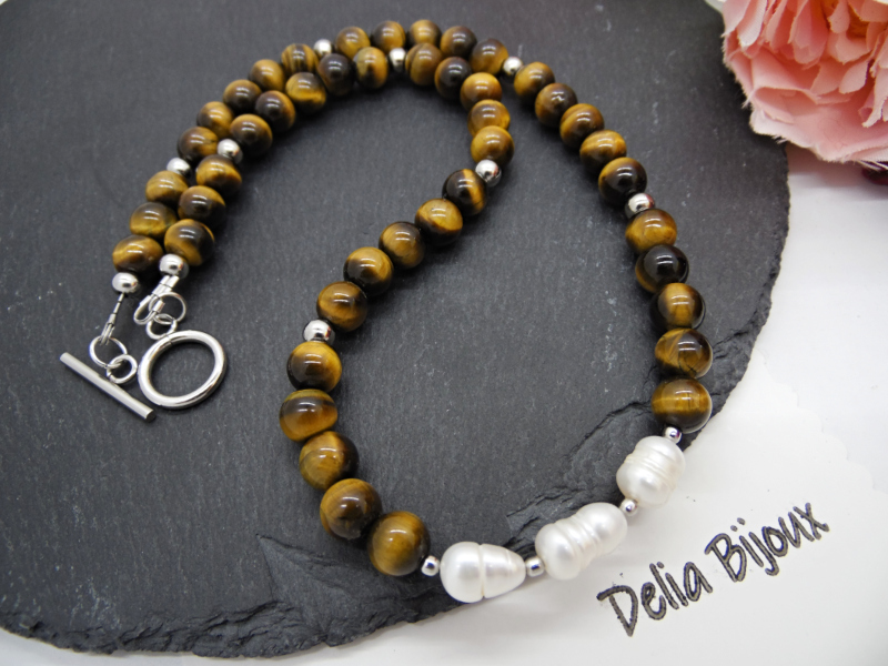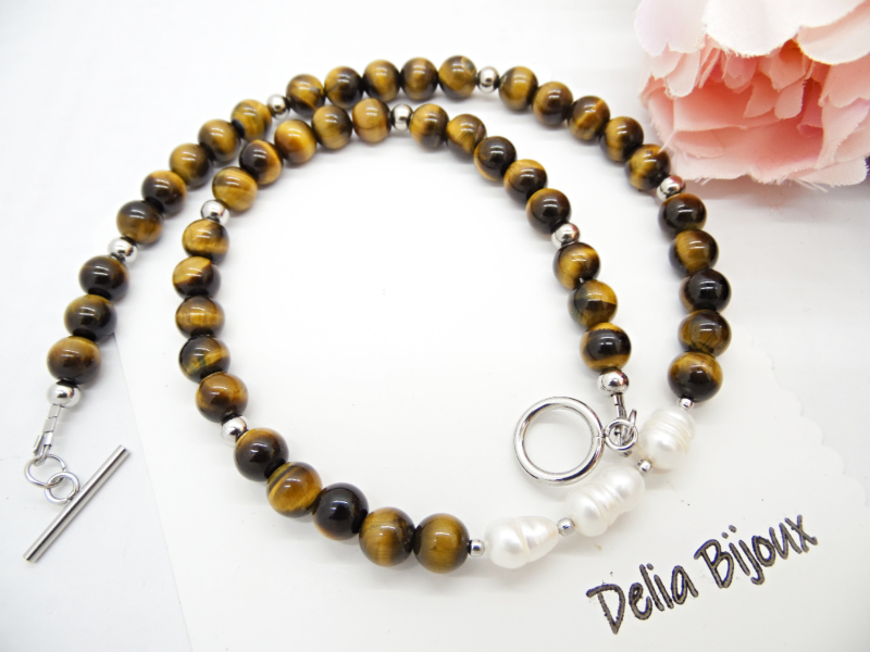 Aranjamentul simetric al mărgelelor de ochi de tigru și poziționarea centrală a perlelor conferă colierului un echilibru vizual plăcut. Designul simplu, dar sofisticat, face acest colier potrivit pentru diverse stiluri vestimentare, de la rochii elegante la bluze casual.