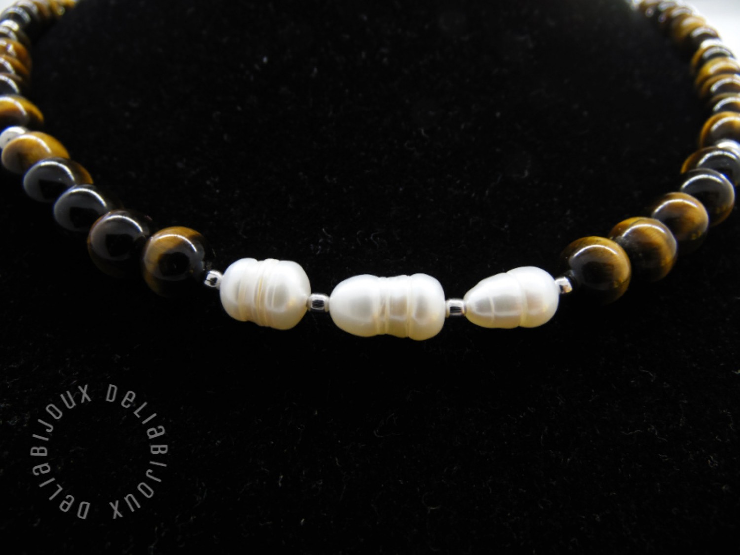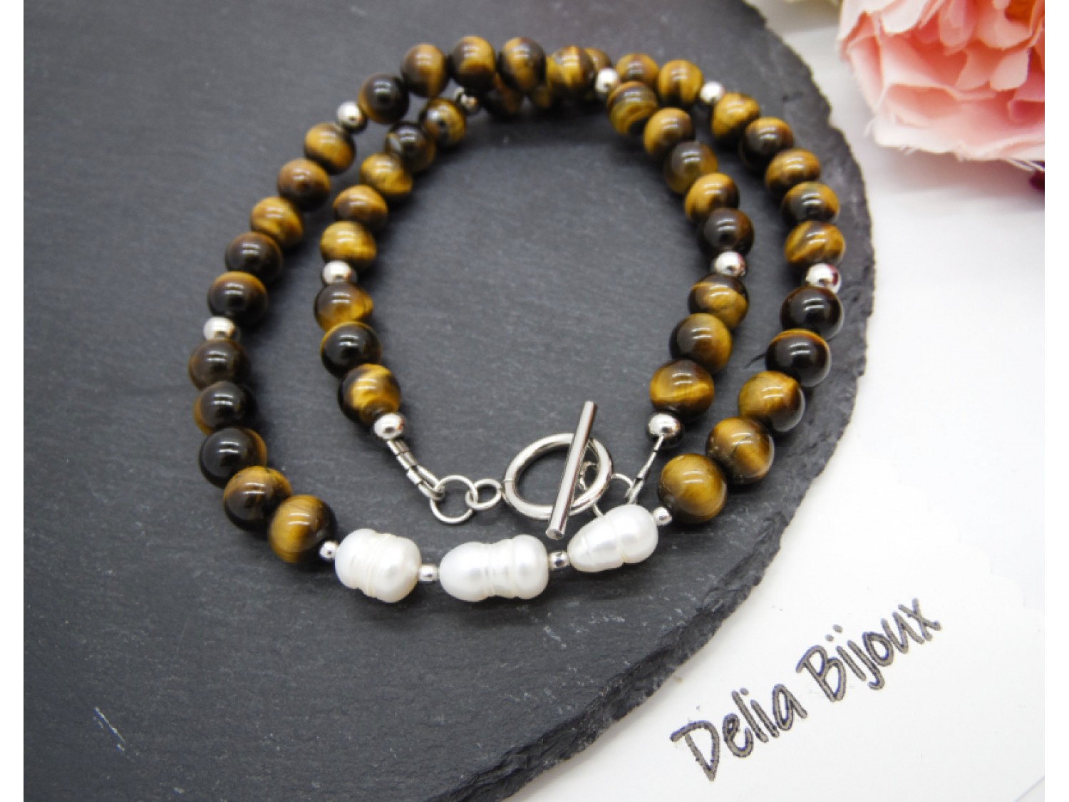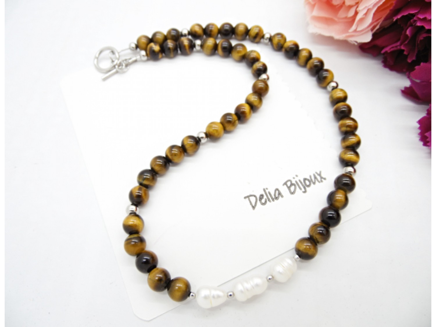 Adăugați o notă de rafinament și eleganță garderobei dumneavoastră cu acest colier handmade unic, perfect pentru ocazii speciale sau pentru a adăuga un plus de strălucire ținutelor zilnice. Colierul, care se așază delicat la baza gâtului si pune în valoare linia gâtului și decolteul, este confecționat din pietre semiprețioase de mărgele ochi de tigru, cu reflexii calde și intense, și este înfrumusețat cu trei perle naturale de cultură plasate elegant în mijloc.