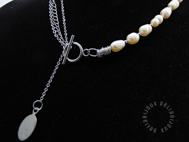 Colier handmade, modern și versatil, realizat din perle de cultură, lanțuri și pandantive din otel inoxidabil. Designul asimetric îmbină eleganța perlelor cu stilul contemporan al lanțurilor metalice, rezultând o piesă ușor de integrat atât în ținute casual, cât și elegante.