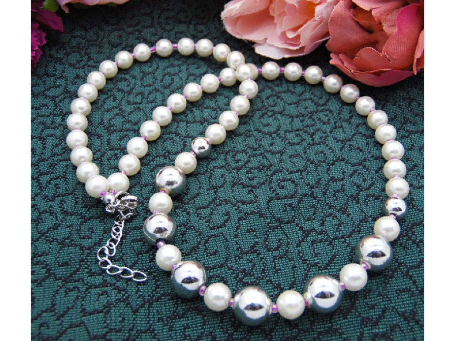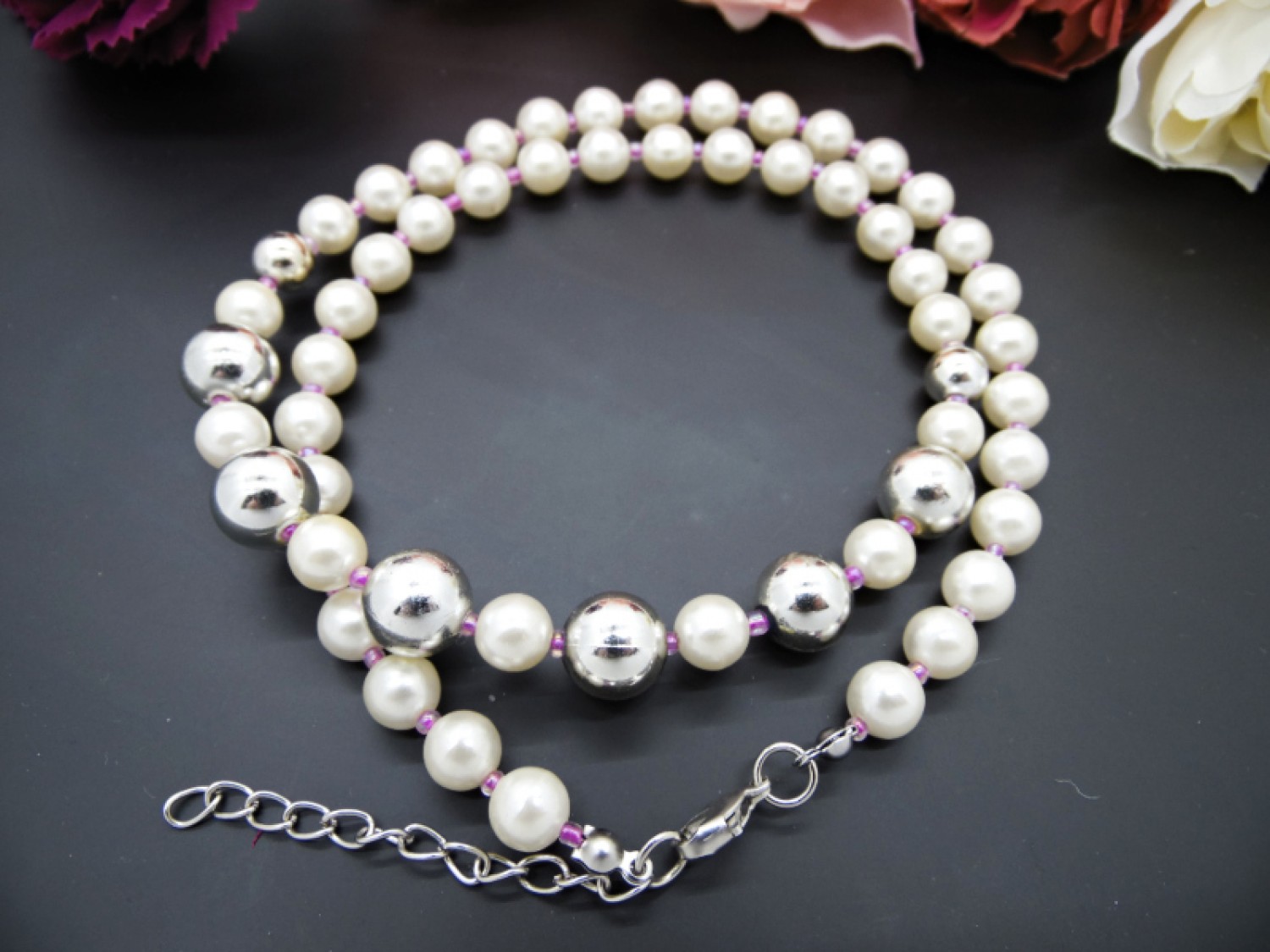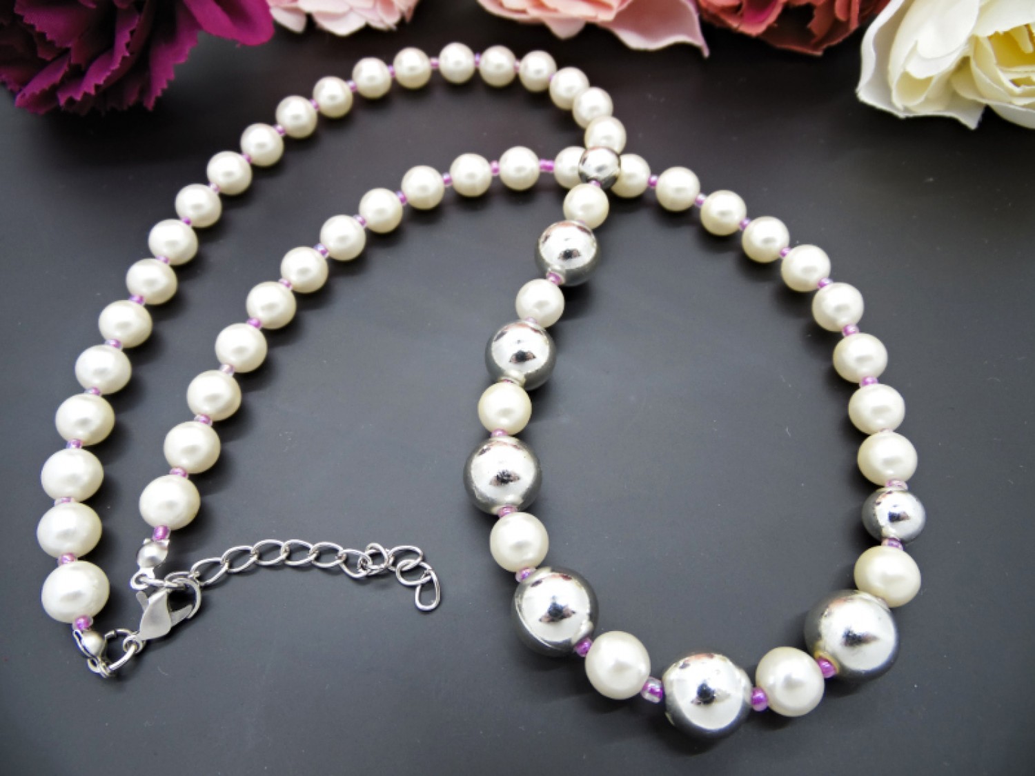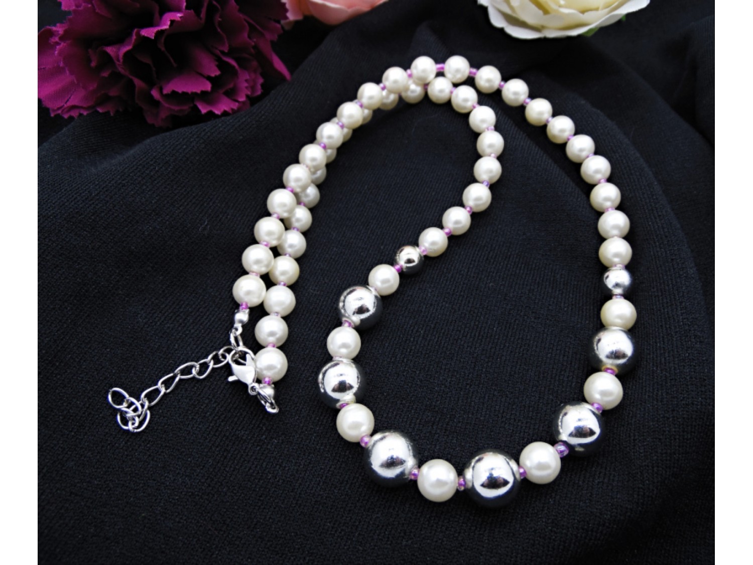 Colier handmade, realizat din perle de plastic (8 mm), margele de plastic (12 mm, 8 mm), margele de nisip (2 mm), elemente metalice. Inchidere tip lobster. Lungimea colierului -> 56 cm + 5 cm lant prelungire