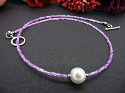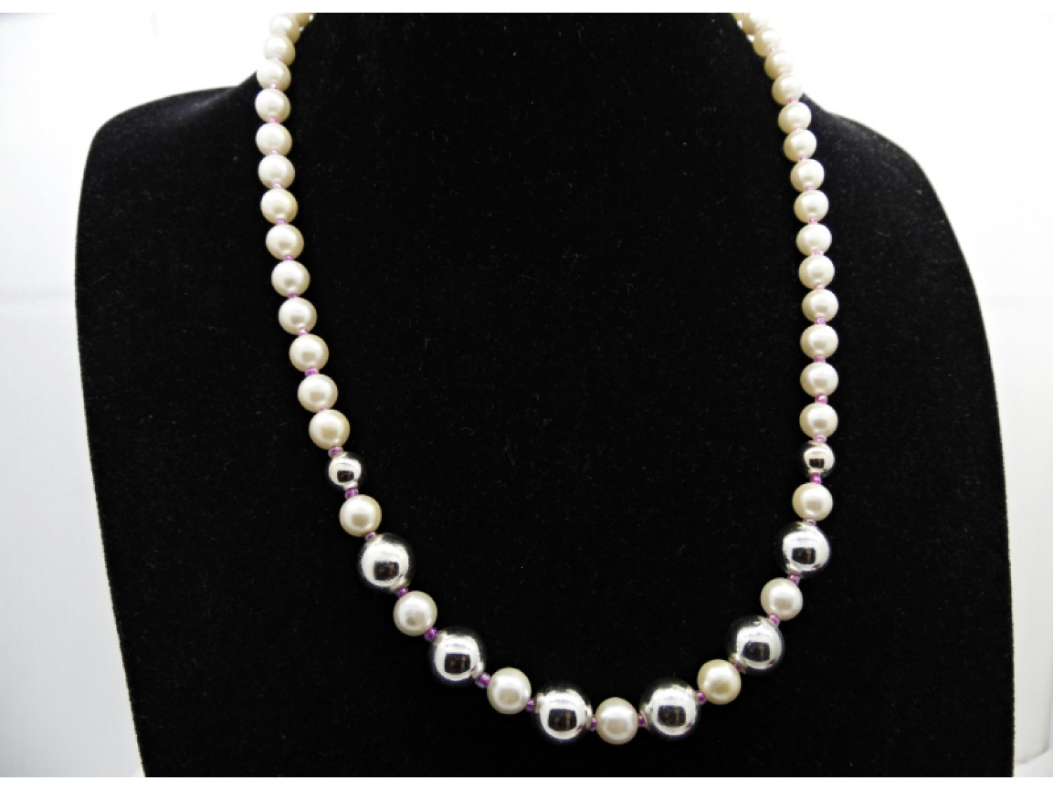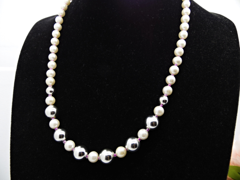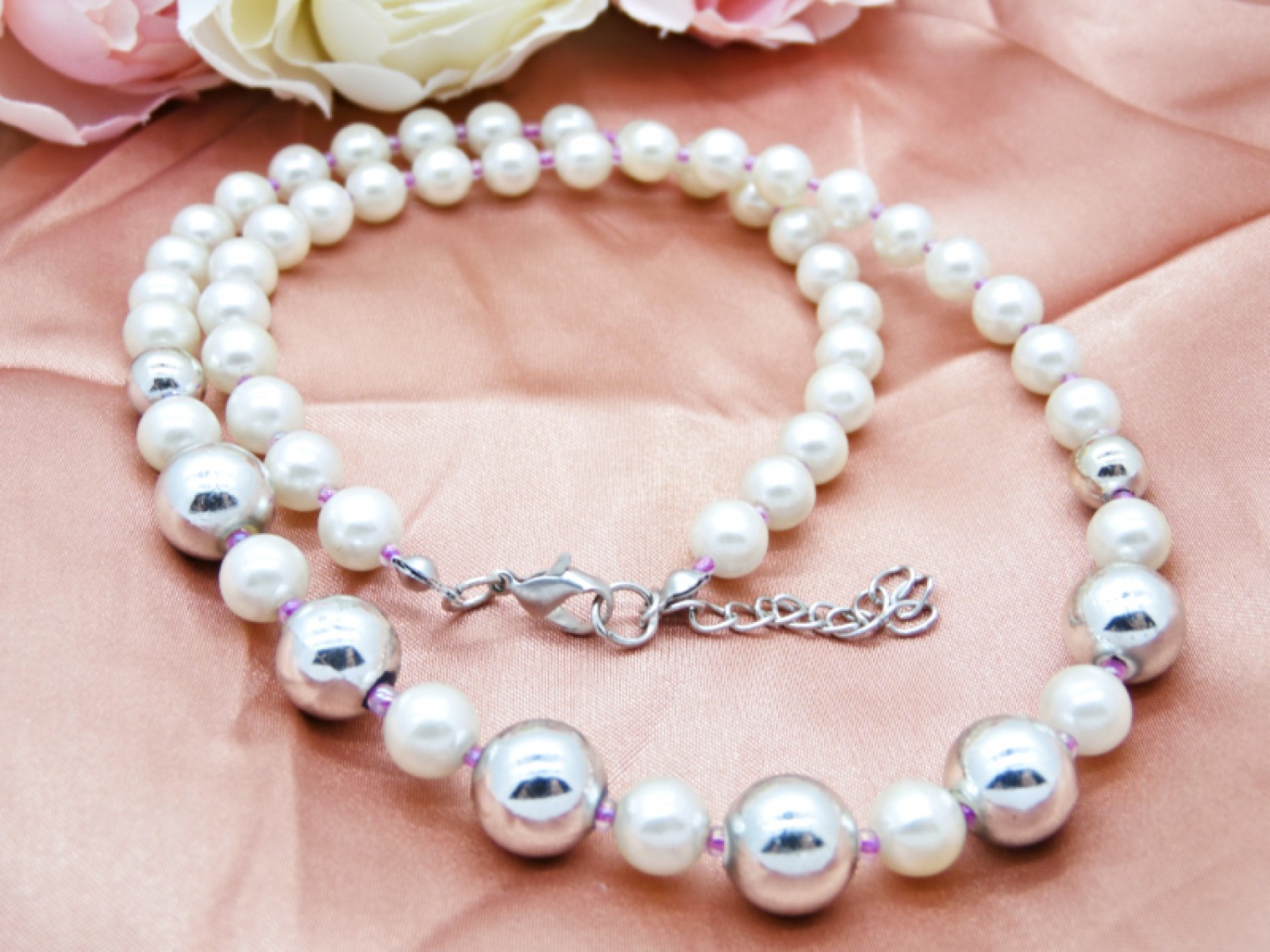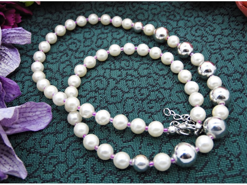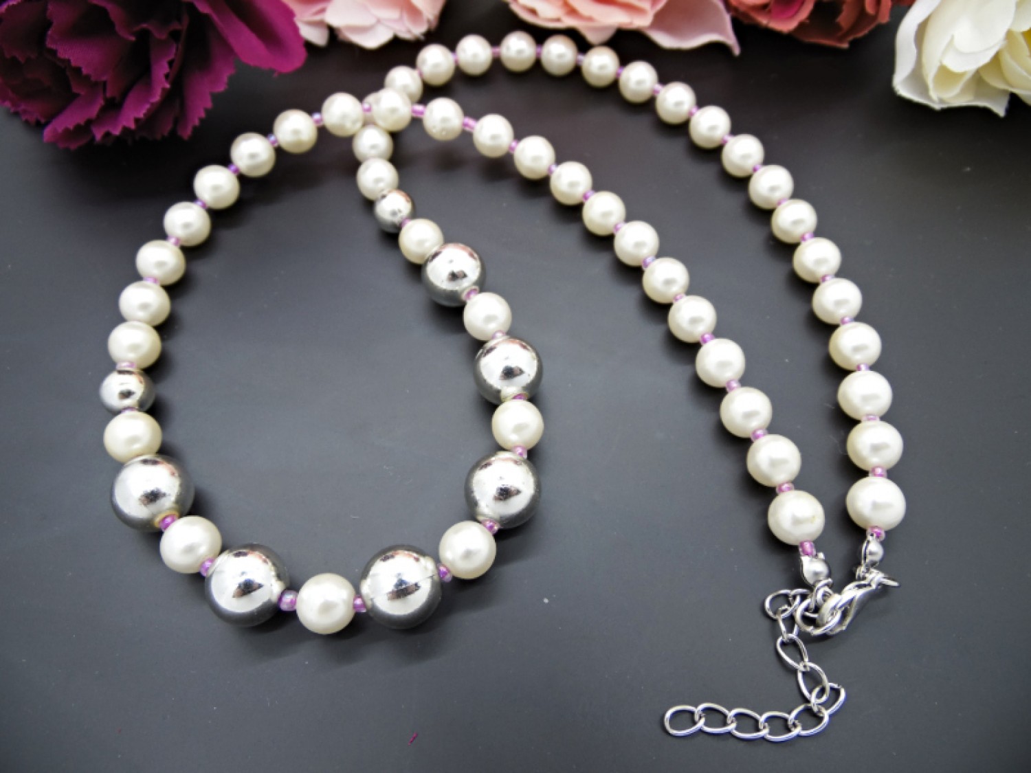 Colier handmade, realizat din perle de plastic (8 mm), margele de plastic (12 mm, 8 mm), margele de nisip (2 mm), elemente metalice. Inchidere tip lobster. Lungimea colierului -> 56 cm + 5 cm lant prelungire
