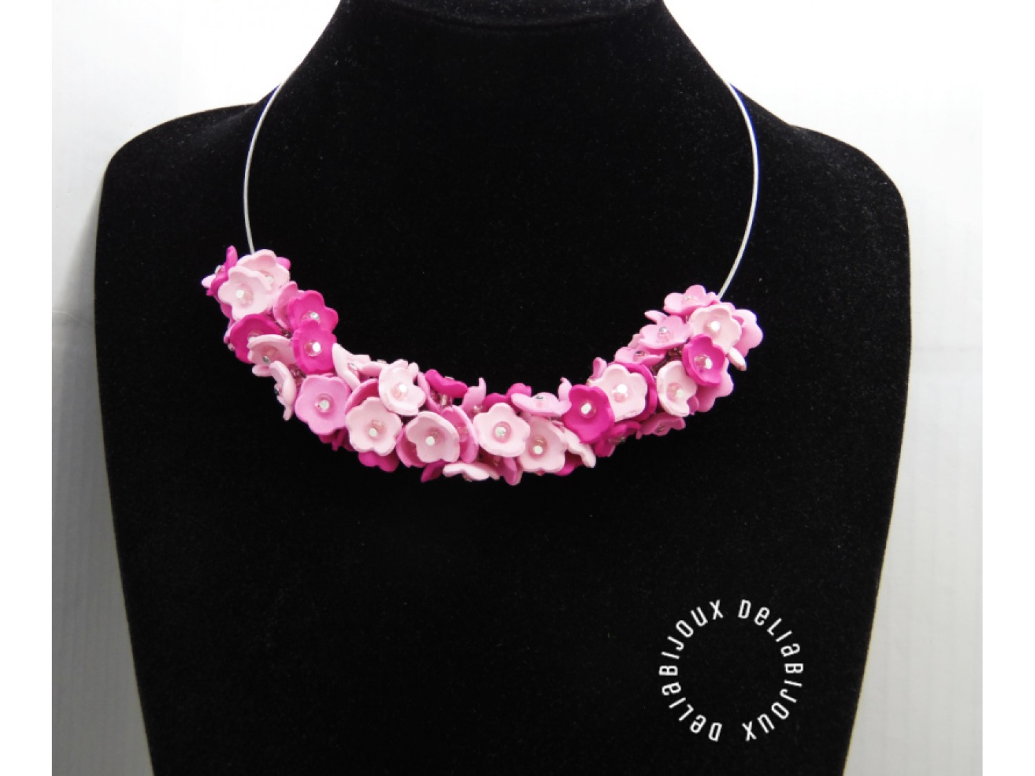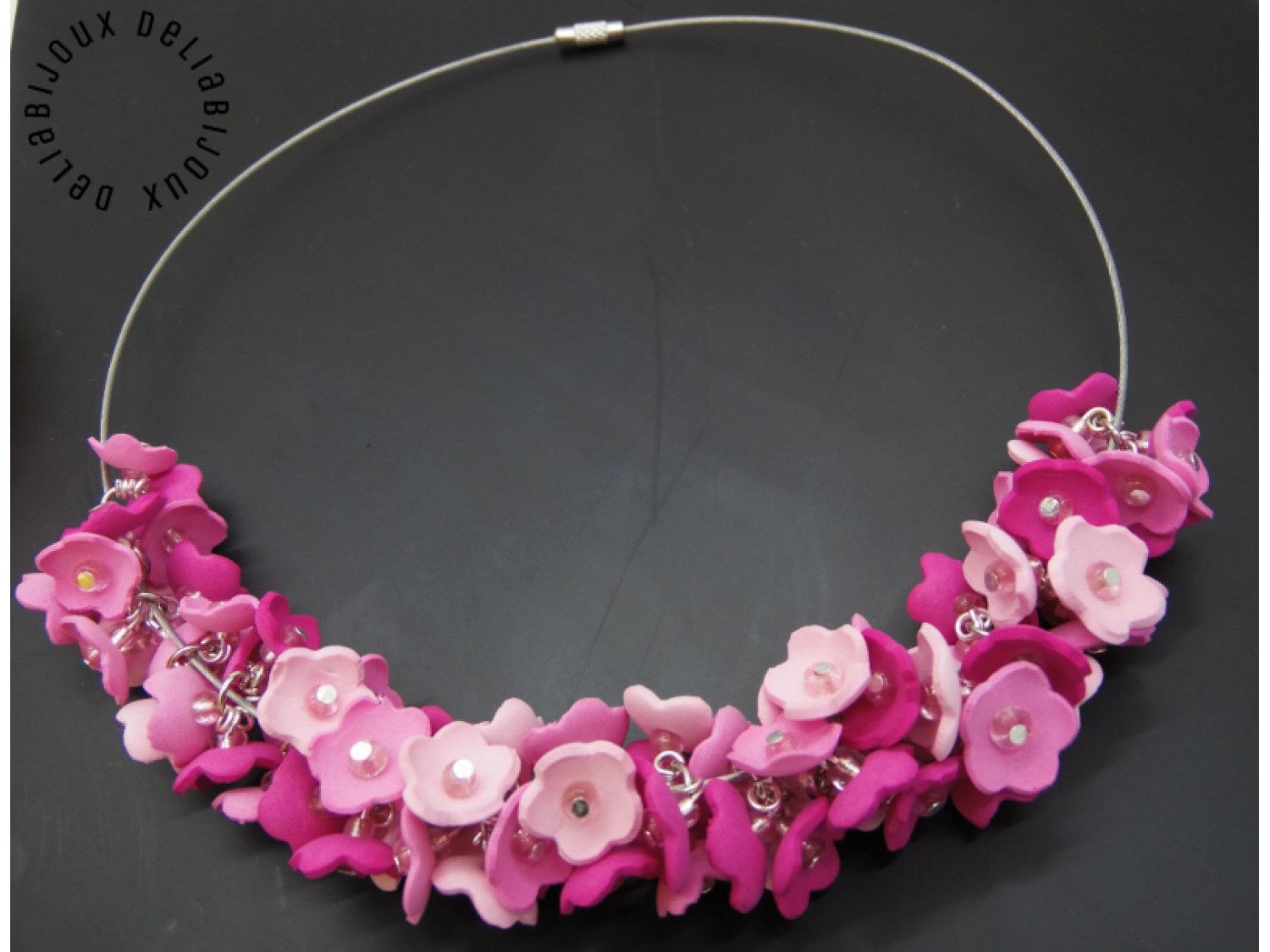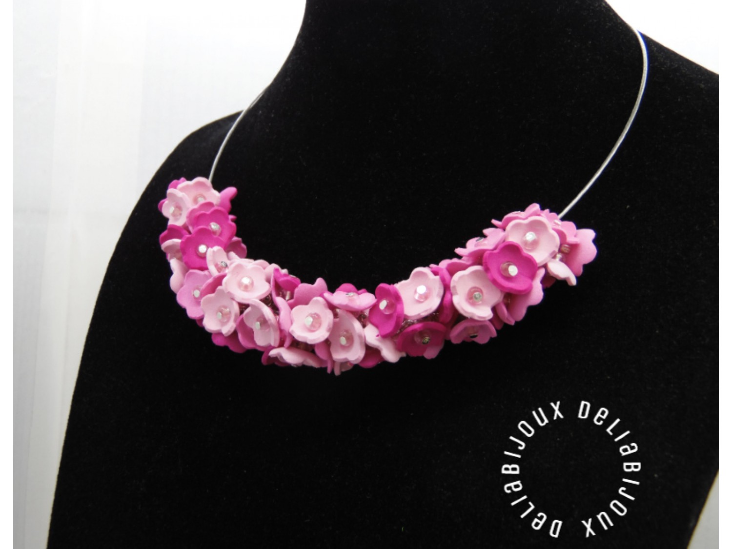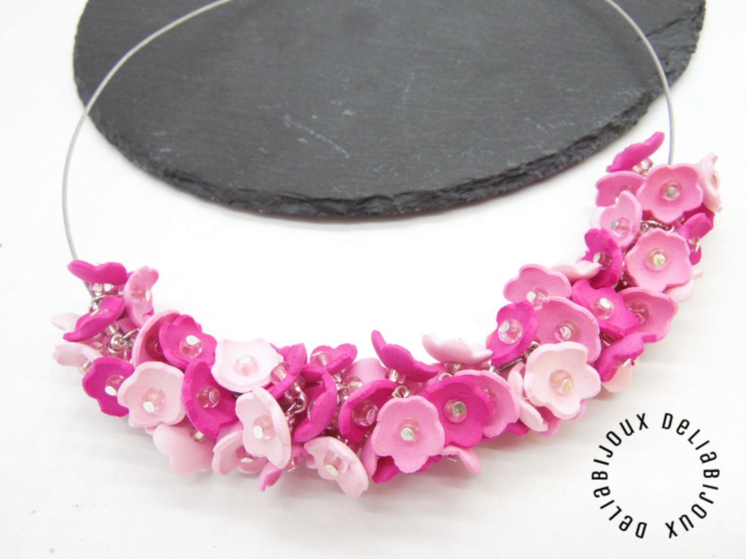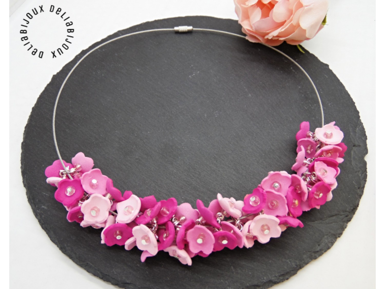 Colierul este confecționat din foamiran, în diverse nuanțe de roz, de la roz pal la fuchsia intens. Foamiranul este un material ușor și flexibil, cunoscut pentru durabilitatea și aspectul său deosebit. Foamiranul este tăiat și modelat manual pentru a crea forme delicate și atrăgătoare.
