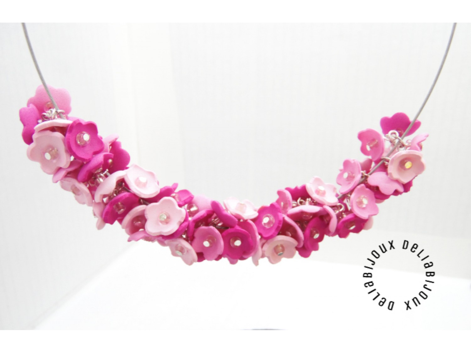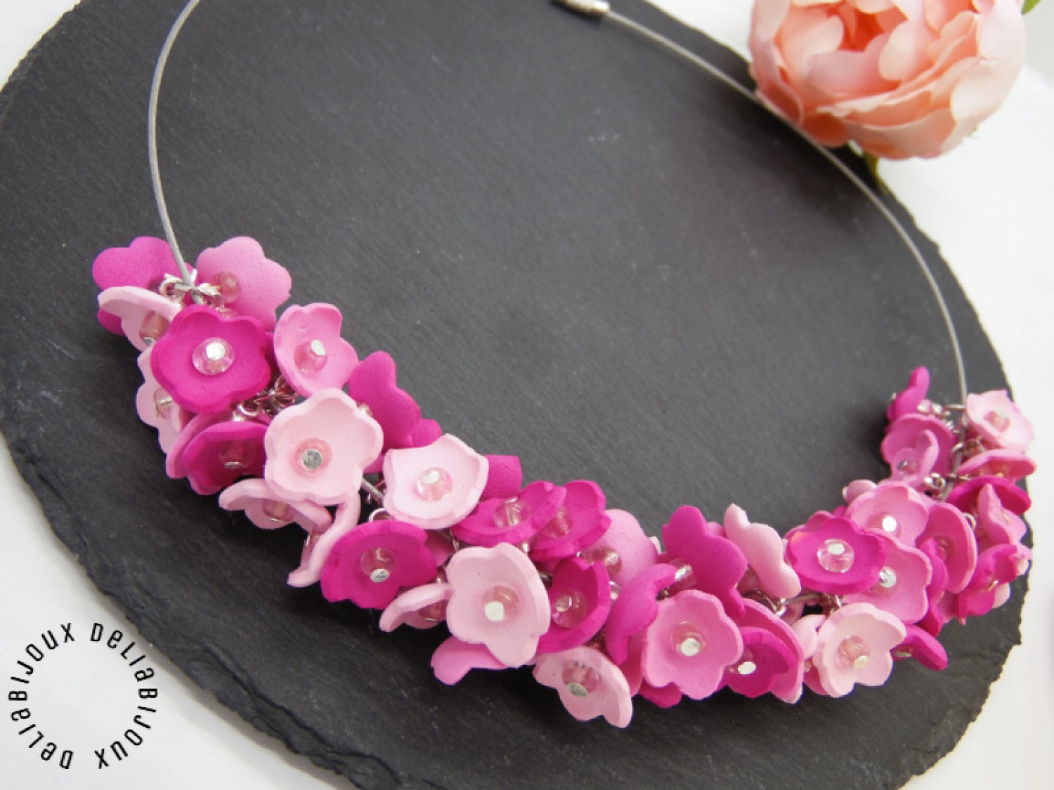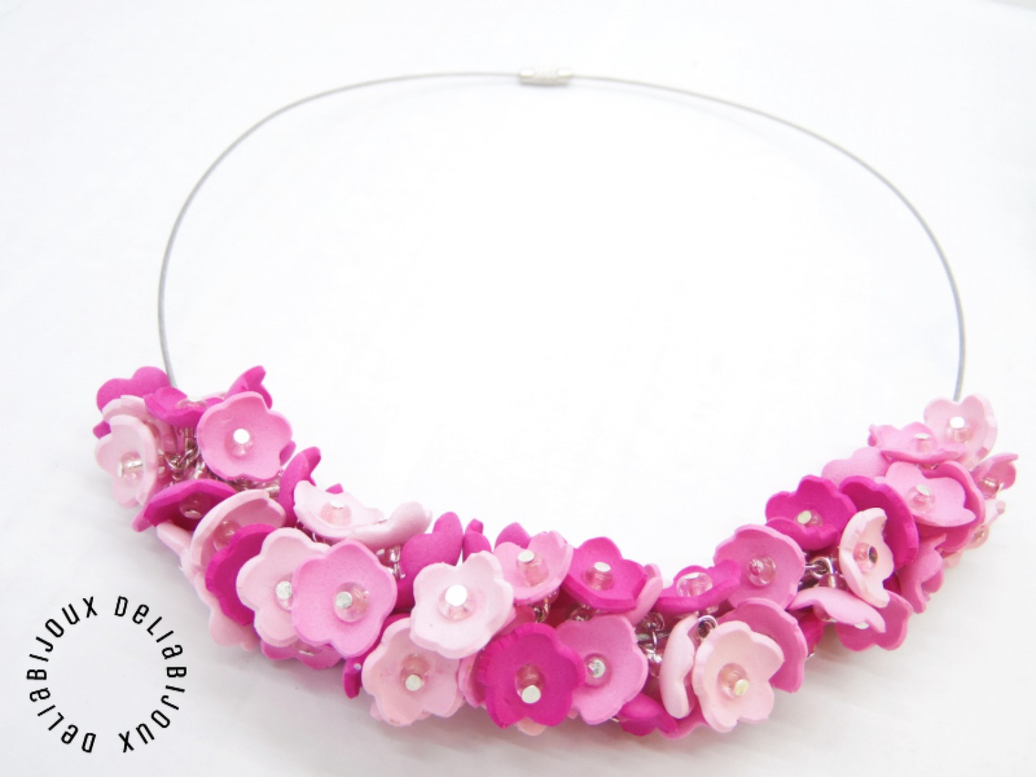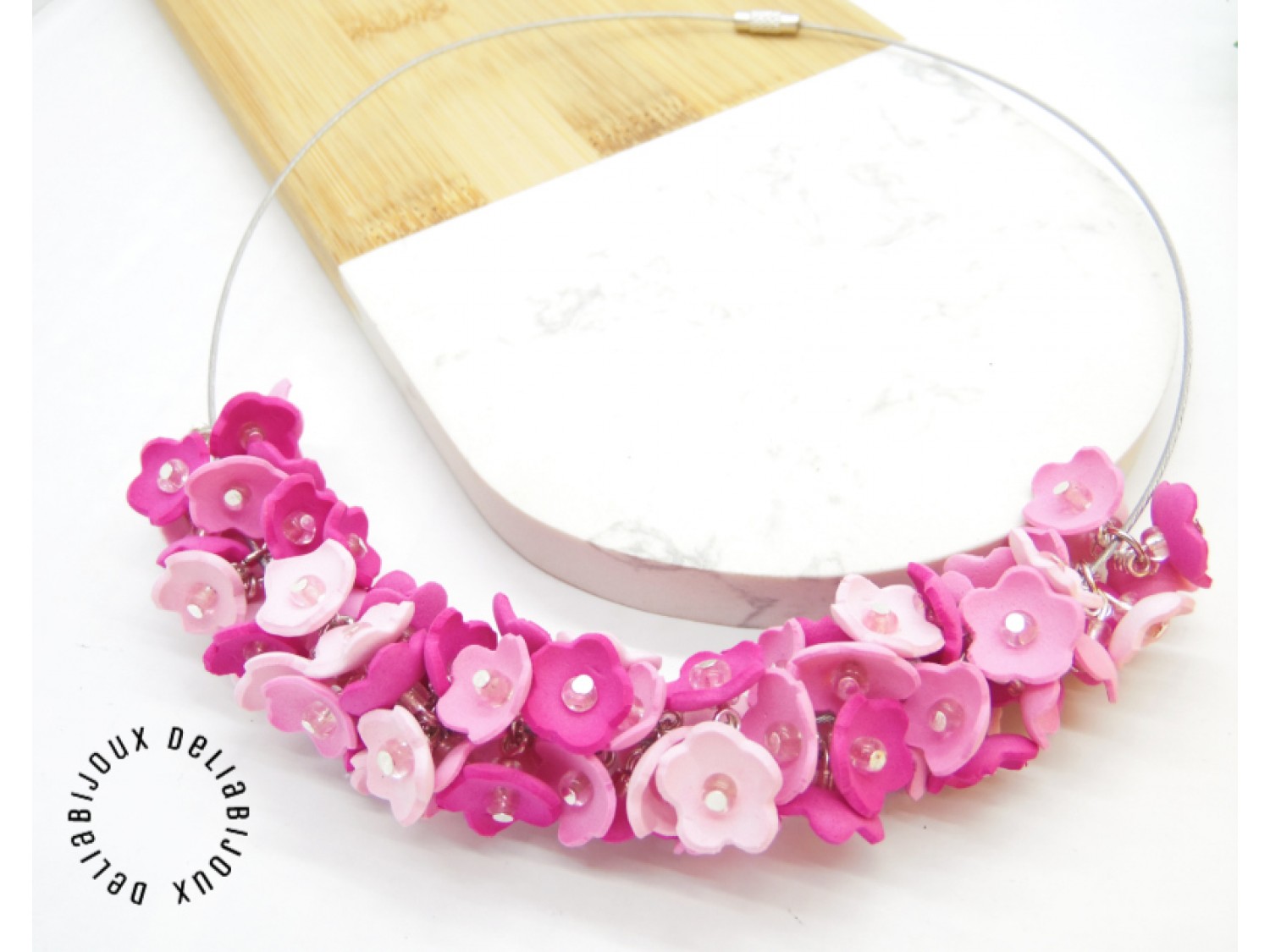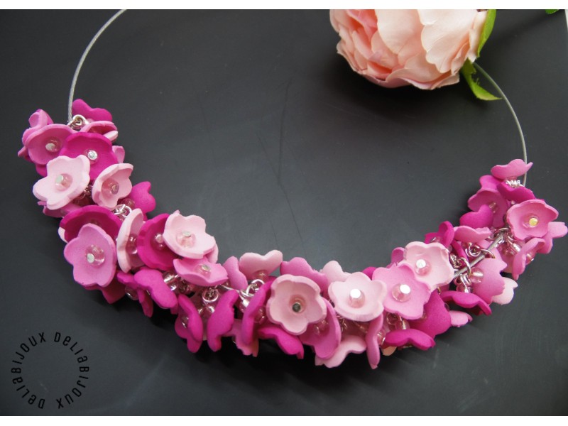 Colierul este confecționat din foamiran, în diverse nuanțe de roz, de la roz pal la fuchsia intens. Foamiranul este un material ușor și flexibil, cunoscut pentru durabilitatea și aspectul său deosebit. Foamiranul este tăiat și modelat manual pentru a crea forme delicate și atrăgătoare.