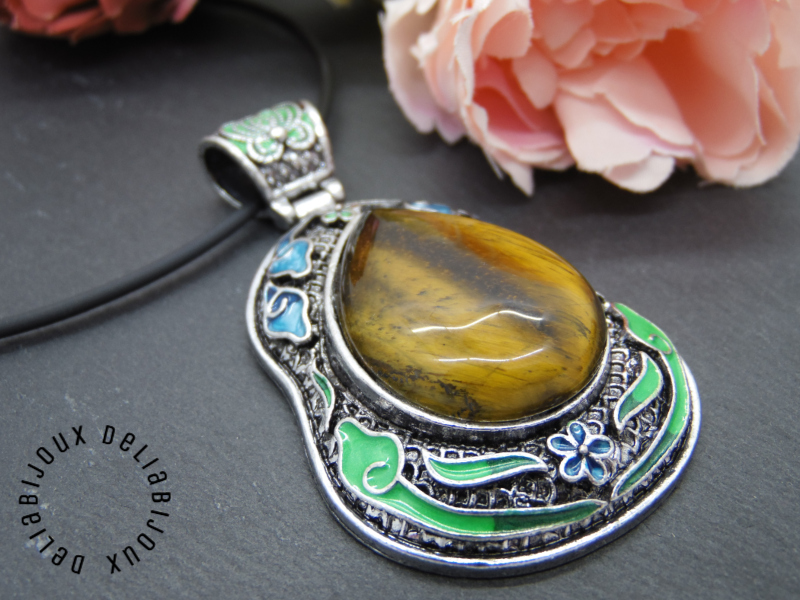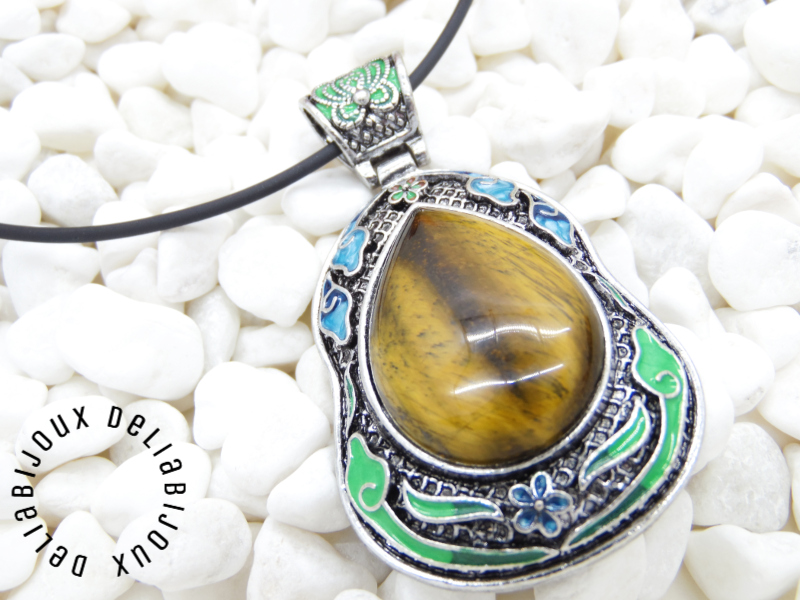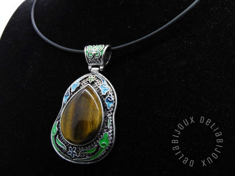 Pandantivul în formă de ochi de tigru este piesa centrală a colierului, aducând o notă de mister și protecție. Ochiul de tigru, cu nuanțele sale calde de auriu și maro, este plasat într-o montura de alama cu model filigran si email, iar detaliile fine ale pandantivului aduc un aspect realist și captivant.