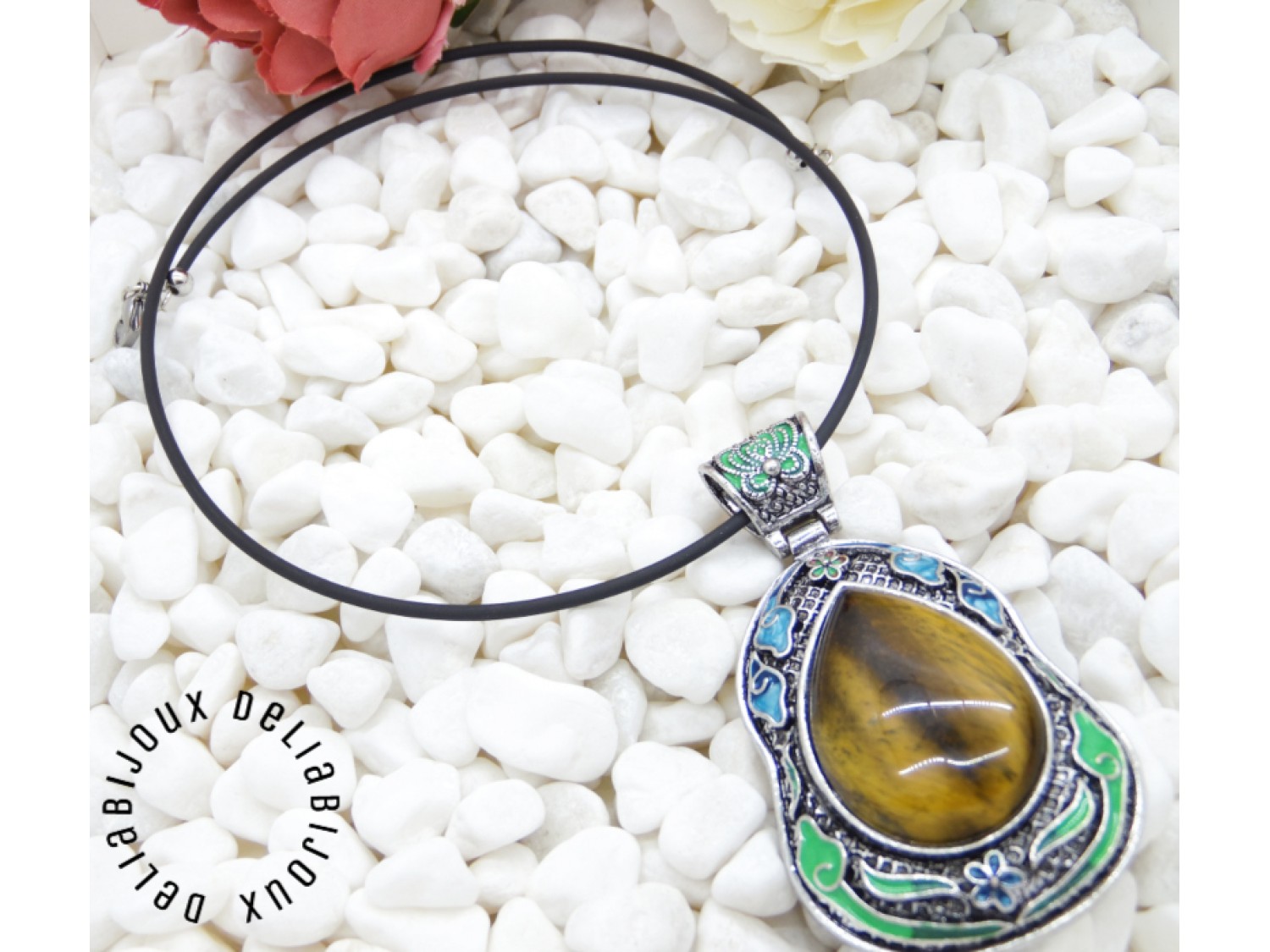 Colier cu pandantiv ochi de tigru in montura alama cu model filigran si email (dimensiune - 7 cm x 4 cm), bile inox (4 mm), tub negru silicon si elemente metalice. Inchidere tip lobster din otel inoxidabil.