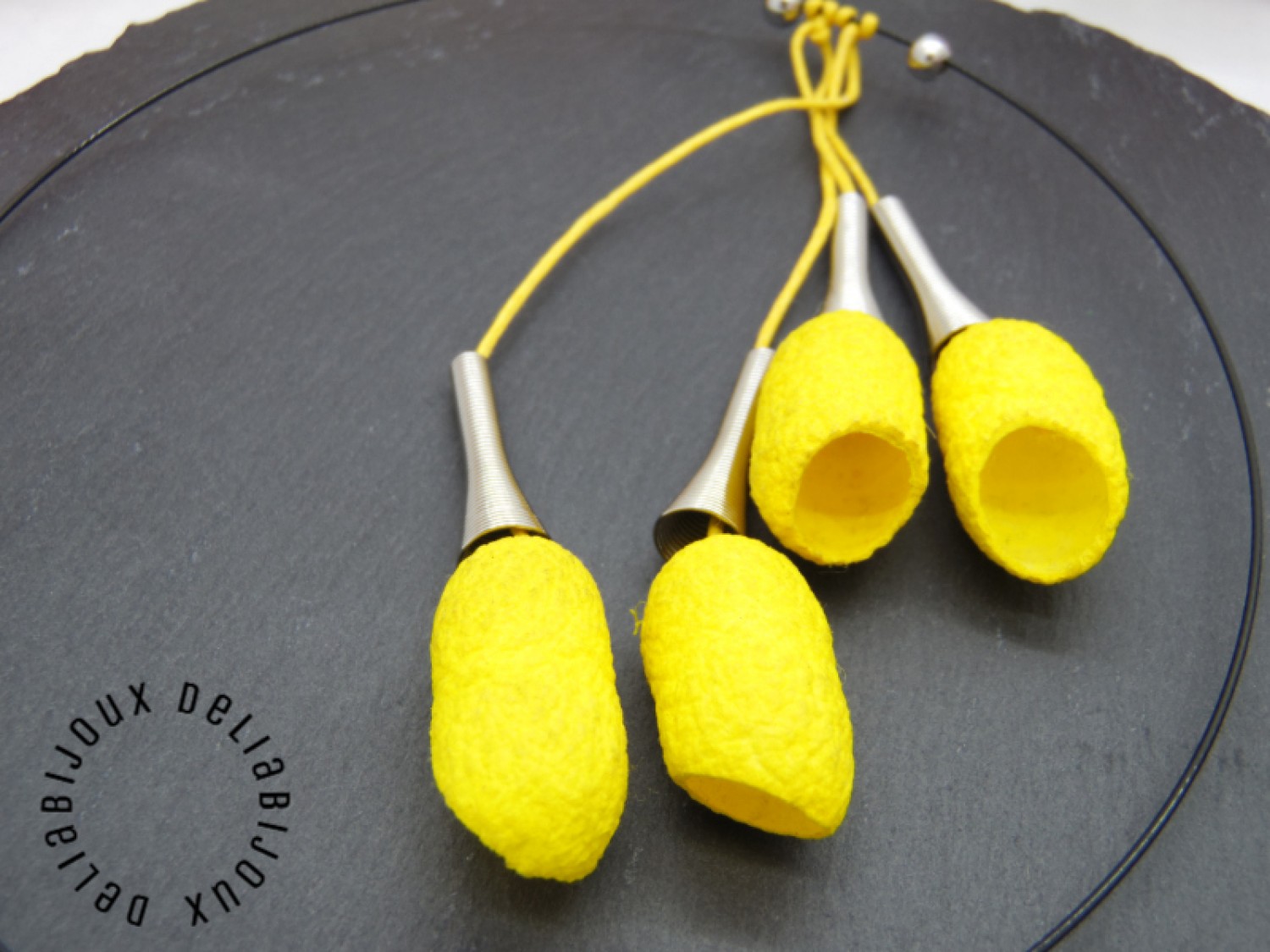 Colierul statement unicat este realizat din coconi de matase galbeni, o alegere inspirata de frumusetea naturii. Acest colier prezinta un design delicat si elegant, ce urmareste stilul modern. Fiecare cocon de mătase galben strălucește ca o rază de soare, aducând cu sine căldura și strălucirea unui răsărit de dimineață.