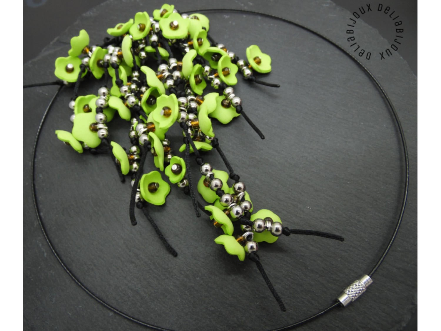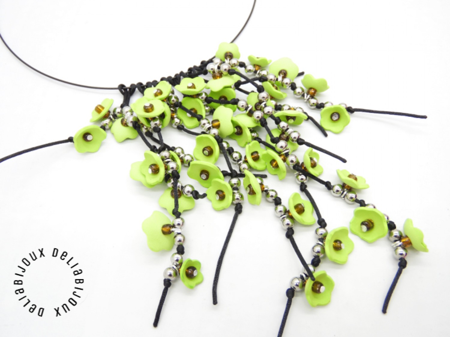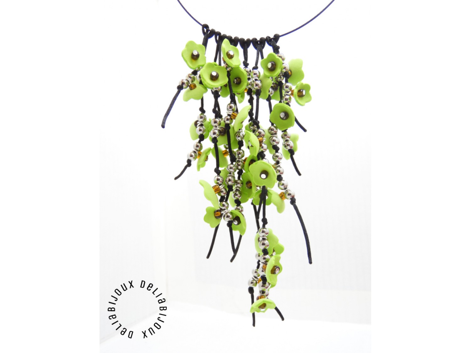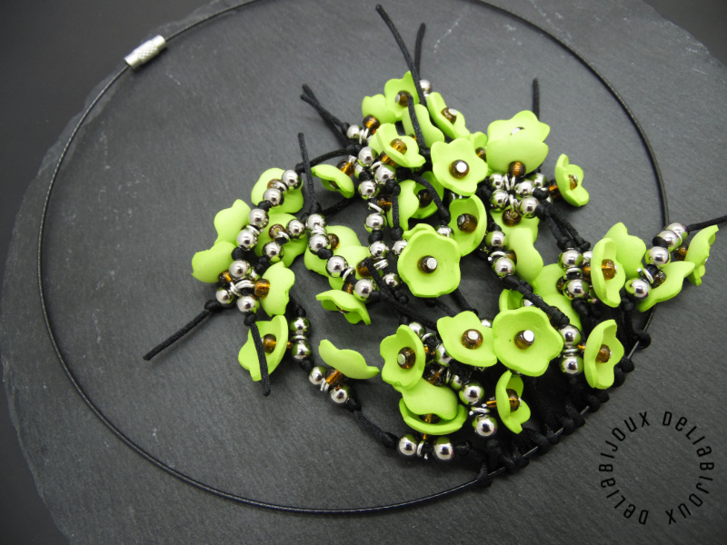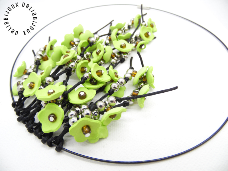 Fiecare floare este meticulos realizată, iar în centru este aplicată o mică mărgea, pentru a adăuga un detaliu subtil și strălucitor. Margelele de nisip completează designul, aducând o notă subtilă de strălucire și eleganță, care se îmbină perfect cu culorile vii ale florilor. Margelele de inox adaugă o notă subtilă de adâncime, accentuând aspectul primăvăratic al bijuteriei si completând designul într-un mod armonios. Aceste minunate flori sunt apoi atent prinse pe un snur negru de nylon.