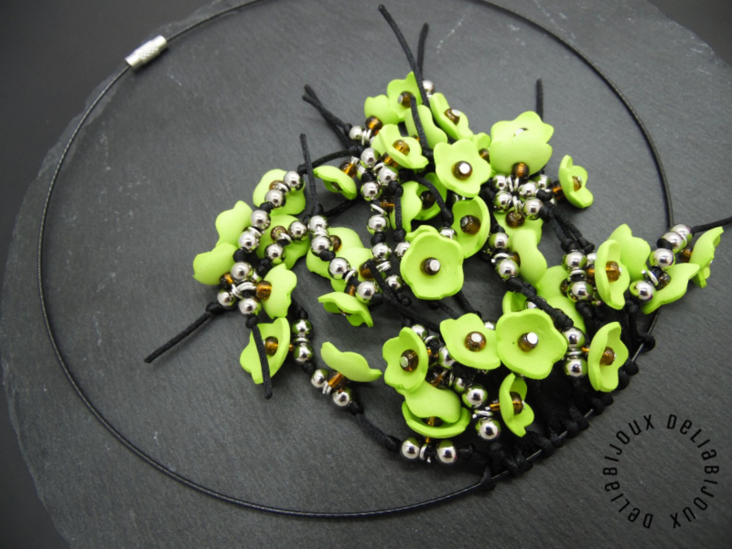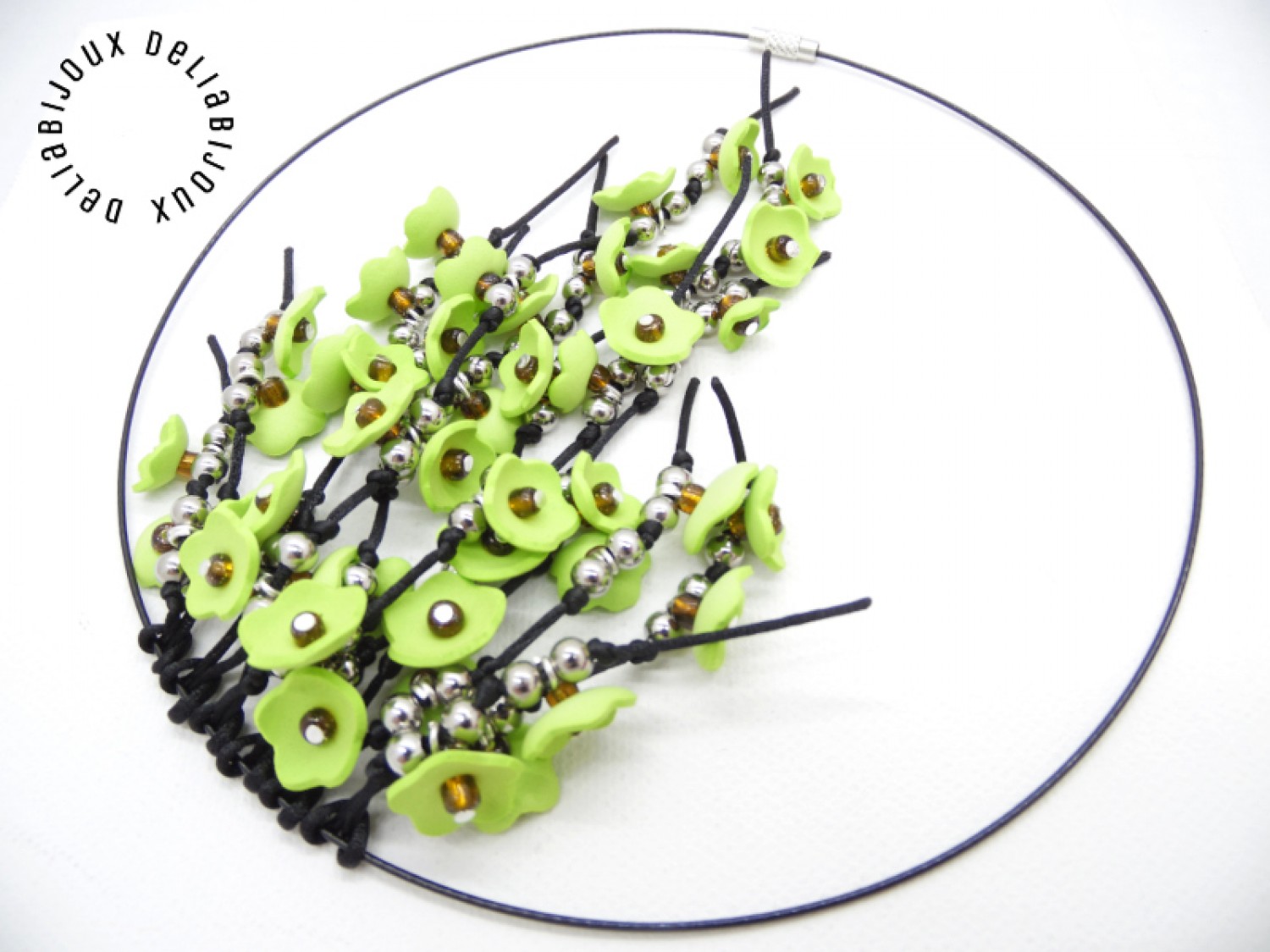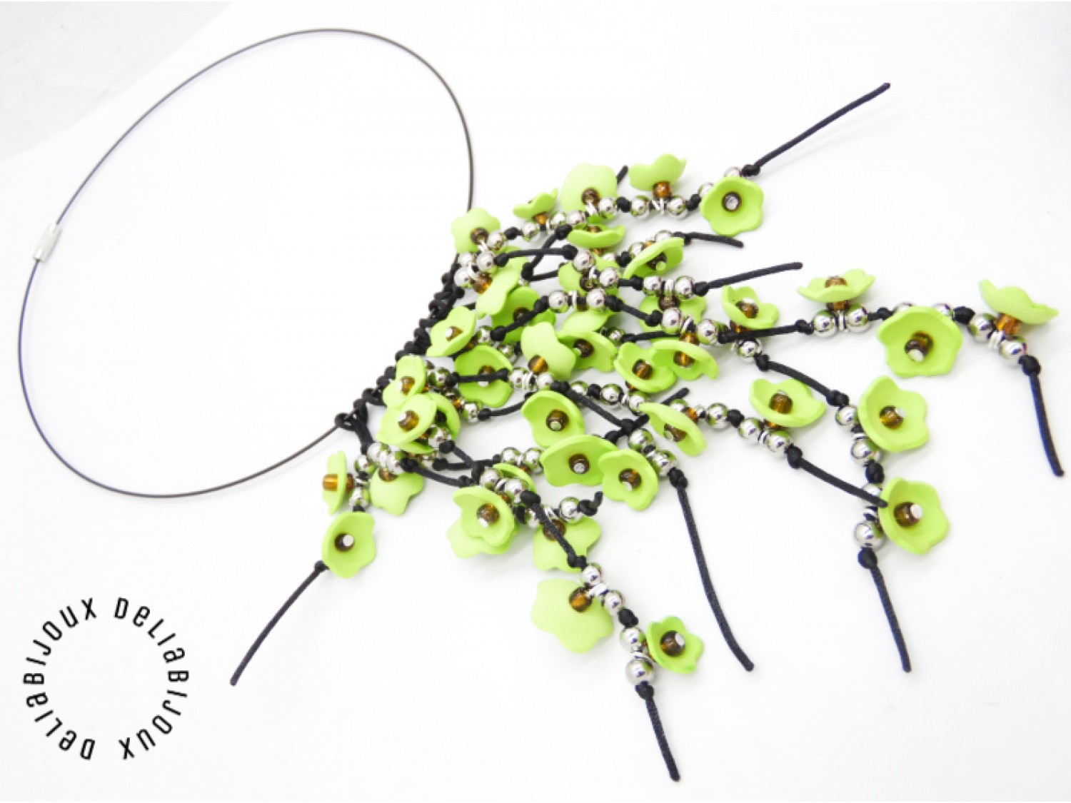 Fiecare floare este meticulos realizată, iar în centru este aplicată o mică mărgea, pentru a adăuga un detaliu subtil și strălucitor. Margelele de nisip completează designul, aducând o notă subtilă de strălucire și eleganță, care se îmbină perfect cu culorile vii ale florilor. Margelele de inox adaugă o notă subtilă de adâncime, accentuând aspectul primăvăratic al bijuteriei si completând designul într-un mod armonios. Aceste minunate flori sunt apoi atent prinse pe un snur negru de nylon.