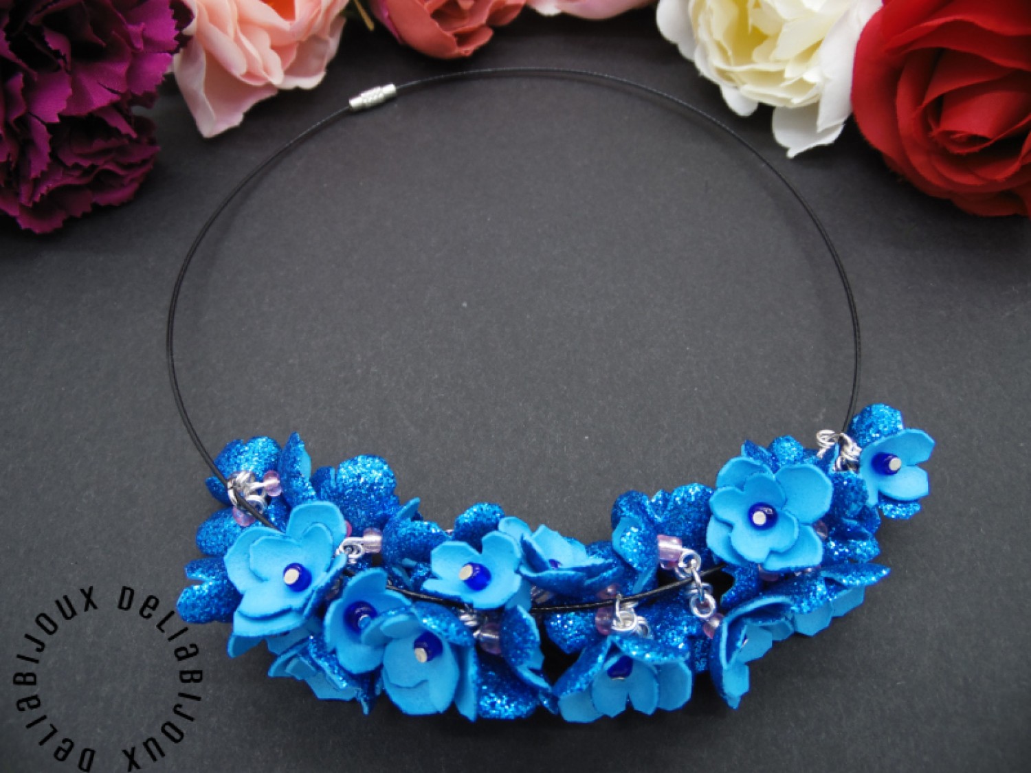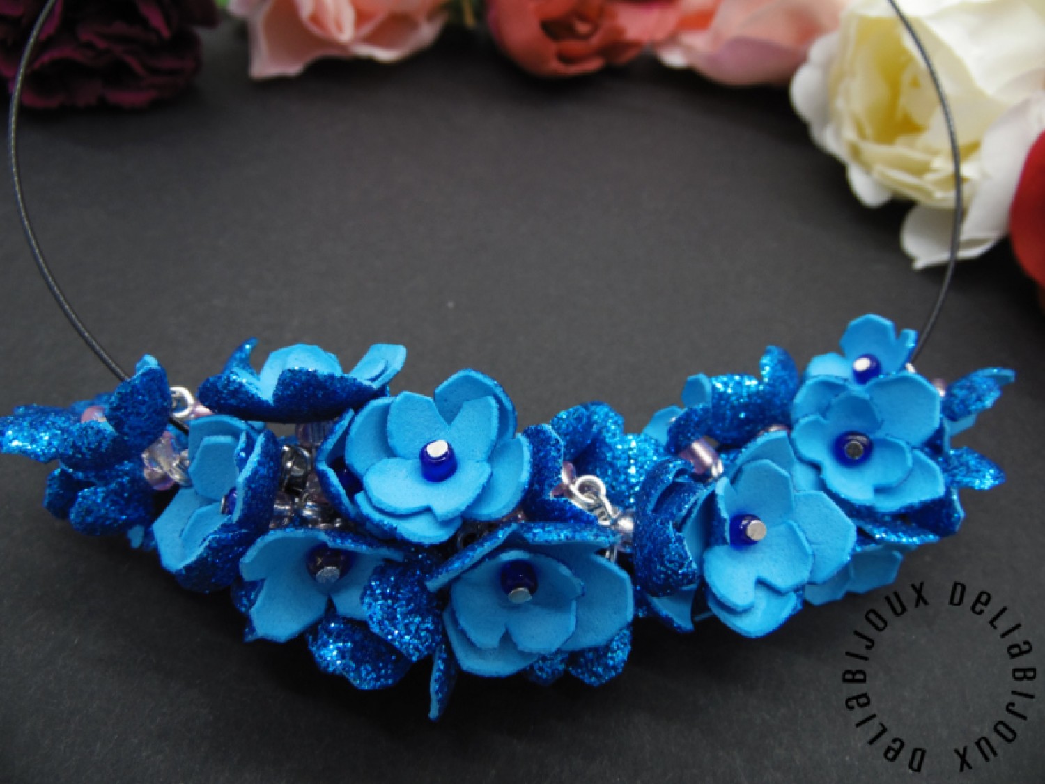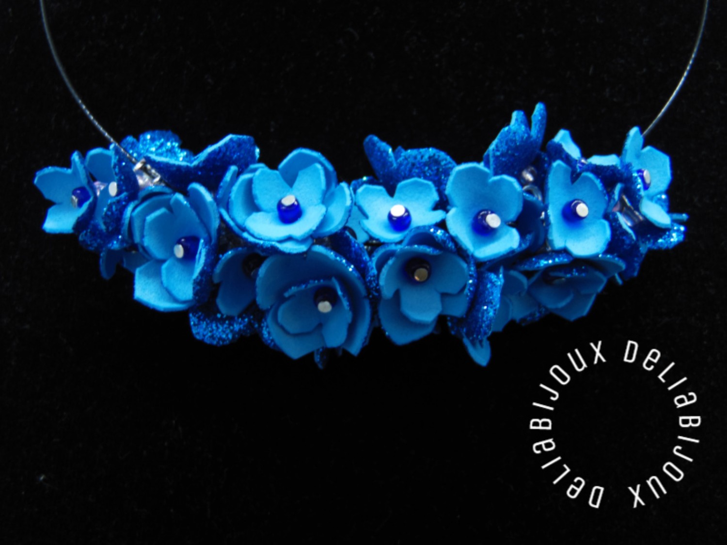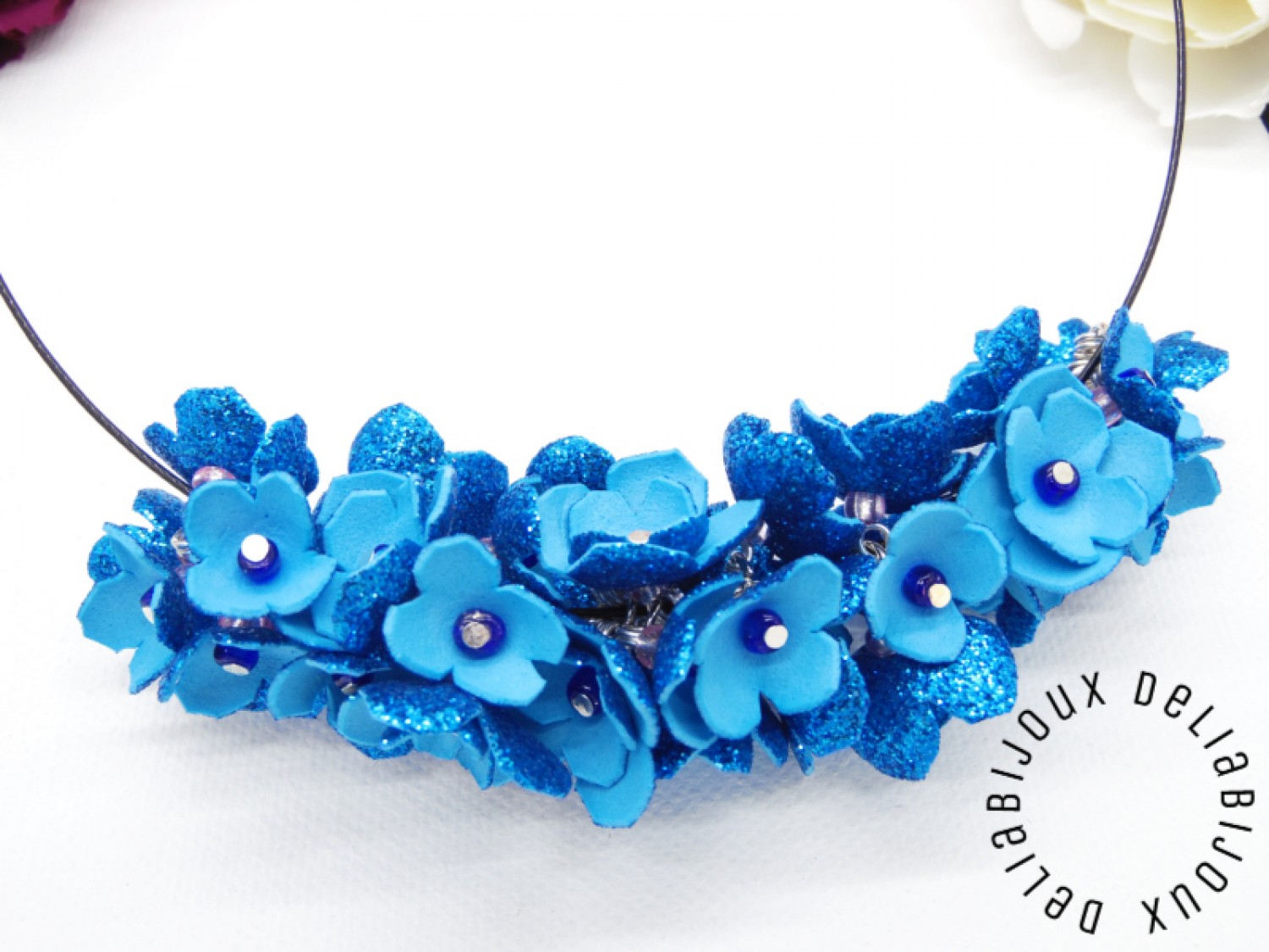 Acest colier statement este o bijuterie unică, realizată manual din foamiran albastru cu sclipici, în forme de flori. Fiecare floare este tăiată manual, modelată și asamblată pentru a crea un design delicios și vibrant. Colierul este o piesă ușoară și plăcută la atingere, care poate fi purtată în orice moment al zilei sau al serii.