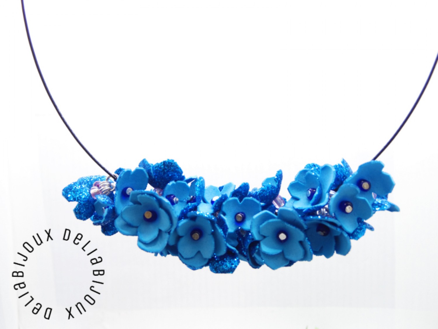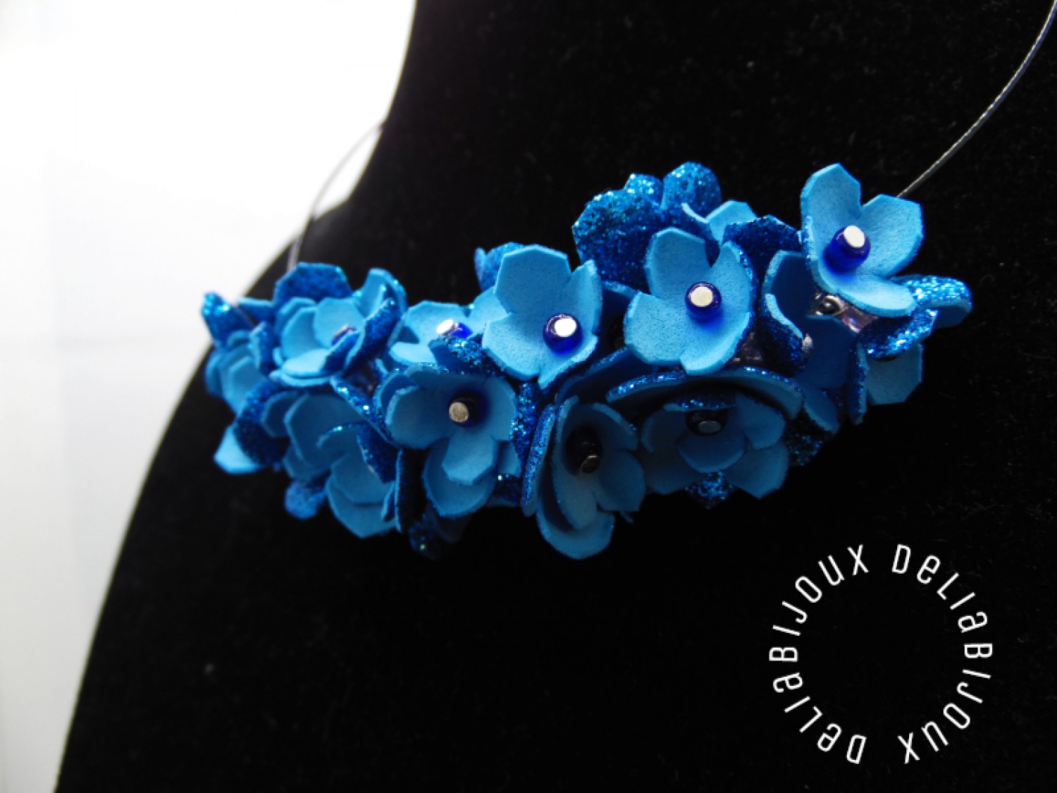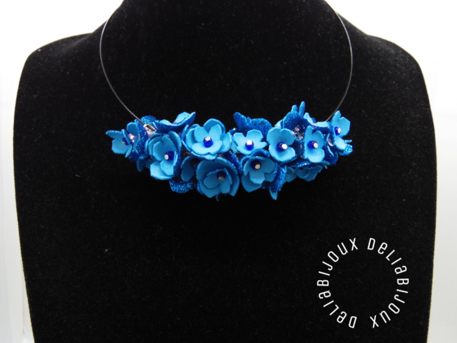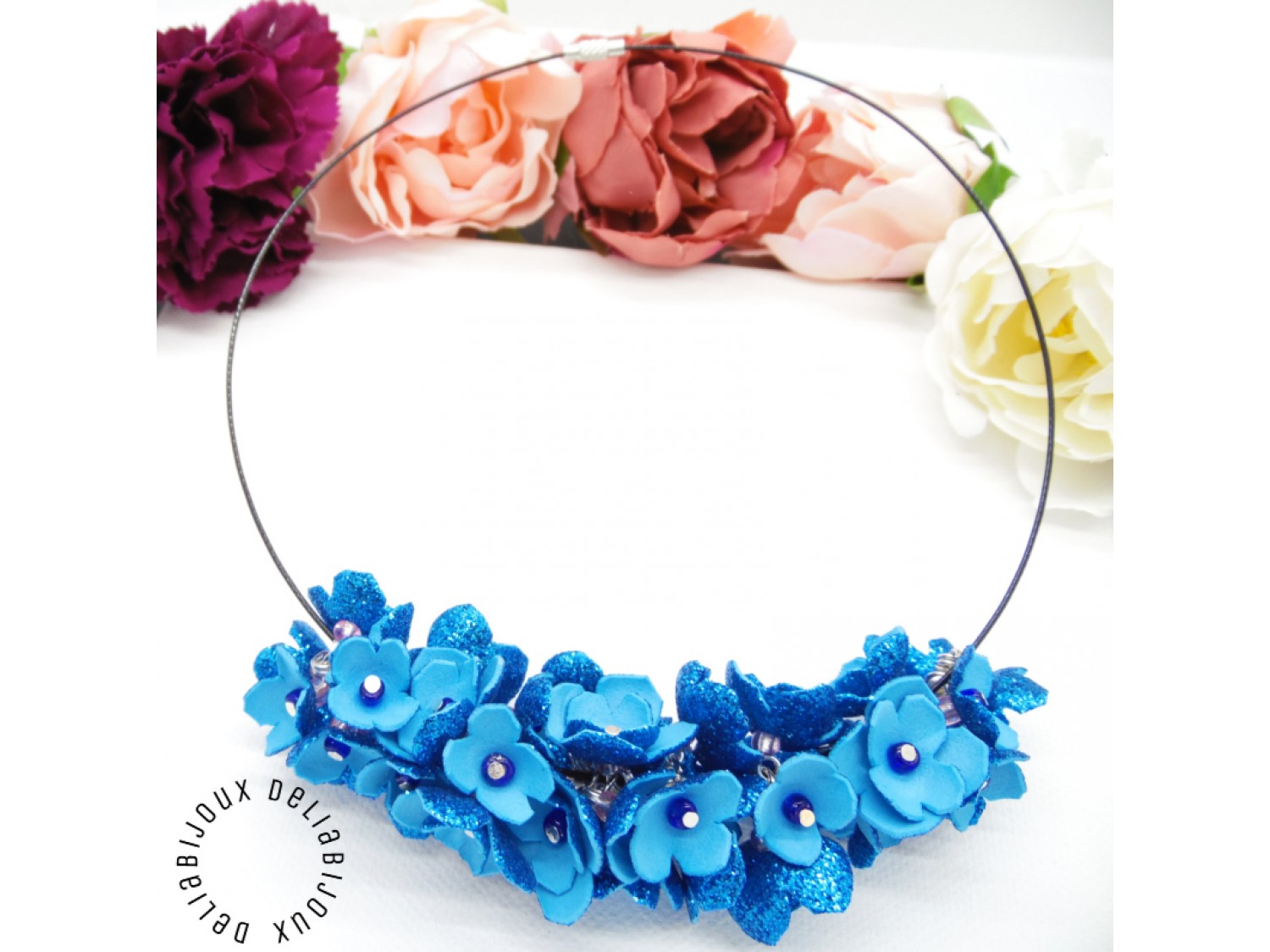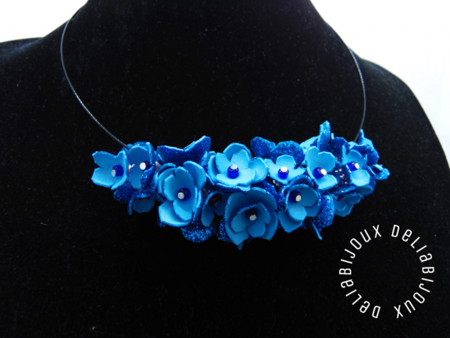 Acest colier statement este o bijuterie unică, realizată manual din foamiran albastru cu sclipici, în forme de flori. Fiecare floare este tăiată manual, modelată și asamblată pentru a crea un design delicios și vibrant. Colierul este o piesă ușoară și plăcută la atingere, care poate fi purtată în orice moment al zilei sau al serii.