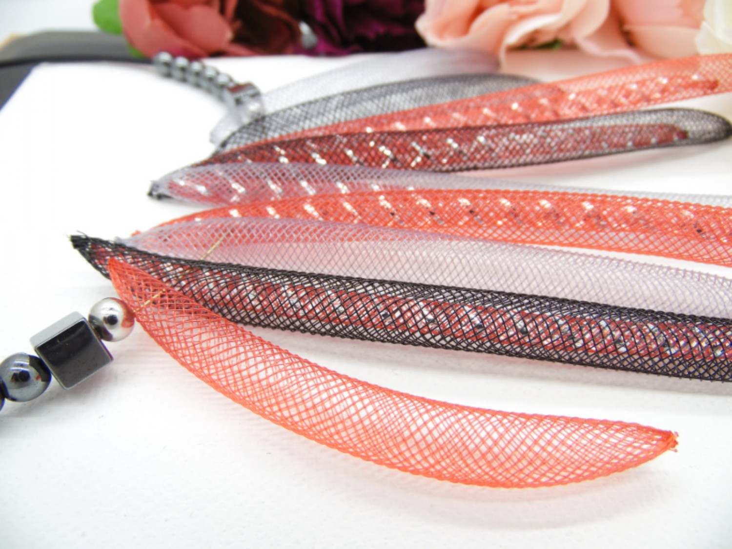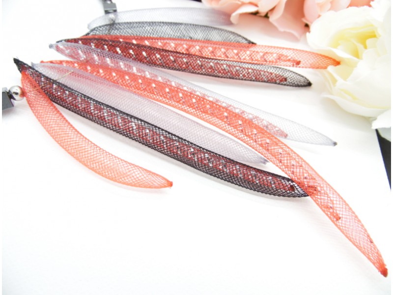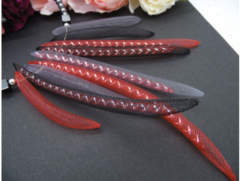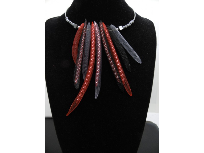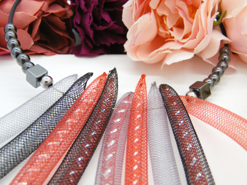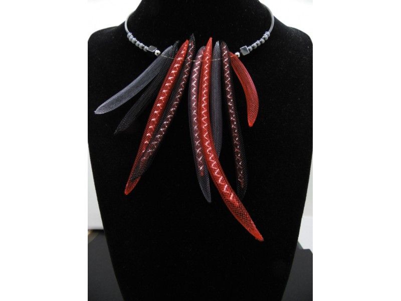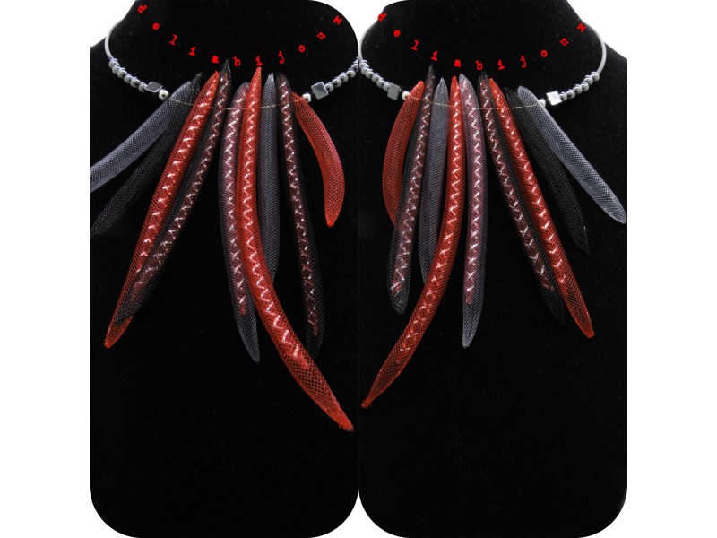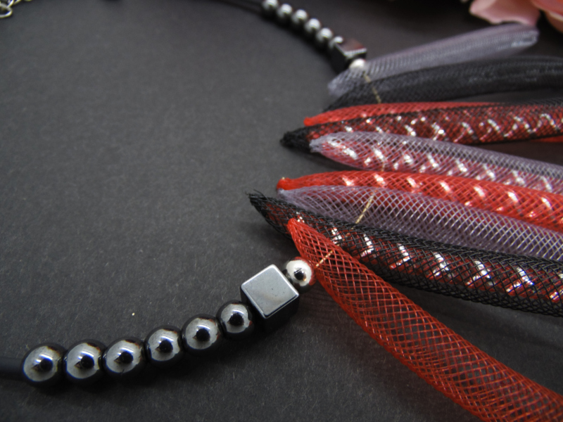 Colierul statement este un accesoriu impresionant, creat din margele de hematit și tuburi de plastic roșii, negre, gri. Margelele de hematit au diferite tonuri de gri metalic, creând un efect elegant și sofisticat. Tuburile de plastic se încadrează perfect între margelele de hematit, creând un contrast frumos.