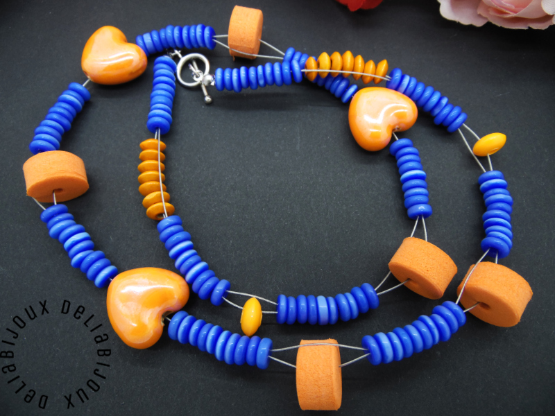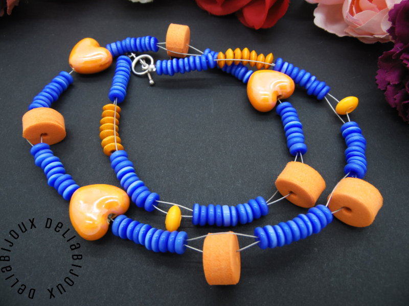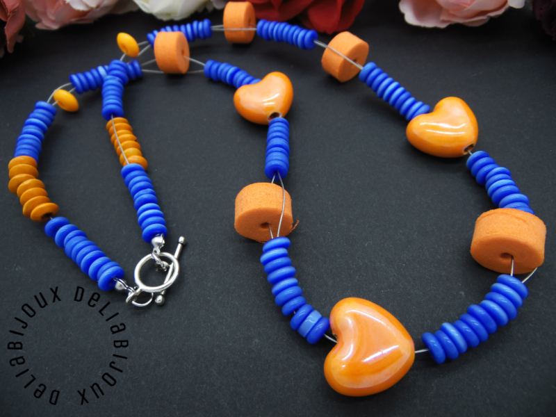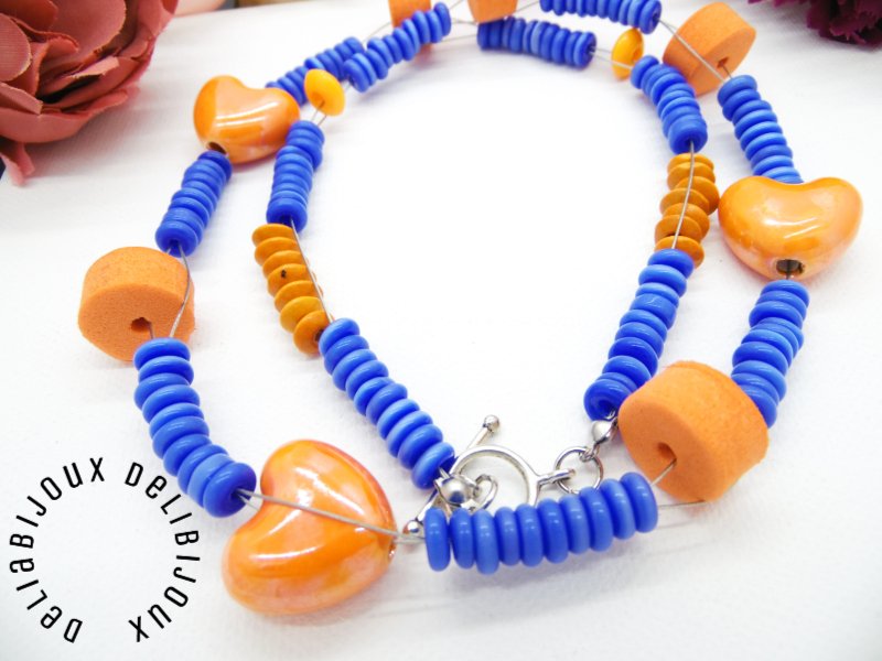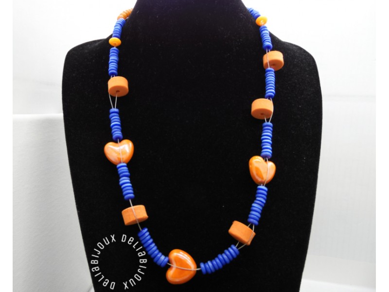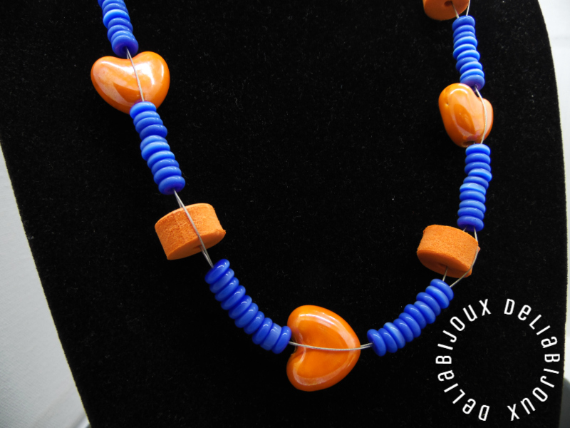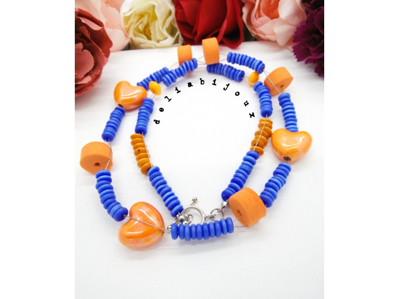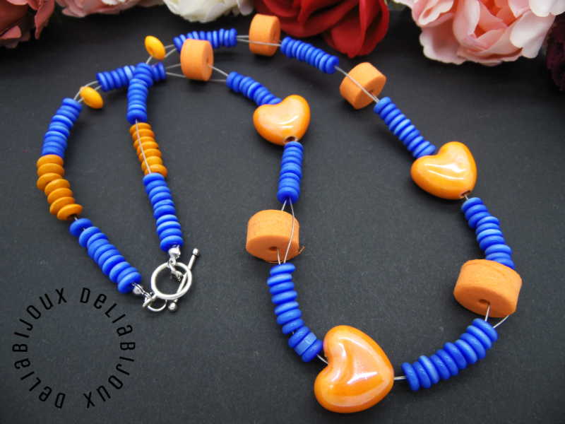 Acest colier handmade-statement este o bijuterie fermecătoare, plină de culoare și veselie, creată cu migală și atenție la detalii. Acesta este alcătuit dintr-o combinație încântătoare de mărgele de ceramică în formă de inimi portocalii, mărgele de spumă portocalii, discuri de lemn portocalii și discuri de sticlă albastre, ce adaugă un contrast atrăgător.