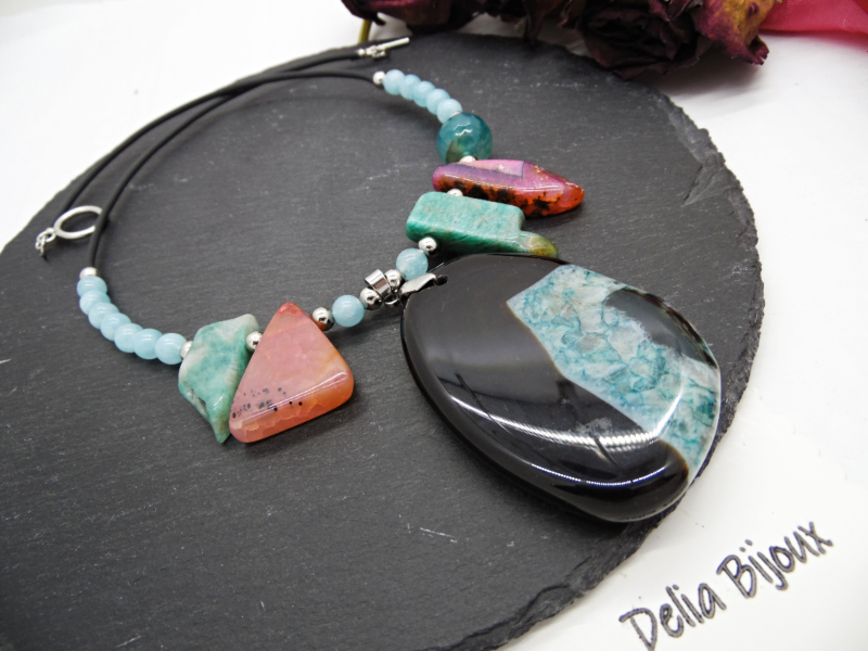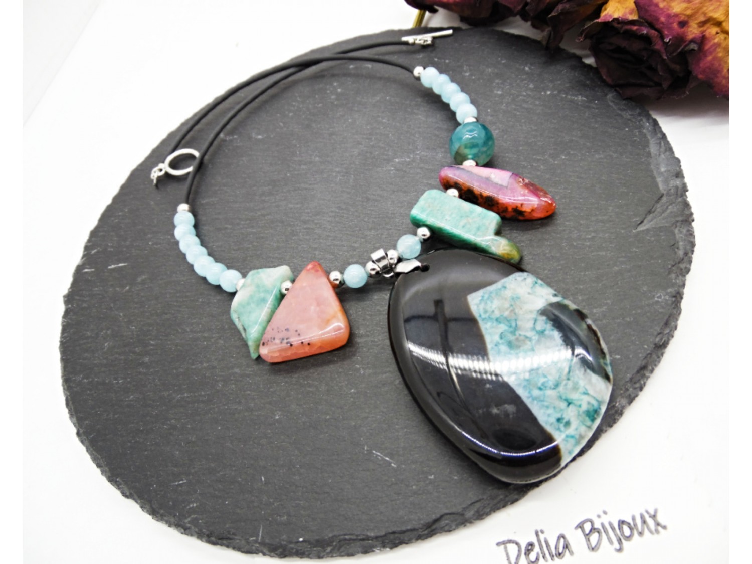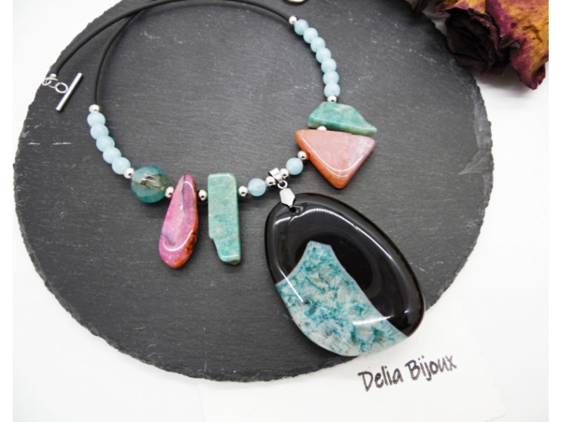 Un colier original și expresiv, realizat manual, care îmbină armonios culorile naturale ale pietrelor semiprețioase.