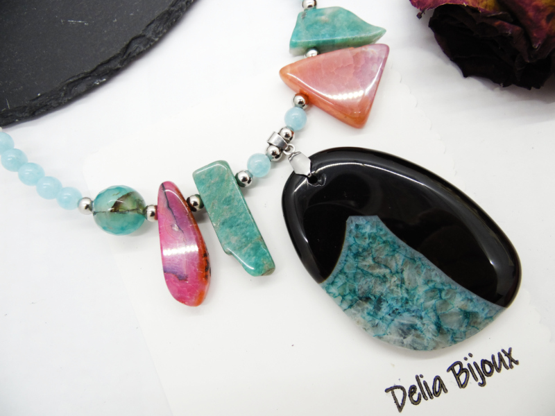Colier handmade unicat agate, amazonit, angelit (cod1355)