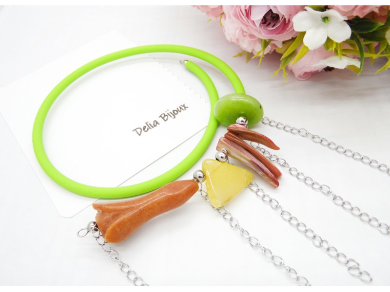 În compoziție se regăsește și o piatră verde crud de agat, care armonizează perfect cu baza colierului, accentuând tematica naturală și proaspătă.