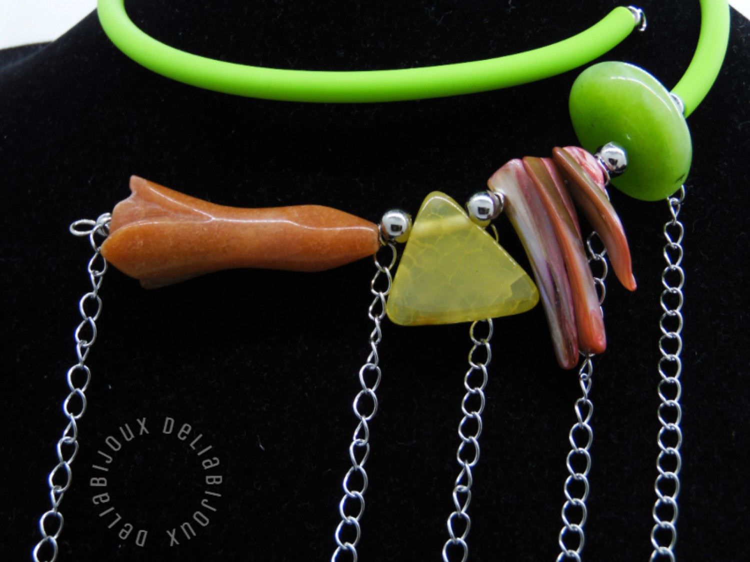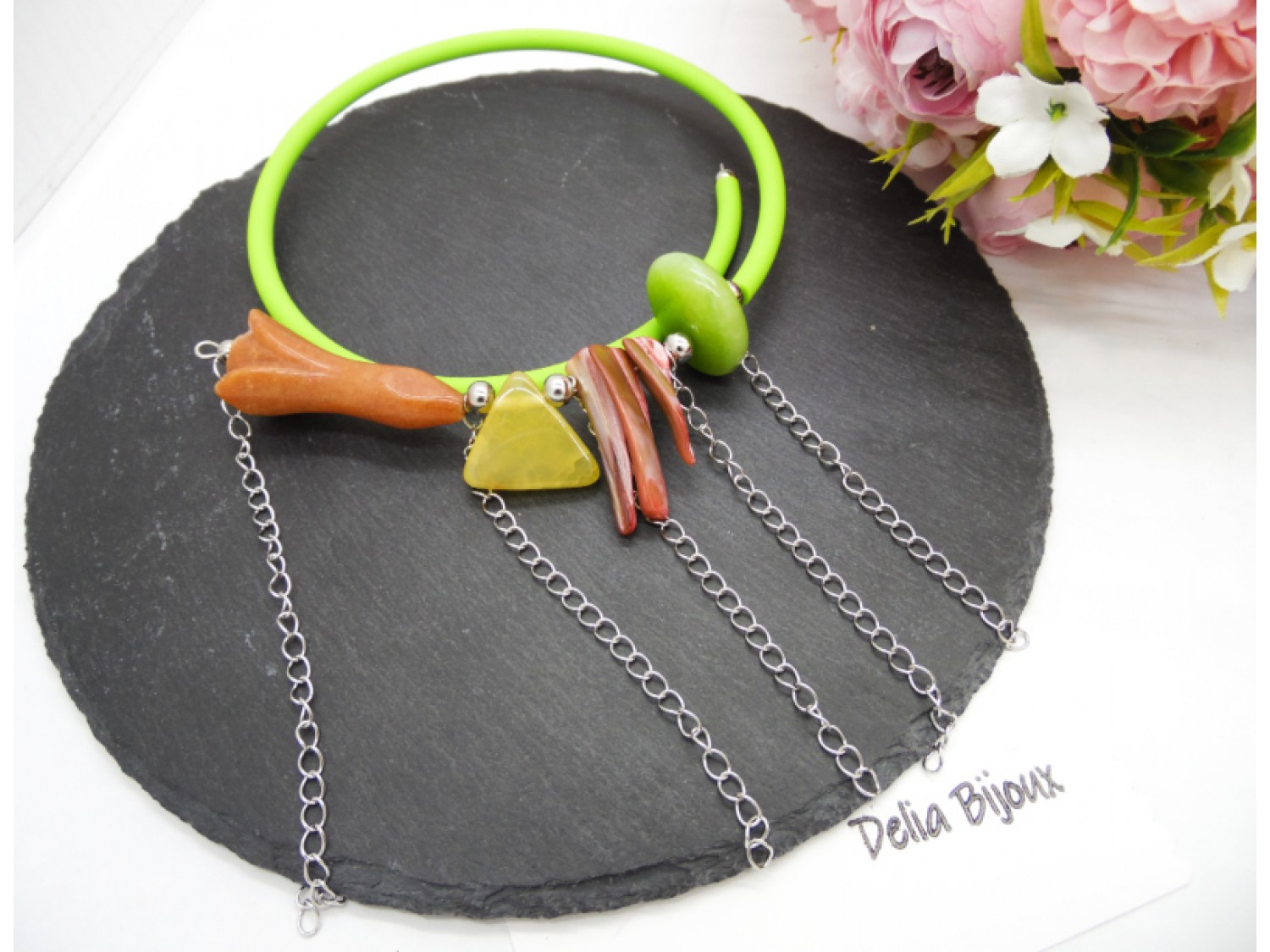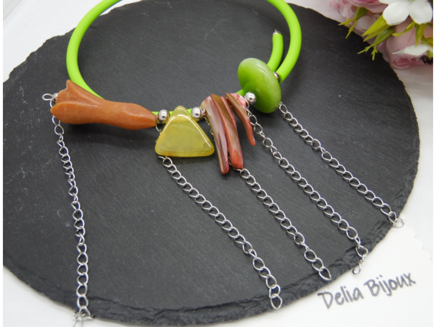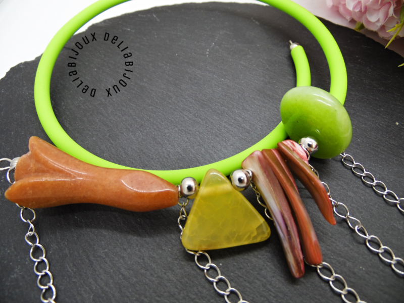Colier handmade, statement, asimetric, la baza gatului, realizat din agatsculptat floare (45 mm x 18 mm), agat crackle triunghi (22 mm - prezinta mici imperfectiuni naturale), sidef ( intre 27 si 34 mm), agat (25/10 mm- prezinta mici imperfectiuni naturale), bile inox (6 mm, 5 mm), tub silicon verde, lant otel inoxidabil ( 12 cm -> 8 cm). Fara inchidere.