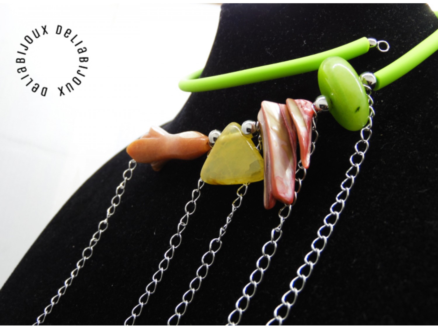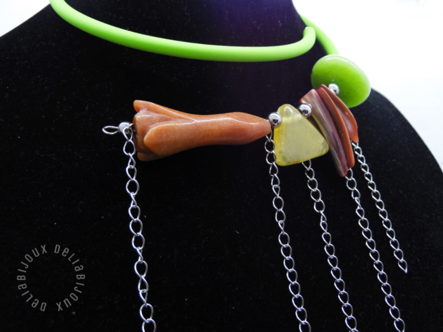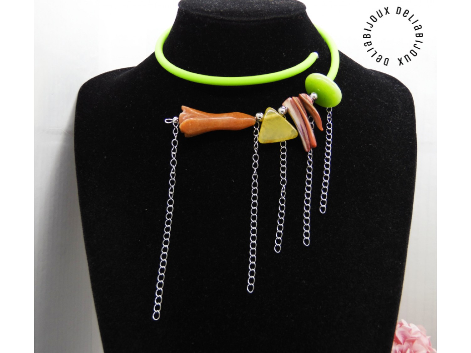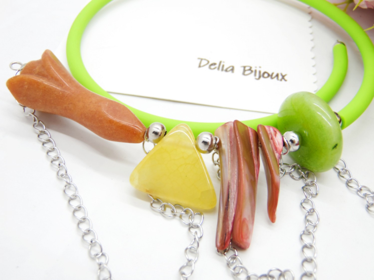 Colier handmade, statement, asimetric, la baza gatului, realizat din agatsculptat floare (45 mm x 18 mm), agat crackle triunghi (22 mm - prezinta mici imperfectiuni naturale), sidef ( intre 27 si 34 mm), agat (25/10 mm- prezinta mici imperfectiuni naturale), bile inox (6 mm, 5 mm), tub silicon verde, lant otel inoxidabil ( 12 cm -> 8 cm). Fara inchidere.