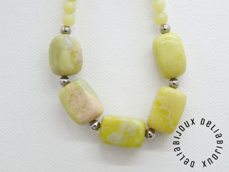 Colier handmade unicat realizat din agate dreptunghi (aprox 18 mm x 12 mm -> prezinta mici imperfectiuni naturale, fiecare piatra fiind unica), peridot sfere (6 mm, 4 mm), bile otel inoxidabil (5 mm), elemente metalice. Inchidere tip toggle din otel inoxidabil (14 mm).