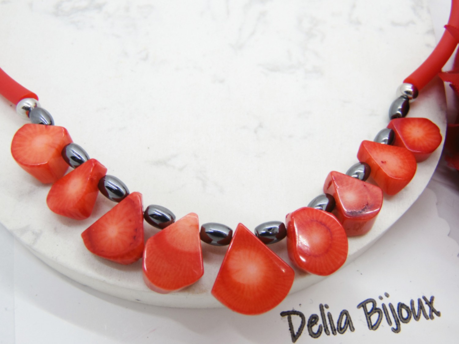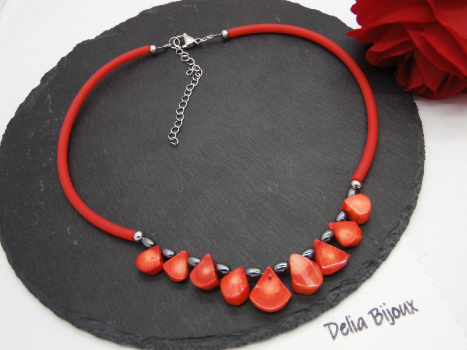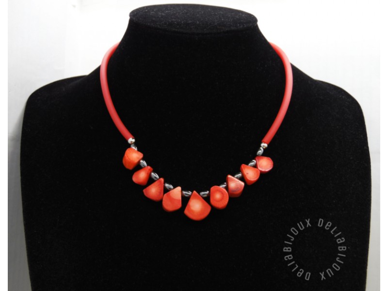 Acest colier handmade îmbină armonios elemente vibrante și sofisticate, rezultând o piesă deosebită și elegantă. Baza colierului este realizată dintr-un tub de cauciuc roșu intens, care oferă un aspect modern și flexibilitate. În centrul său, se află un aranjament spectaculos de fulgi de coral, ale căror nuanțe de roșu - portocaliu adaugă un plus de energie și dinamism bijuteriei. Datorită naturii organice a coralului, acesta prezintă mici estompări de culoare, ceea ce adaugă unicitate și caracter bijuteriei.
