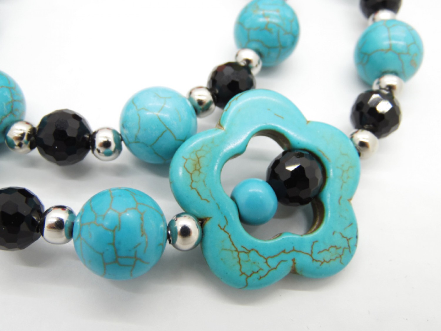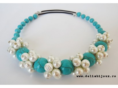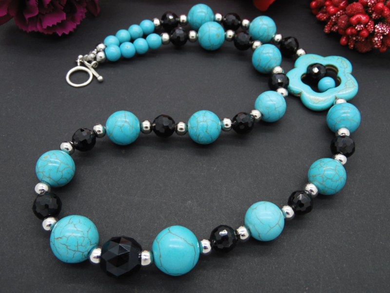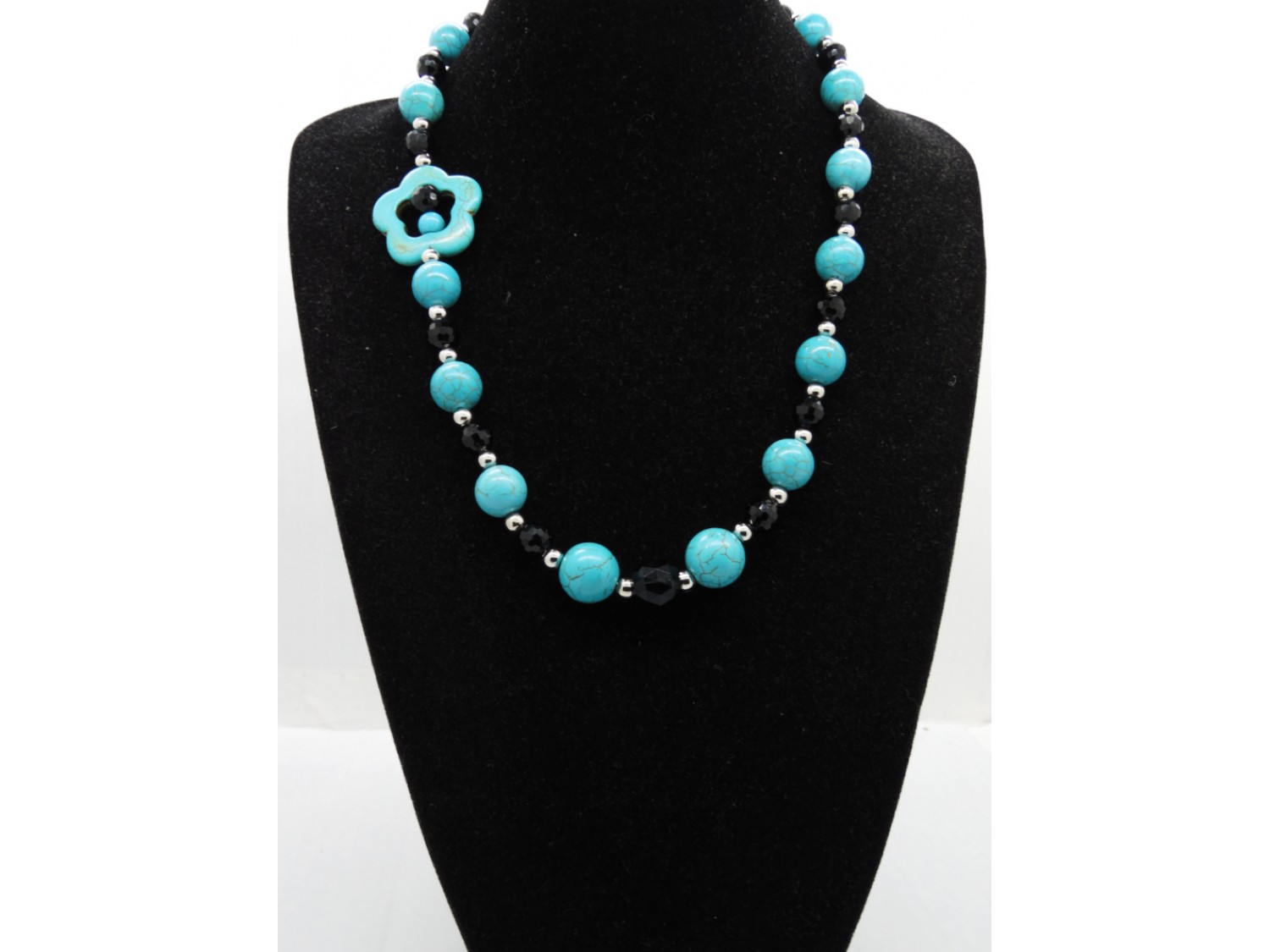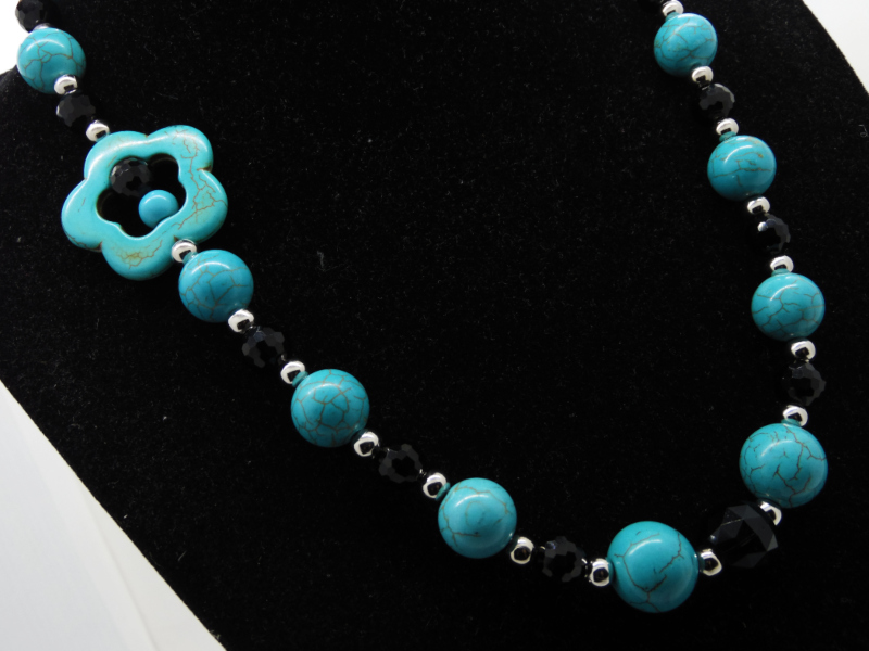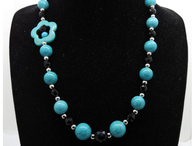 Colier handmade unicat, asimetric, realizat din turcoaz reconstituit floare (34 mm), turcoaz reconstituit sfere (16 mm , 14 mm, 8 mm), cristale fatetate (14 mm, 6 mm), bile otel inoxidabil ( 6 mm), elemente metalice. Inchidere tip toggle. Lungimea colierului - 57 cm.