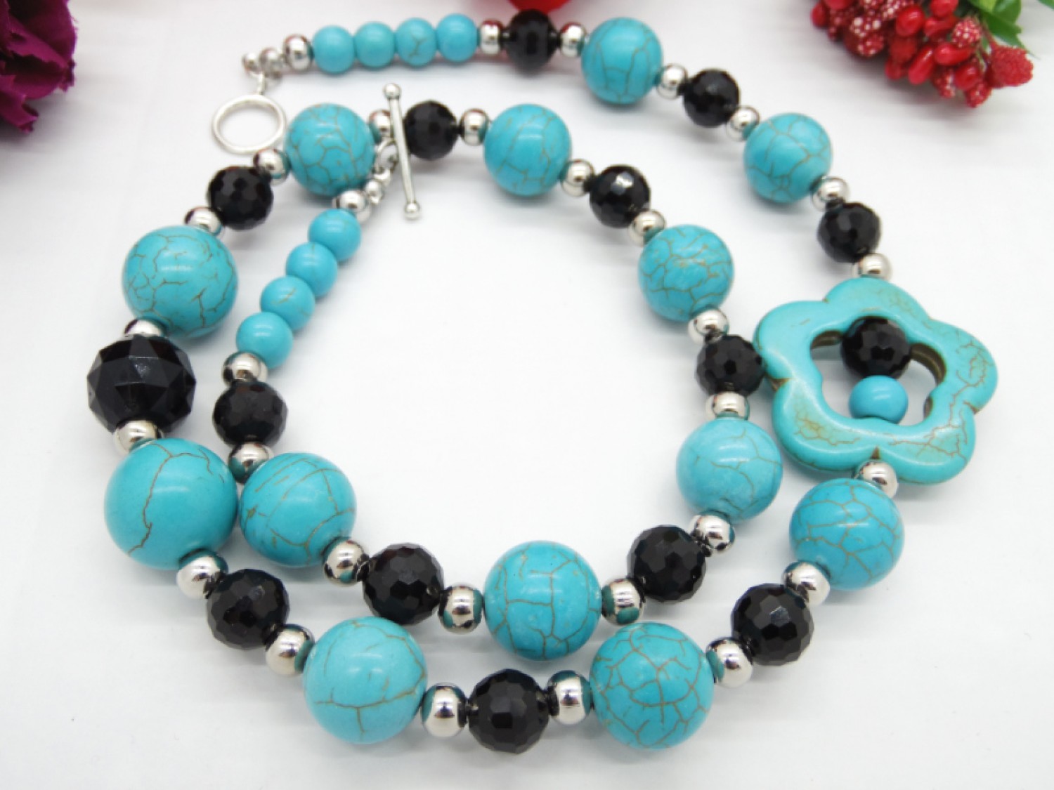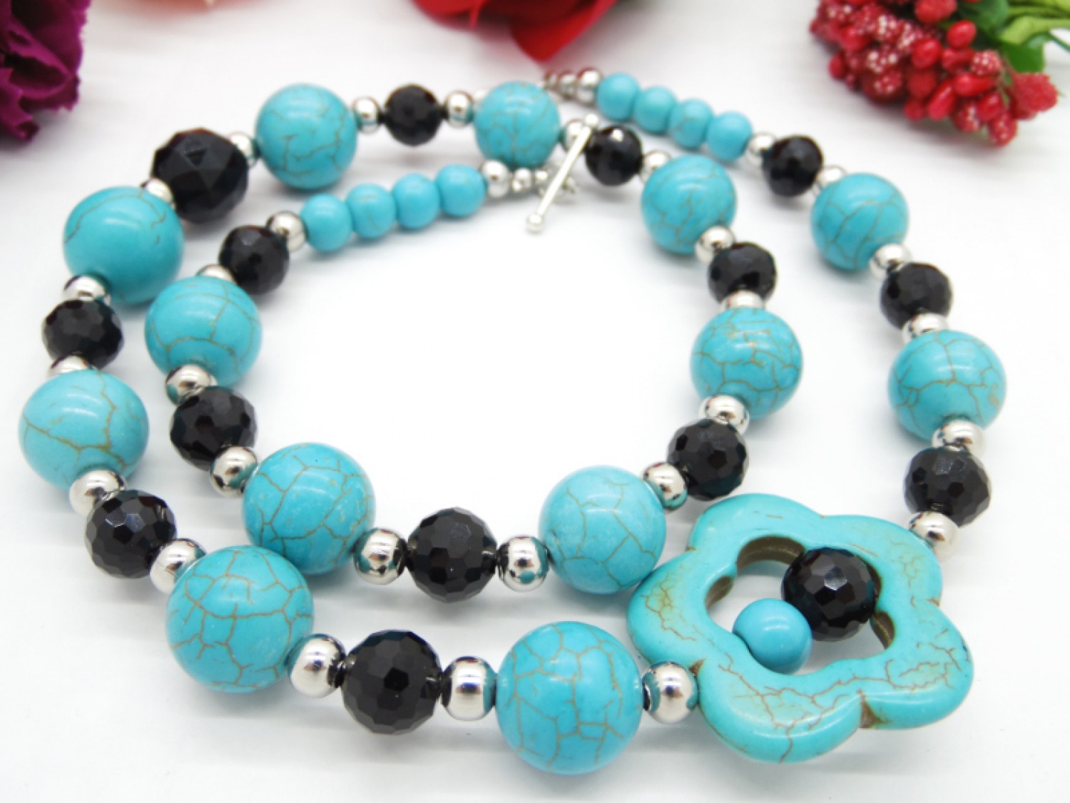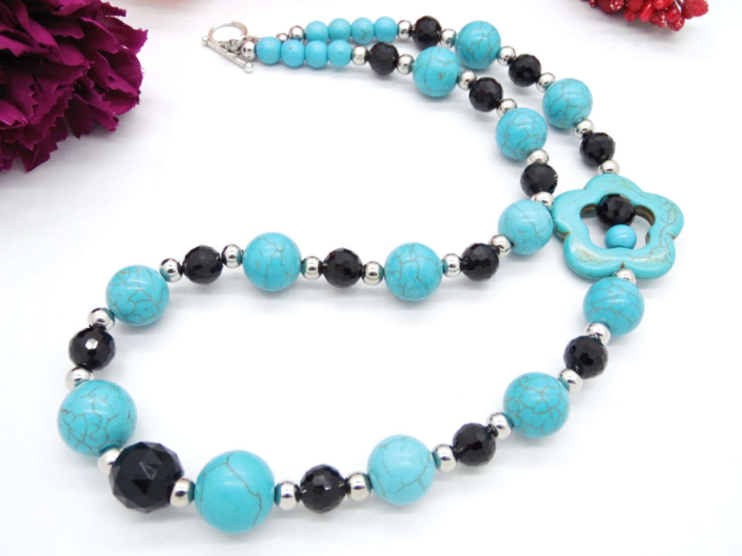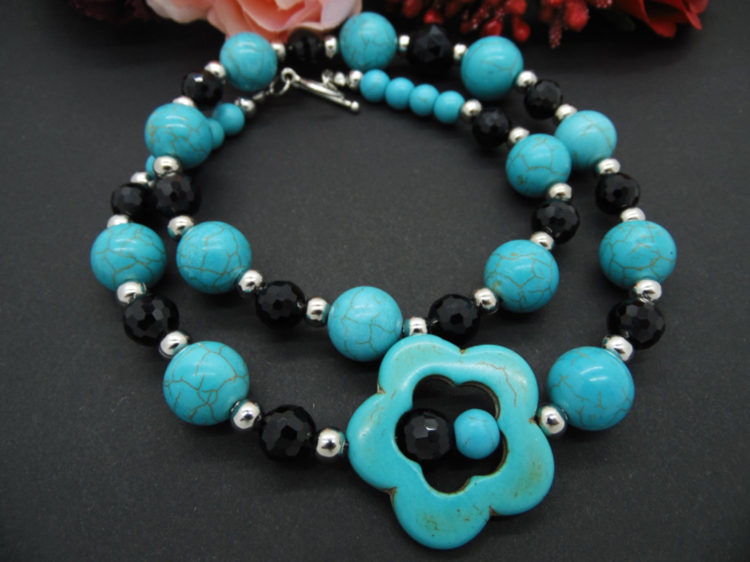 Colier handmade unicat, asimetric, realizat din turcoaz reconstituit floare (34 mm), turcoaz reconstituit sfere (16 mm , 14 mm, 8 mm), cristale fatetate (14 mm, 6 mm), bile otel inoxidabil ( 6 mm), elemente metalice. Inchidere tip toggle. Lungimea colierului - 57 cm.