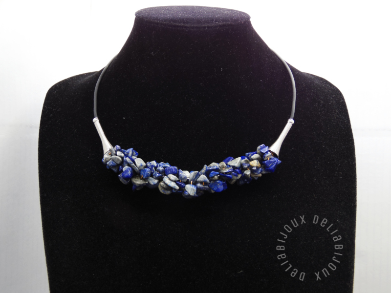 Colier handmade, la baza gatului, realizat din chipsuri lapis lazuli, bile otel inoxidabil (5 mm, 4 mm), tub cauciuc, elemente metalice, sarma de modelaj cupru non-tarnish (nu oxideaza, nu se pateaza si nu isi pierde aspectul initial). Inchidere tip lobster din otel inoxidabil.