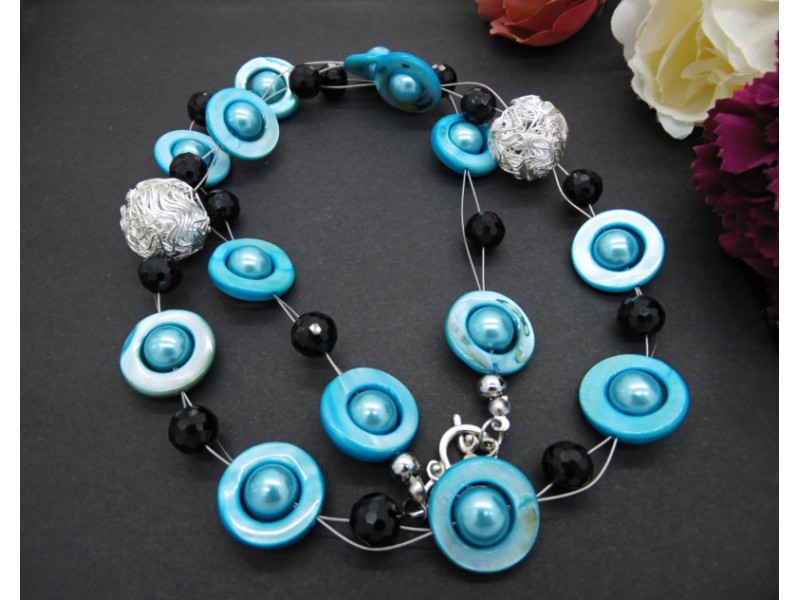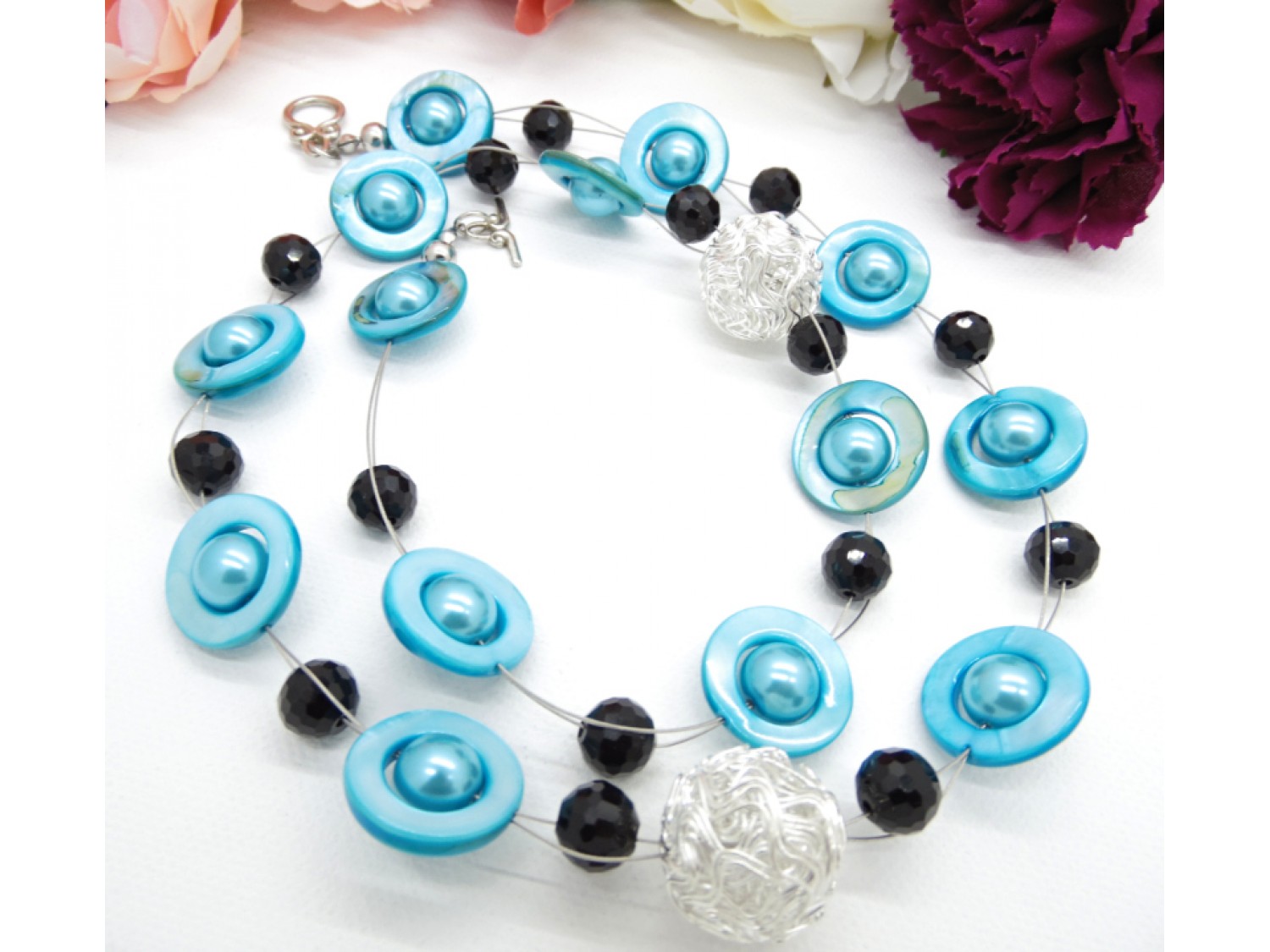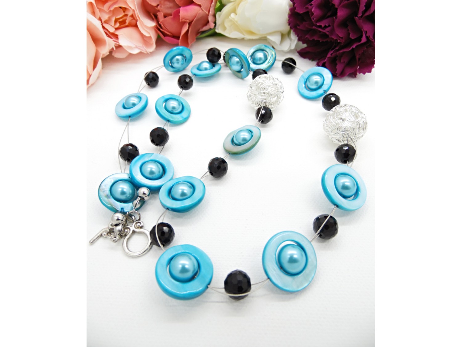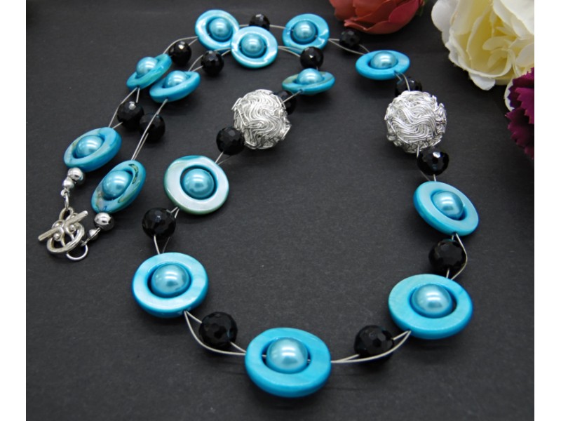 Colierul este realizat manual și conține perle din sticla și sidef, aranjate într-un mod unic. Perlele din sticla sunt perfect rotunde, iar culorile se îmbină perfect, combinatia acestor culori (negru si turcoaz) este una armonioasa si contrastanta in acelasi timp, oferind un aspect distinct si sofisticat.