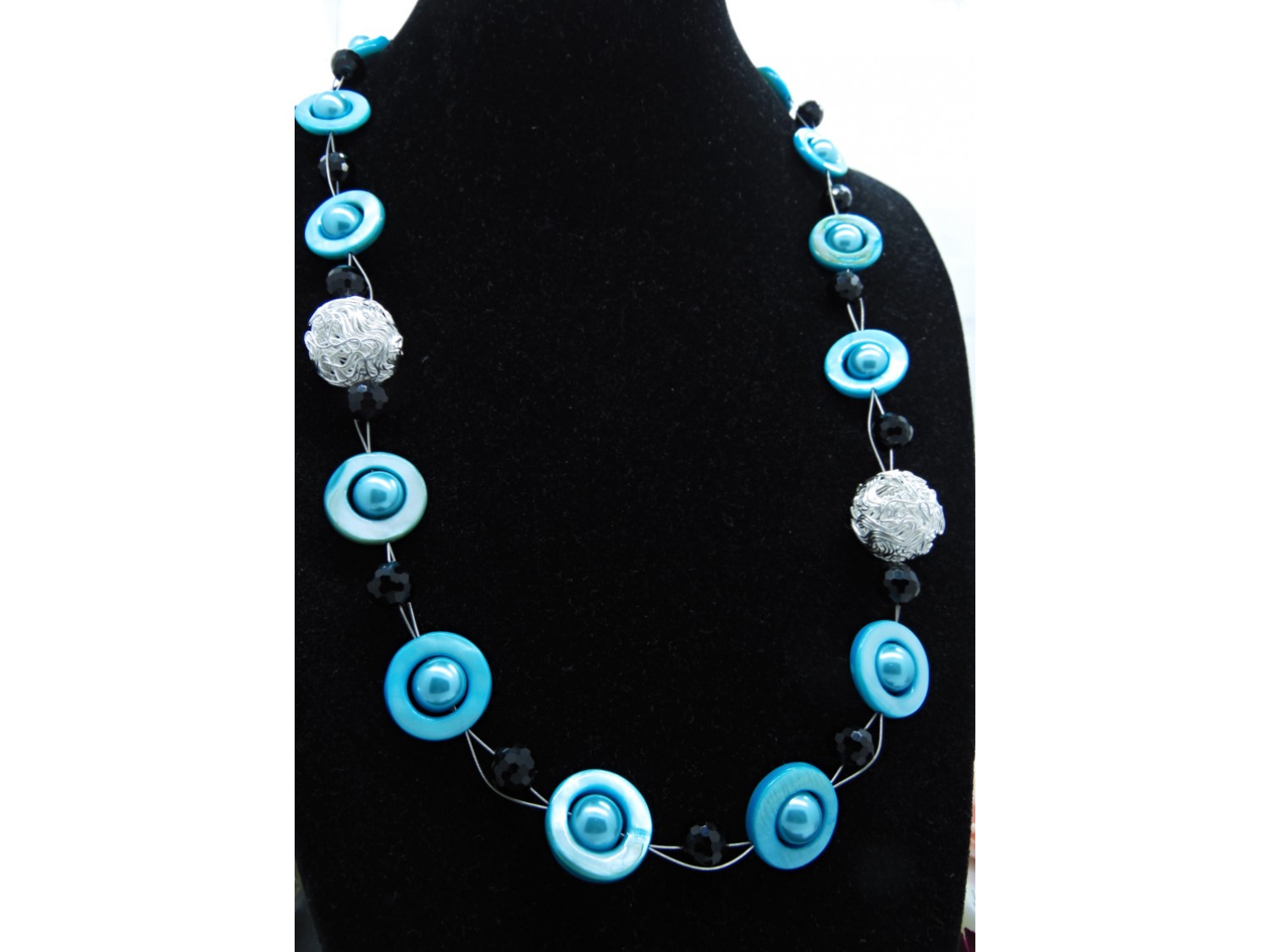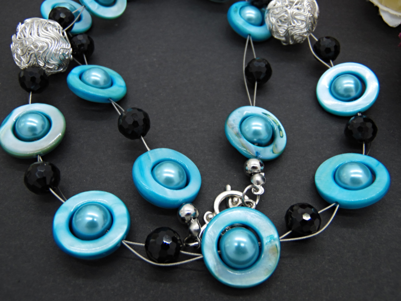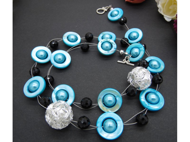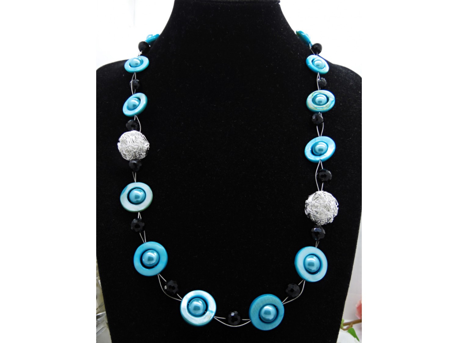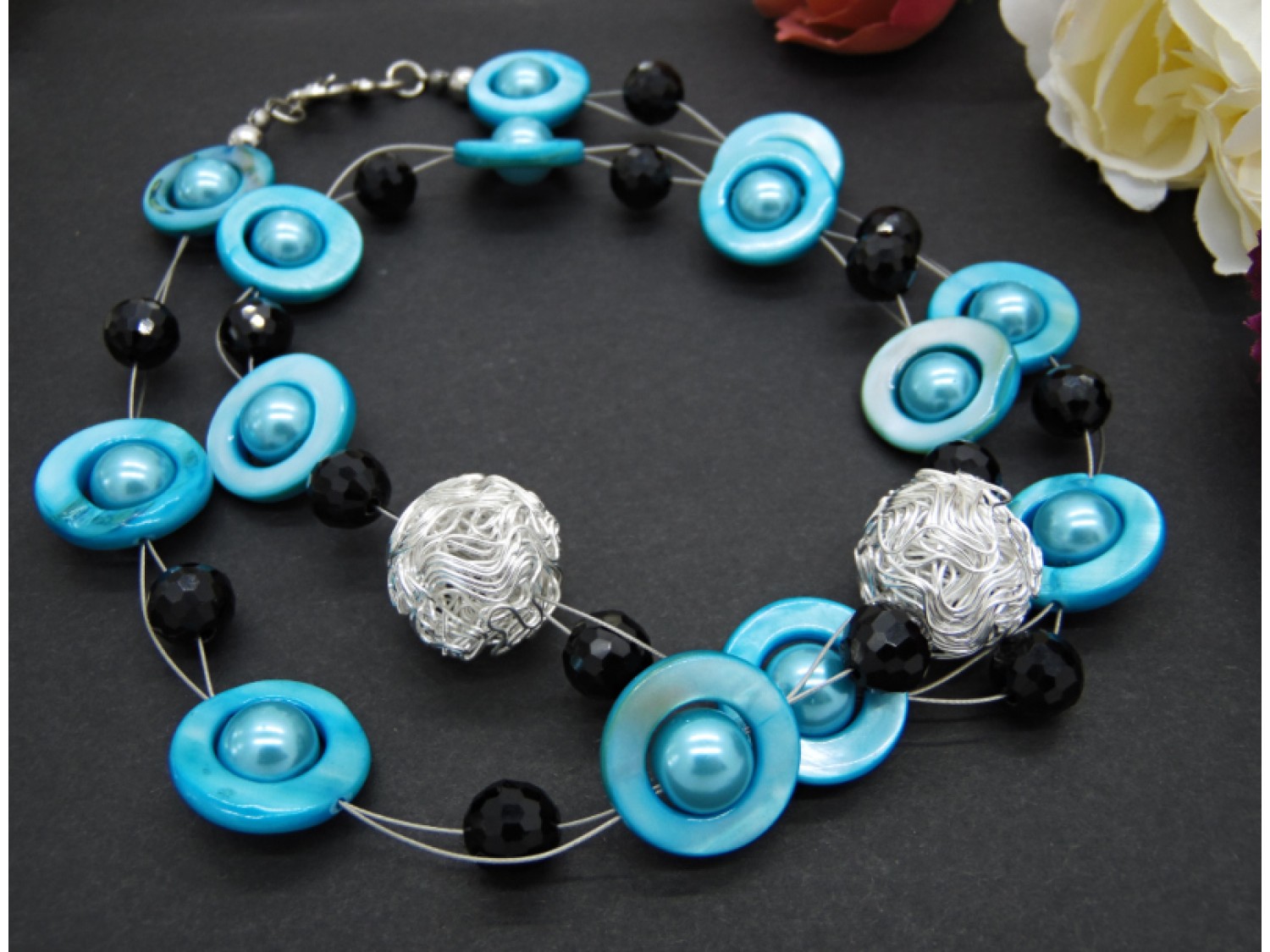 Colierul este realizat manual și conține perle din sticla și sidef, aranjate într-un mod unic. Perlele din sticla sunt perfect rotunde, iar culorile se îmbină perfect, combinatia acestor culori (negru si turcoaz) este una armonioasa si contrastanta in acelasi timp, oferind un aspect distinct si sofisticat.