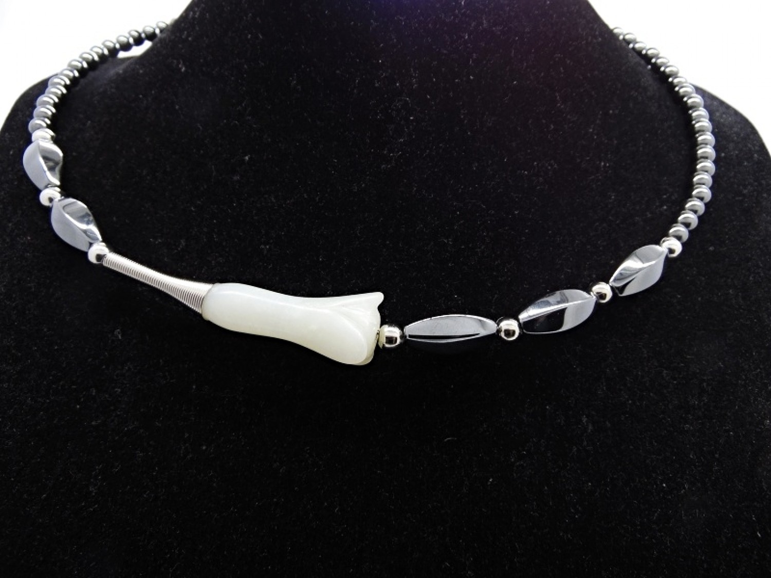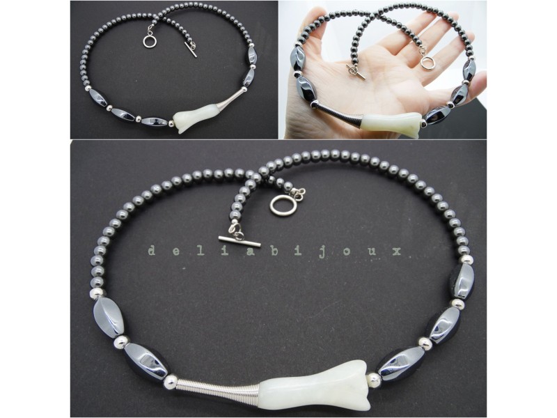 Colier statement, la baza gatului, realizat din jad floare (45 mm lungime, 18 mm latime), sfere hematit (6 mm), hematit fatetat oval (20 mm x 9 mm), bile otel inoxidabil (6 mm, 3 mm), elemente metalice. Inchidere tip toggle din otel inoxidabil. Lungimea desfasurata - 51 cm.
