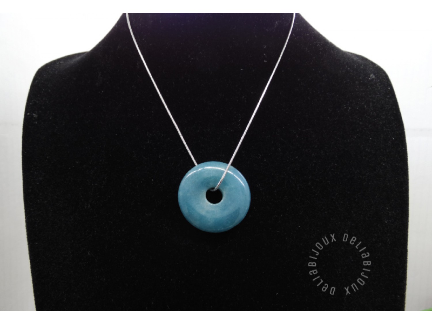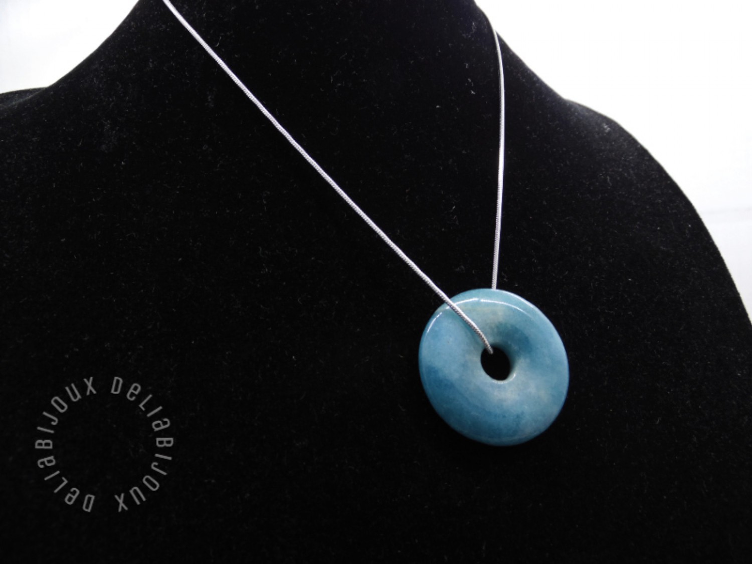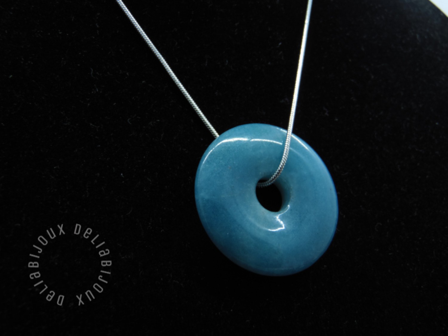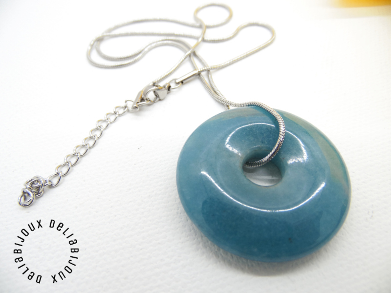 Pandantivul este un angelit donut, o piatră semiprețioasă delicată și frumoasă. Angelitul este cunoscut pentru nuanța sa plină de pace și calm, care amintește de albastrul cerului senin. Forma sa rotundă, de tip donut, adaugă un element distinctiv și atrăgător colierului si un strop subtil de culoare și strălucire oricărei ținute.
