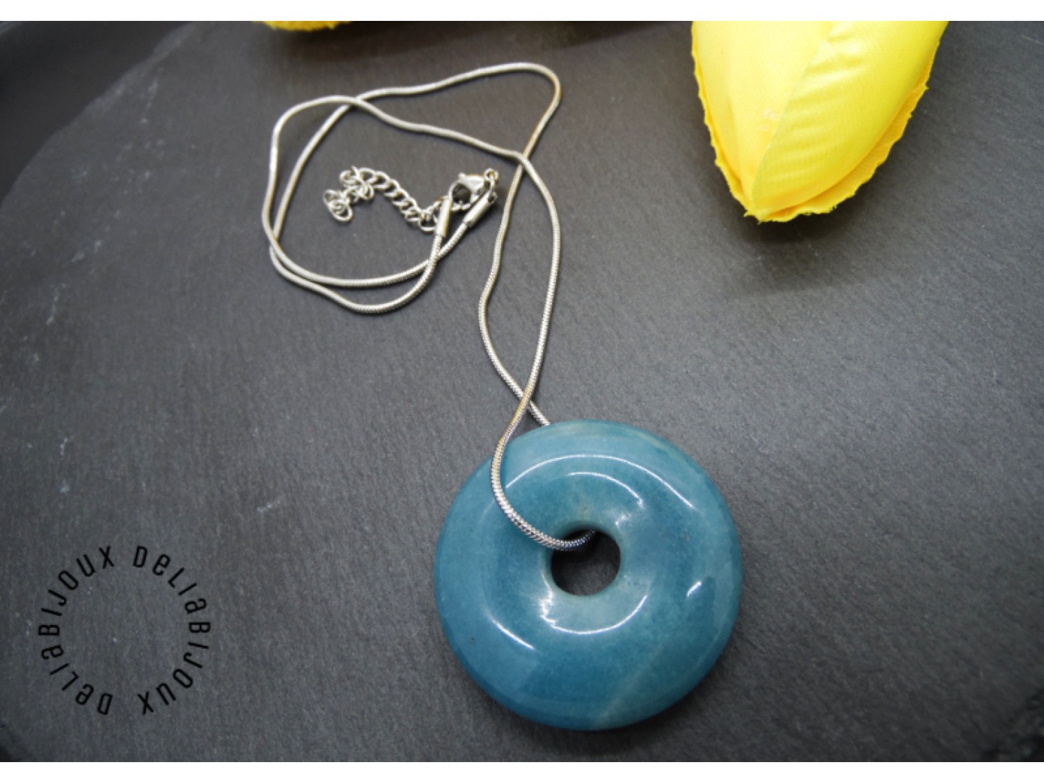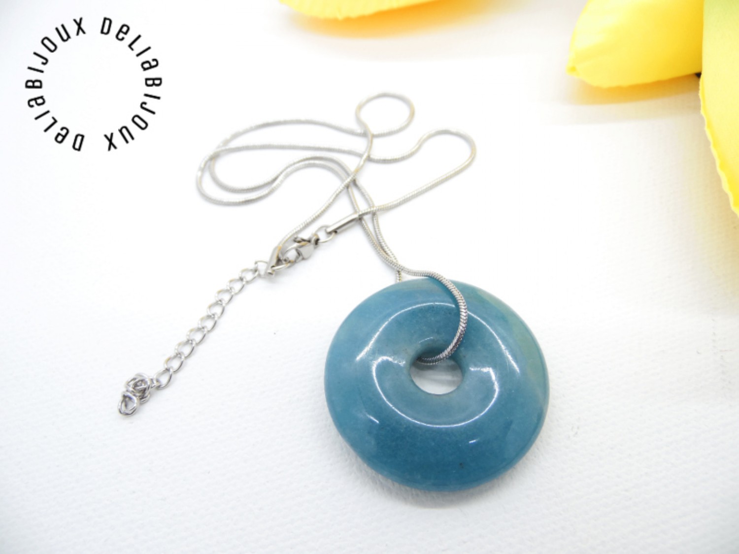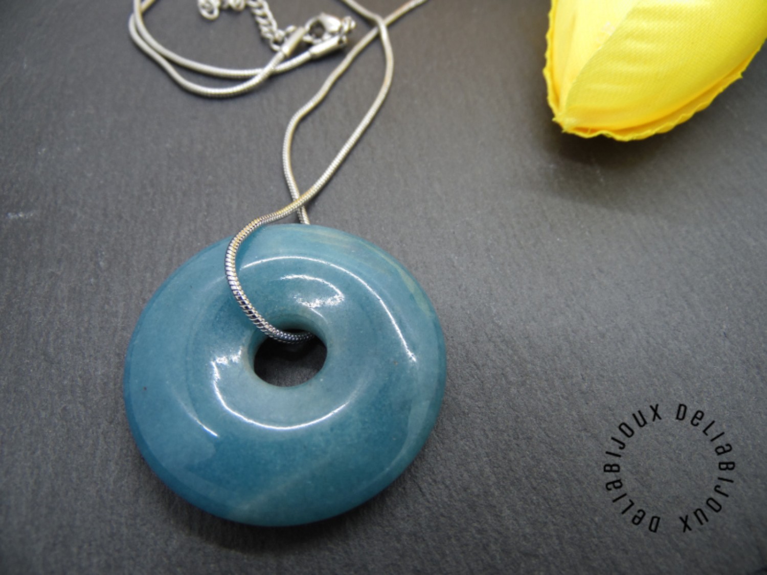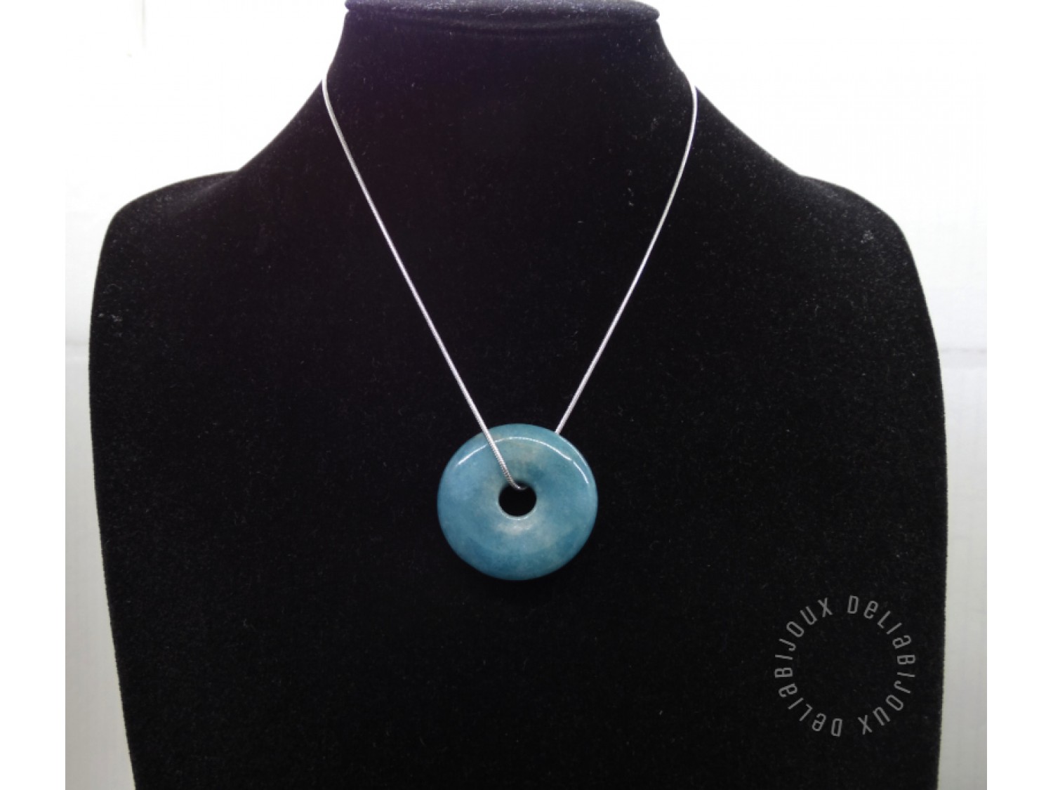 Pandantivul este un angelit donut, o piatră semiprețioasă delicată și frumoasă. Angelitul este cunoscut pentru nuanța sa plină de pace și calm, care amintește de albastrul cerului senin. Forma sa rotundă, de tip donut, adaugă un element distinctiv și atrăgător colierului si un strop subtil de culoare și strălucire oricărei ținute.