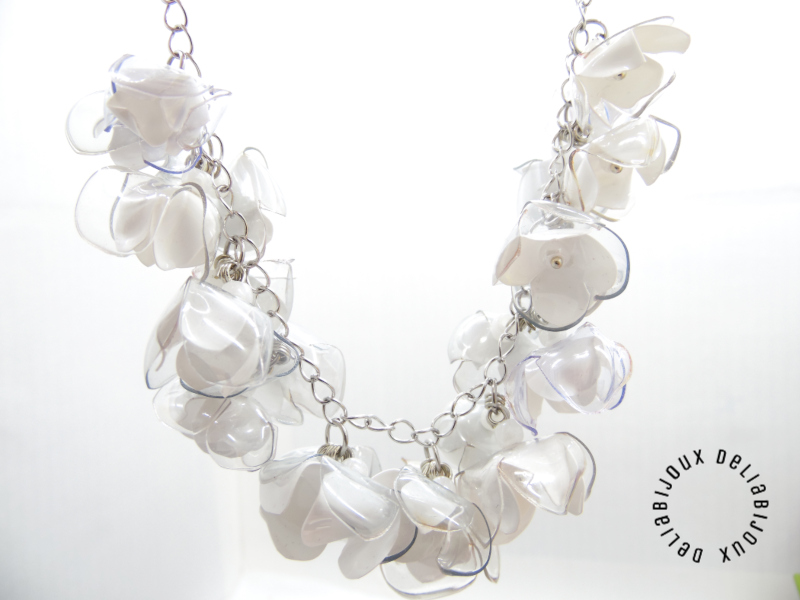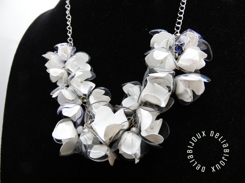 Acest colier statement unic este o adevărată operă de artă sustenabilă, creat din dragoste pentru natură și design original. Fiecare floare albă este realizată manual din sticle de plastic reciclate si caserole de plastic albe, oferindu-le o a doua viață sub forma unui accesoriu spectaculos. Detaliile delicate sunt accentuate cu mărgele de nisip albe, care adaugă un plus de rafinament și strălucire subtilă.