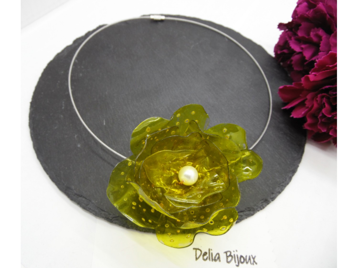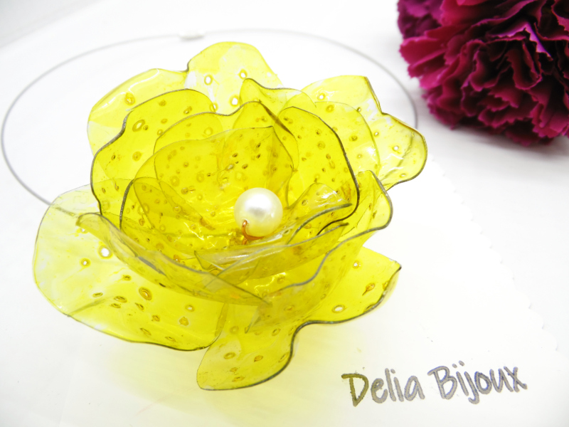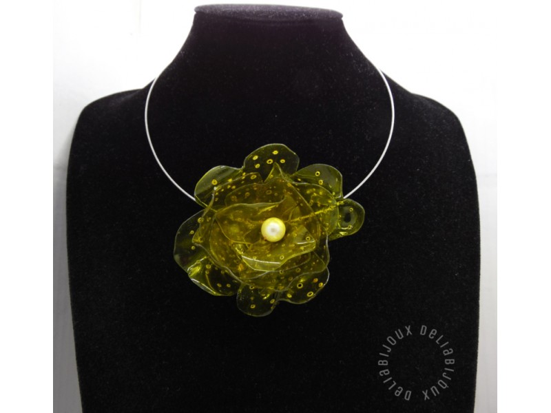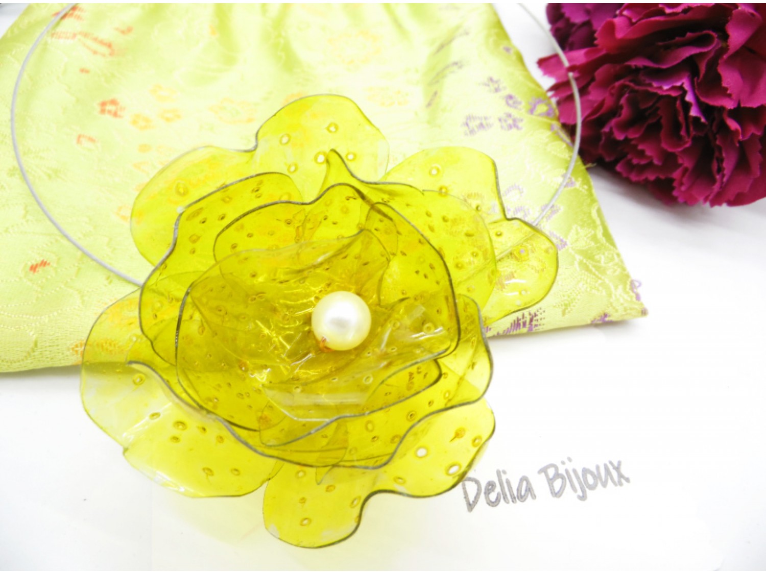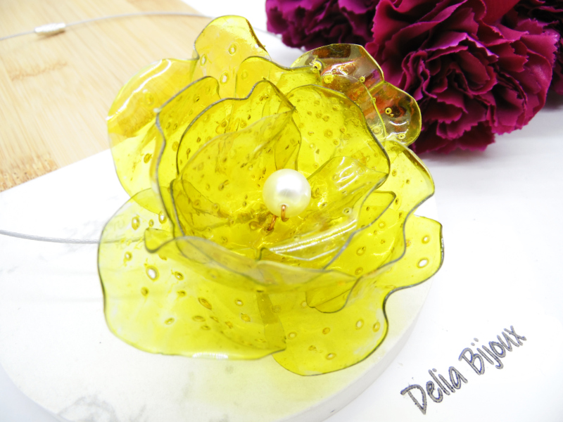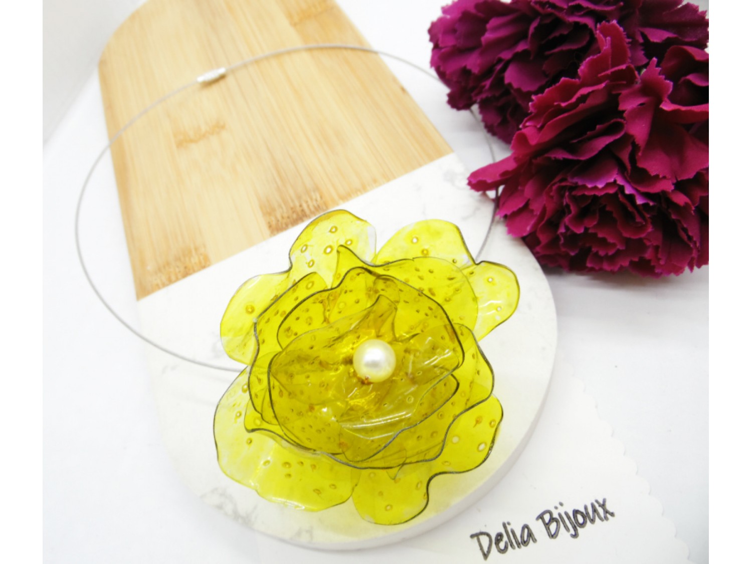 Colier statement, handmade, realizat din plastic reciclat (pet-uri decupate manual si modelate in diverse forme - diametrul florii ~ 7 cm, inaltimea - 3.5 cm), perla de sticla (10 mm), sarma de modelaj cupru non-tarnish (nu oxideaza, nu se pateaza si nu isi pierde aspectul initial), baza colier siliconata rigida (isi pastreaza forma; diametru: 14.5 cm; grosime : 1mm) cu inchizatoare cu filet si elemente metalice.