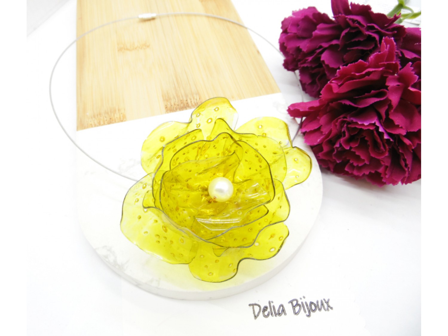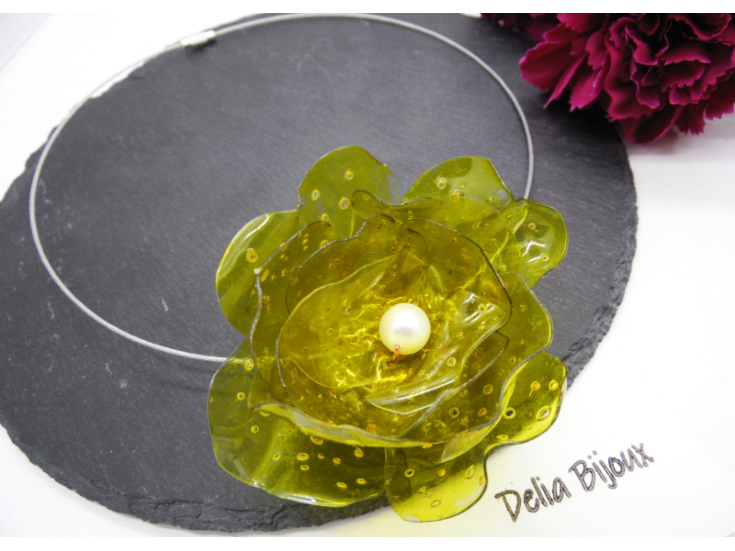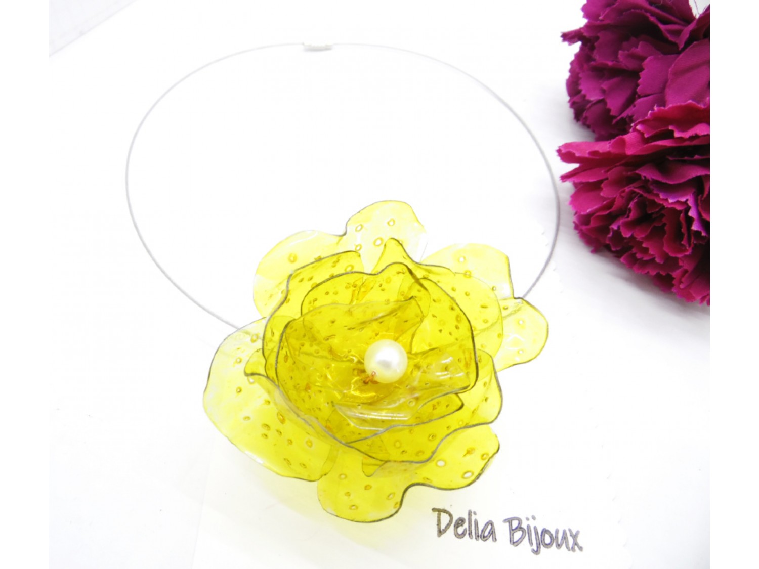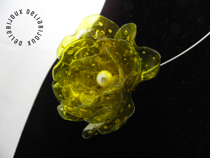 Colier statement, handmade, realizat din plastic reciclat (pet-uri decupate manual si modelate in diverse forme - diametrul florii ~ 7 cm, inaltimea - 3.5 cm), perla de sticla (10 mm), sarma de modelaj cupru non-tarnish (nu oxideaza, nu se pateaza si nu isi pierde aspectul initial), baza colier siliconata rigida (isi pastreaza forma; diametru: 14.5 cm; grosime : 1mm) cu inchizatoare cu filet si elemente metalice.