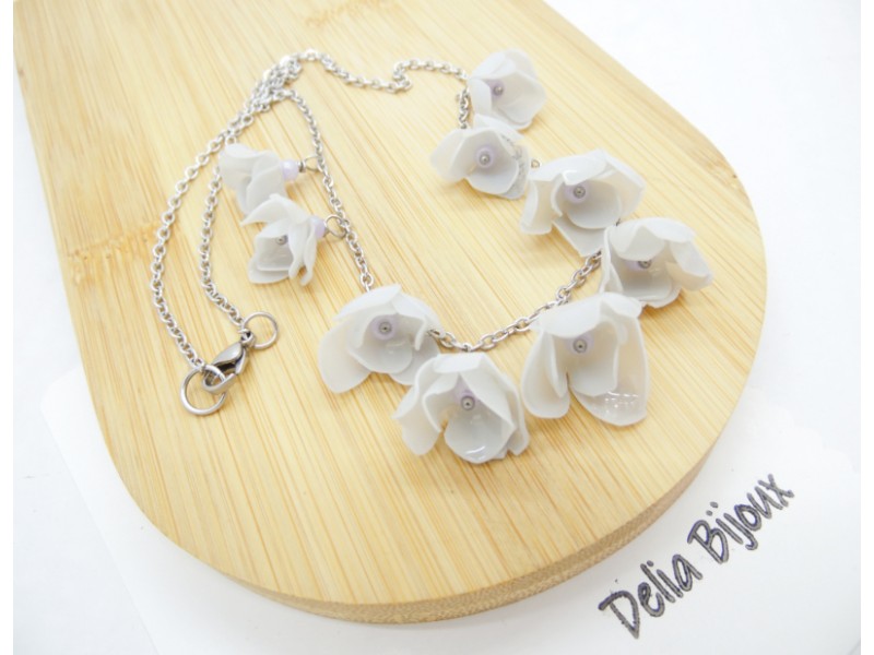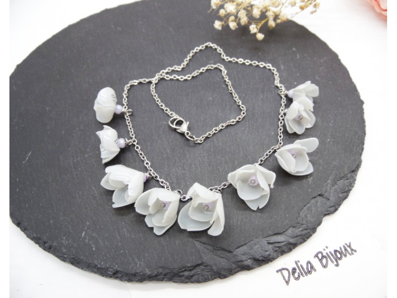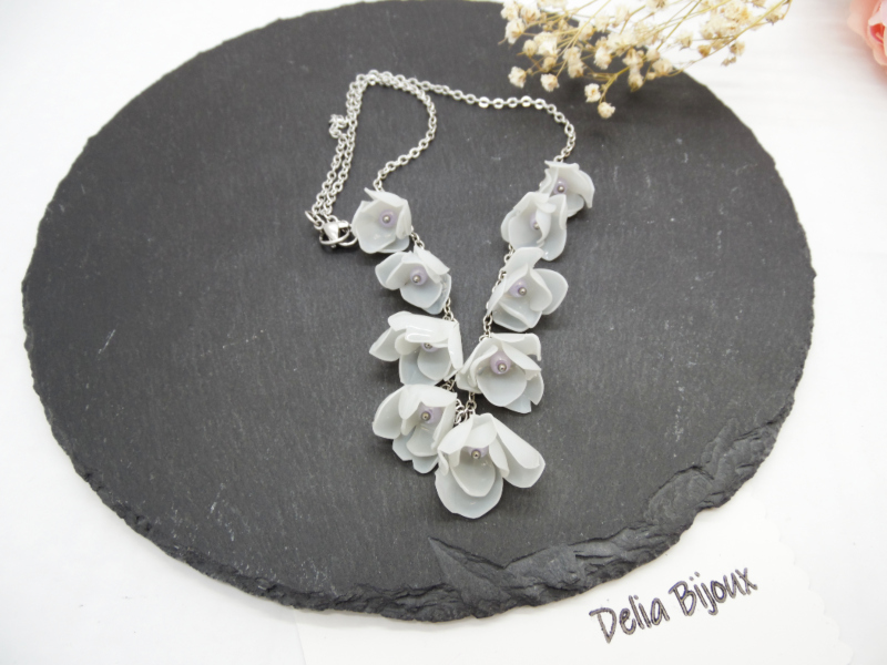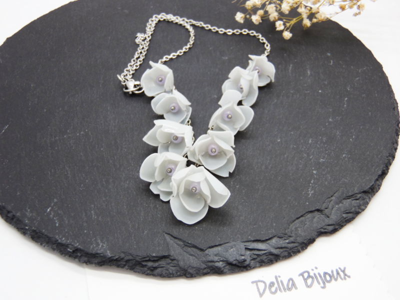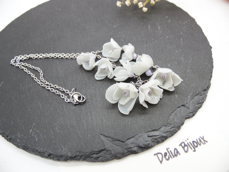 Florile, în nuanțe rafinate de alb-murdar cu tente de gri deschis, sunt modelate cu atenție pentru a imita estetica naturală a petalelor, oferind piesei un aer romantic și contemporan. Fiecare floare este completată discret de margelute de nisip lila, ce adaugă un accent subtil de culoare și un plus de feminitate.