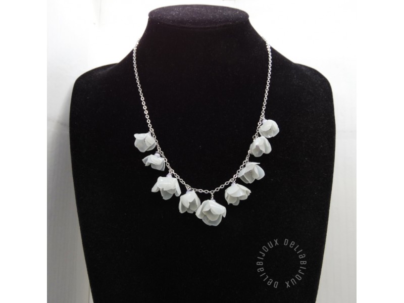 Acest colier este compus dintr-un lanț de inox, rezistent la oxidare și uzură, pe care sunt suspendate multiple flori delicate, confecționate din sticle de plastic reciclate.