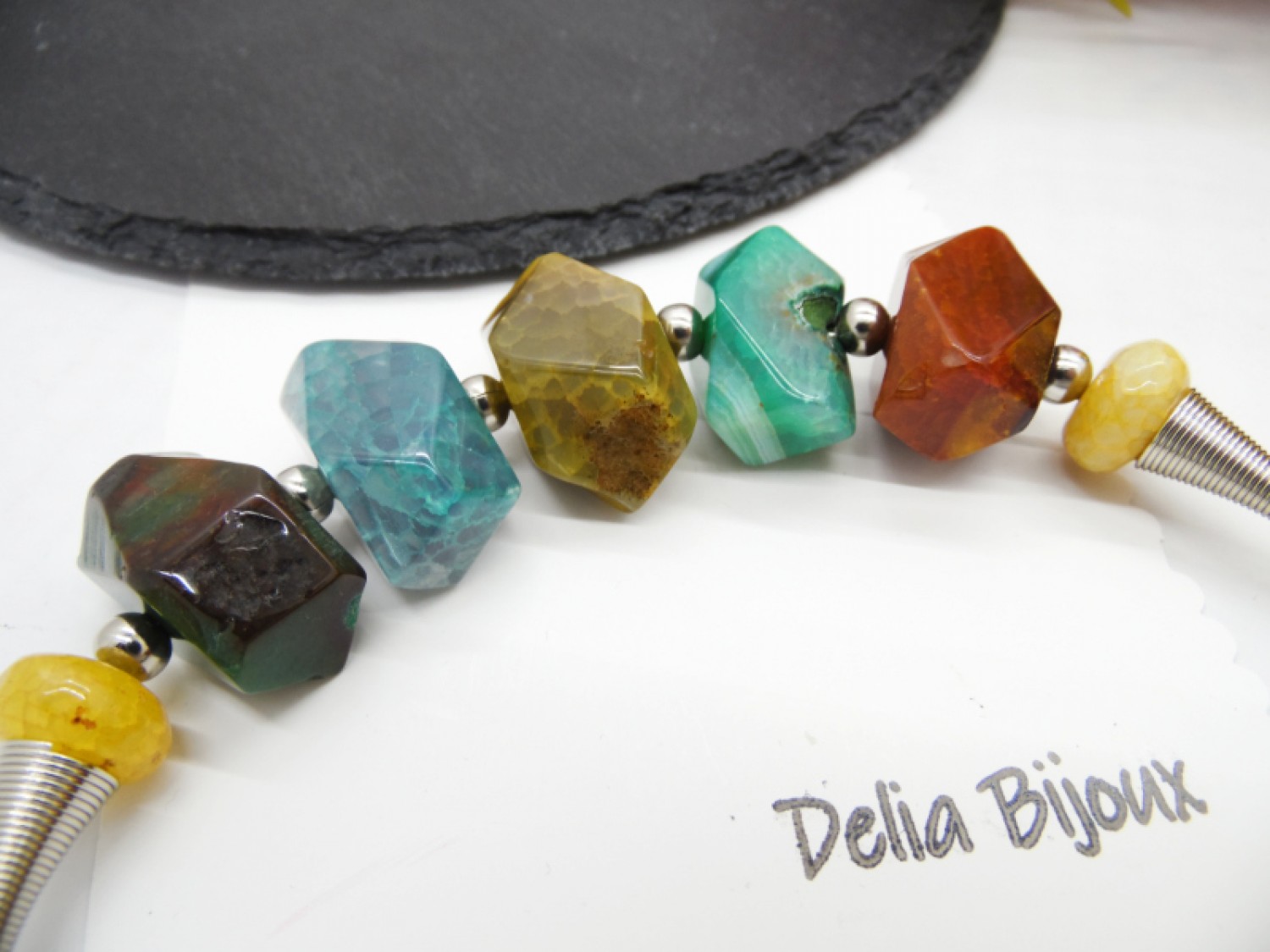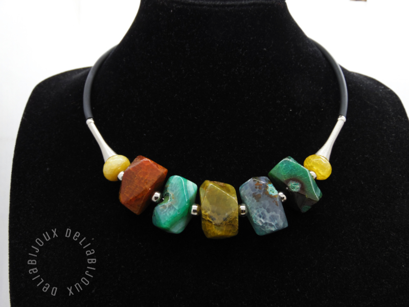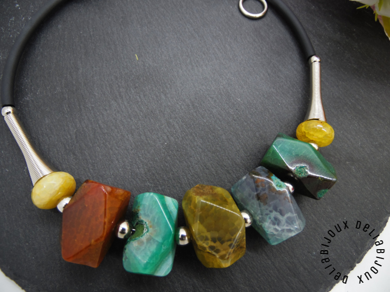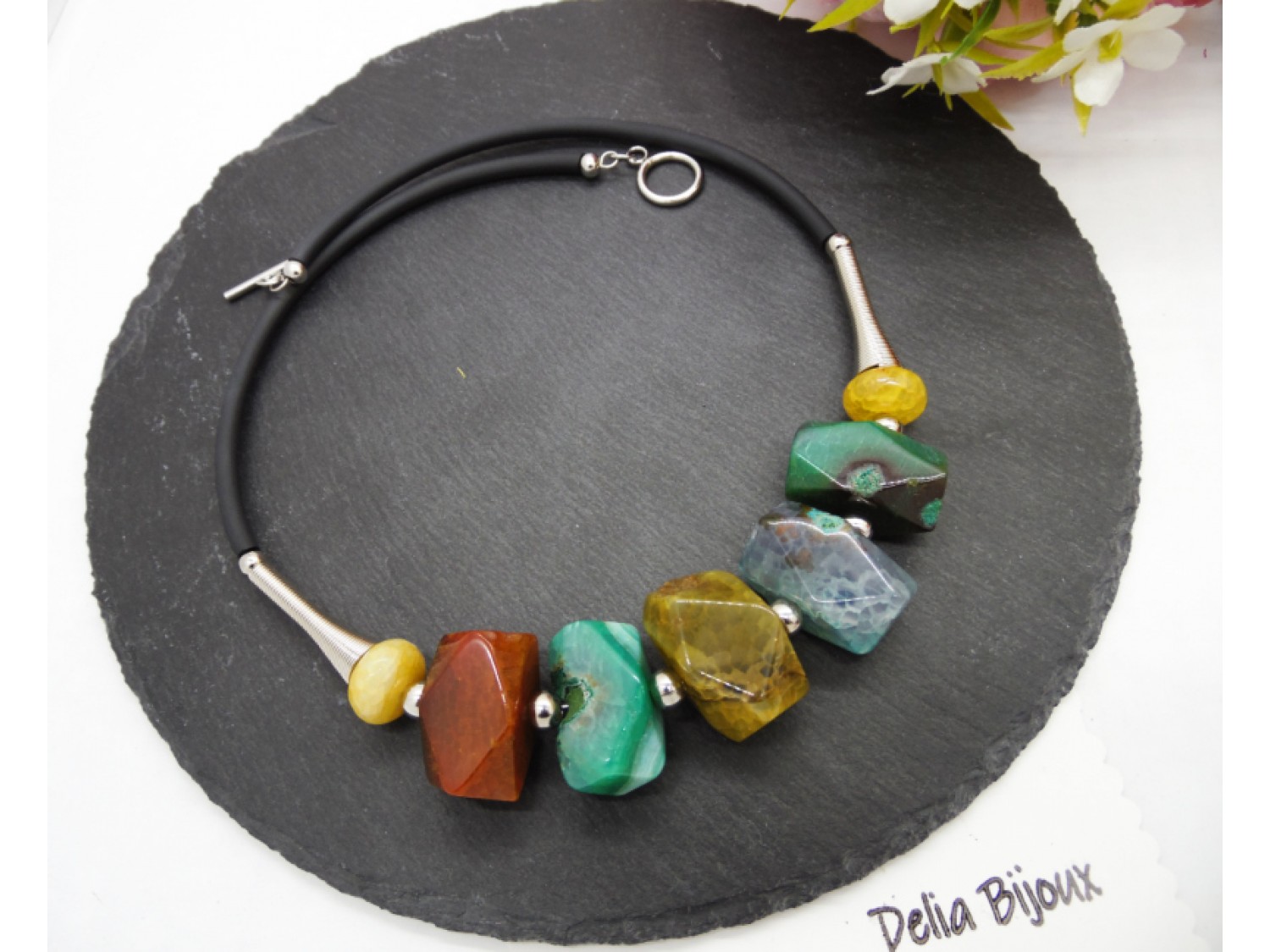 Este un accesoriu unic și impresionant, perfect pentru orice ținută elegantă sau casual. Dacă doriți să adăugați un element distinctiv ținutelor dumneavoastră, acest colier handmade statement cu agate naturale multicolore este o alegere excelentă!