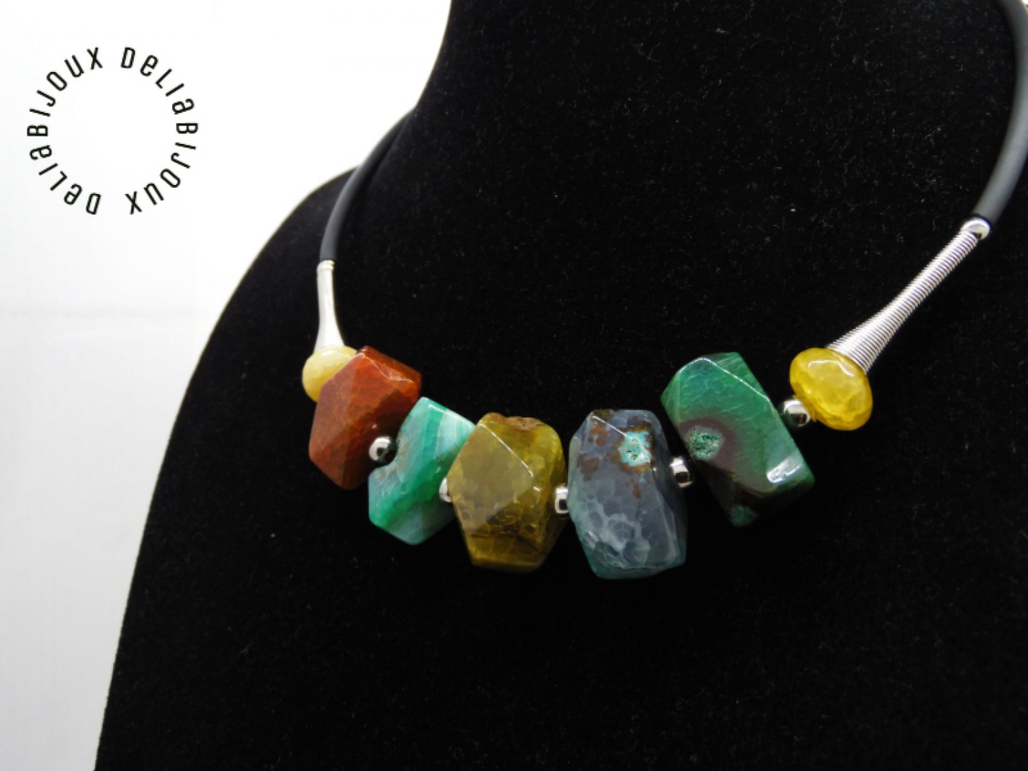 Acest colier statement handmade este o piesă unicat, o bijuterie elegantă și sofisticată, realizată din agate naturale multicolore. Fiecare piatră are o culoare unica, creand astfel un efect vizual impresionant si este selectată în mod atent pentru a se potrivi cu celelalte, iar aspectul final este impresionant.
