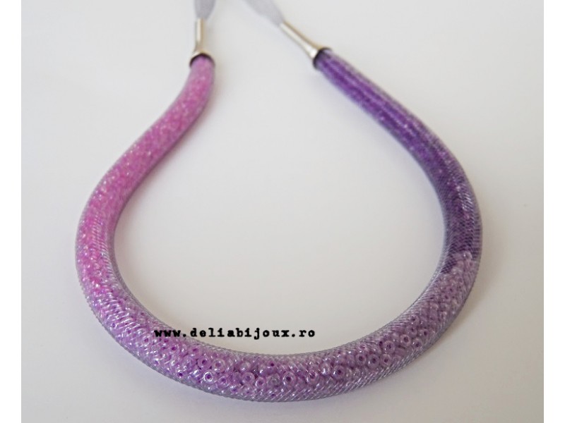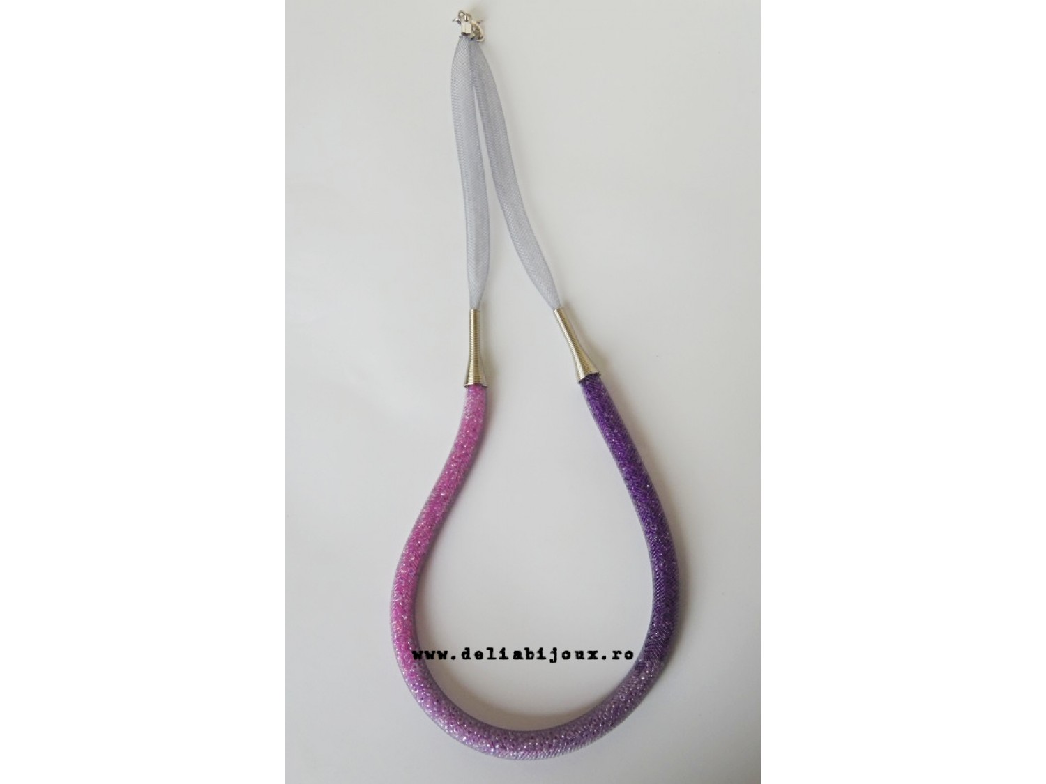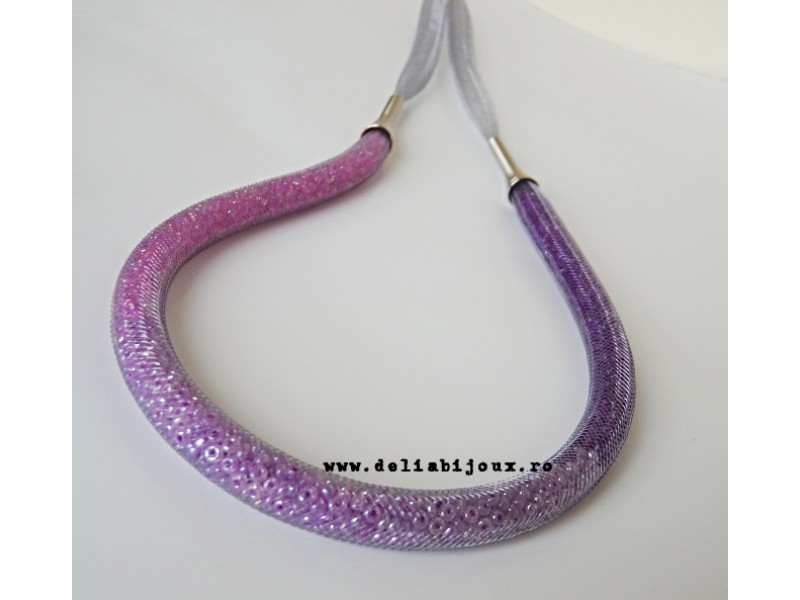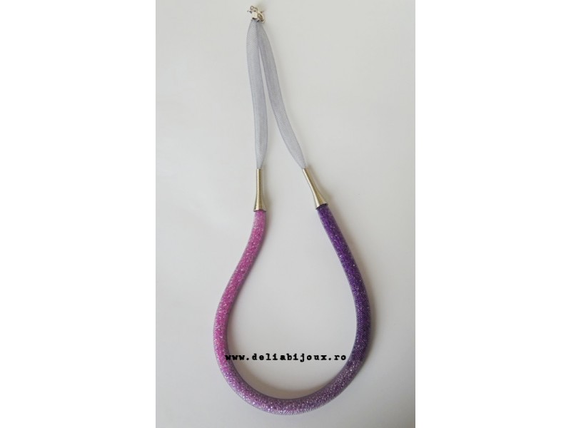 Colier realizat din snur de plastic tubular (8 mm, gri), margele de nisip (2 mm) si elemente metalice argintii. Inchidere tip lobster.