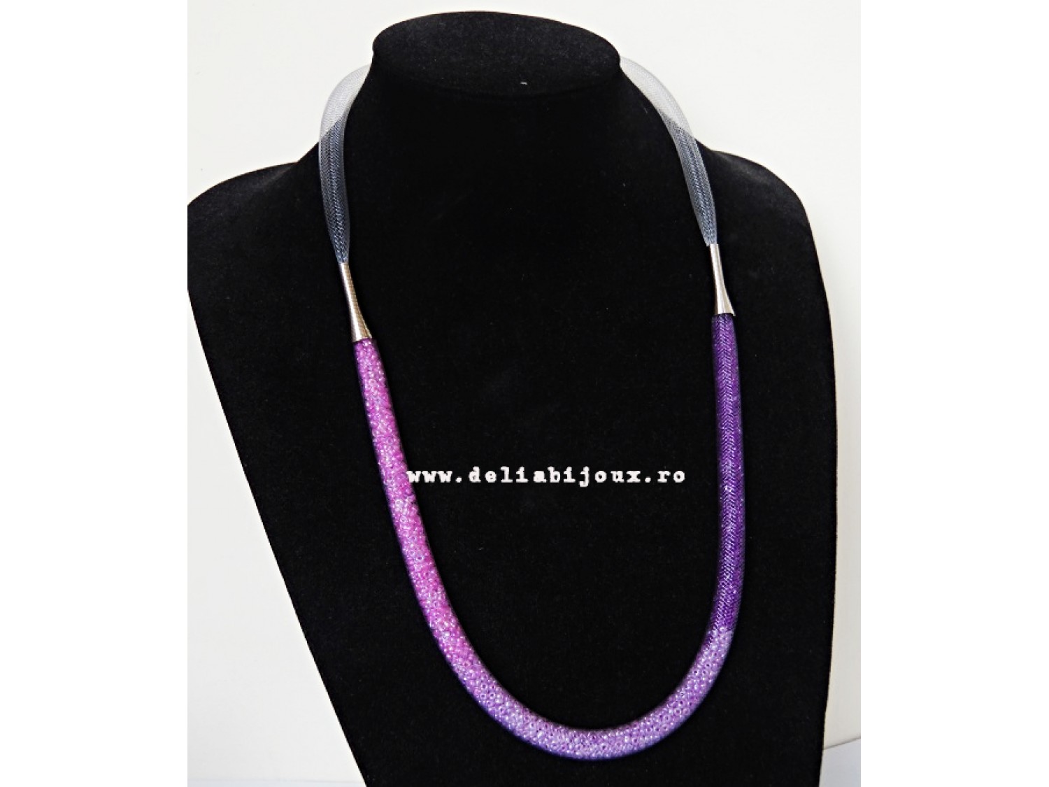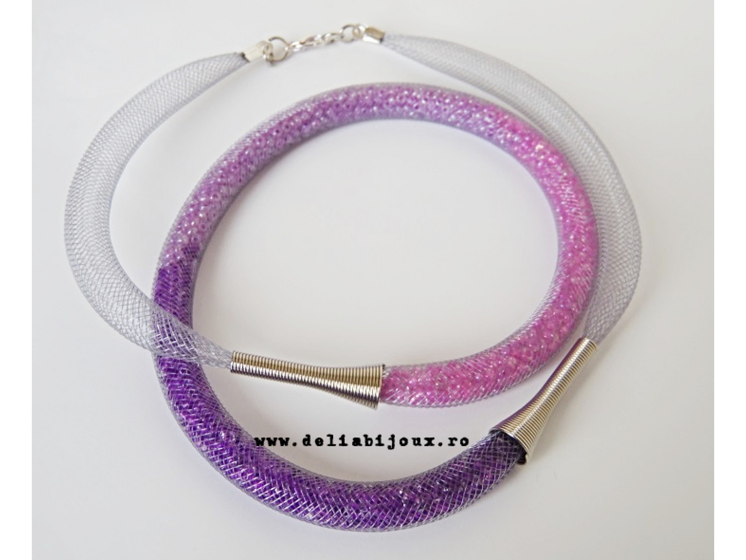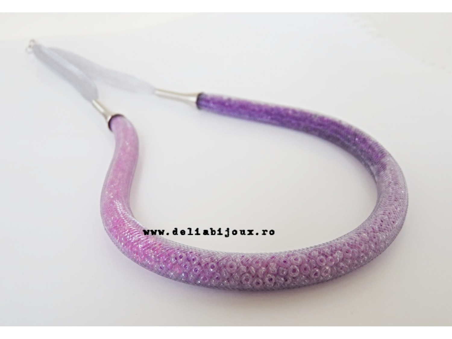 Colier realizat din snur de plastic tubular (8 mm, gri), margele de nisip (2 mm) si elemente metalice argintii. Inchidere tip lobster.