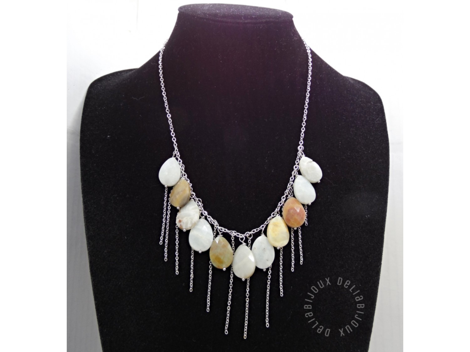 Un colier elegant și expresiv, realizat manual din pietre naturale de amazonit atent selecționate, în nuanțe delicate de alb, crem, verde pal și accente calde de piersică. Fiecare piatră are forme organice unice, ceea ce transformă colierul într-o piesă irepetabilă.